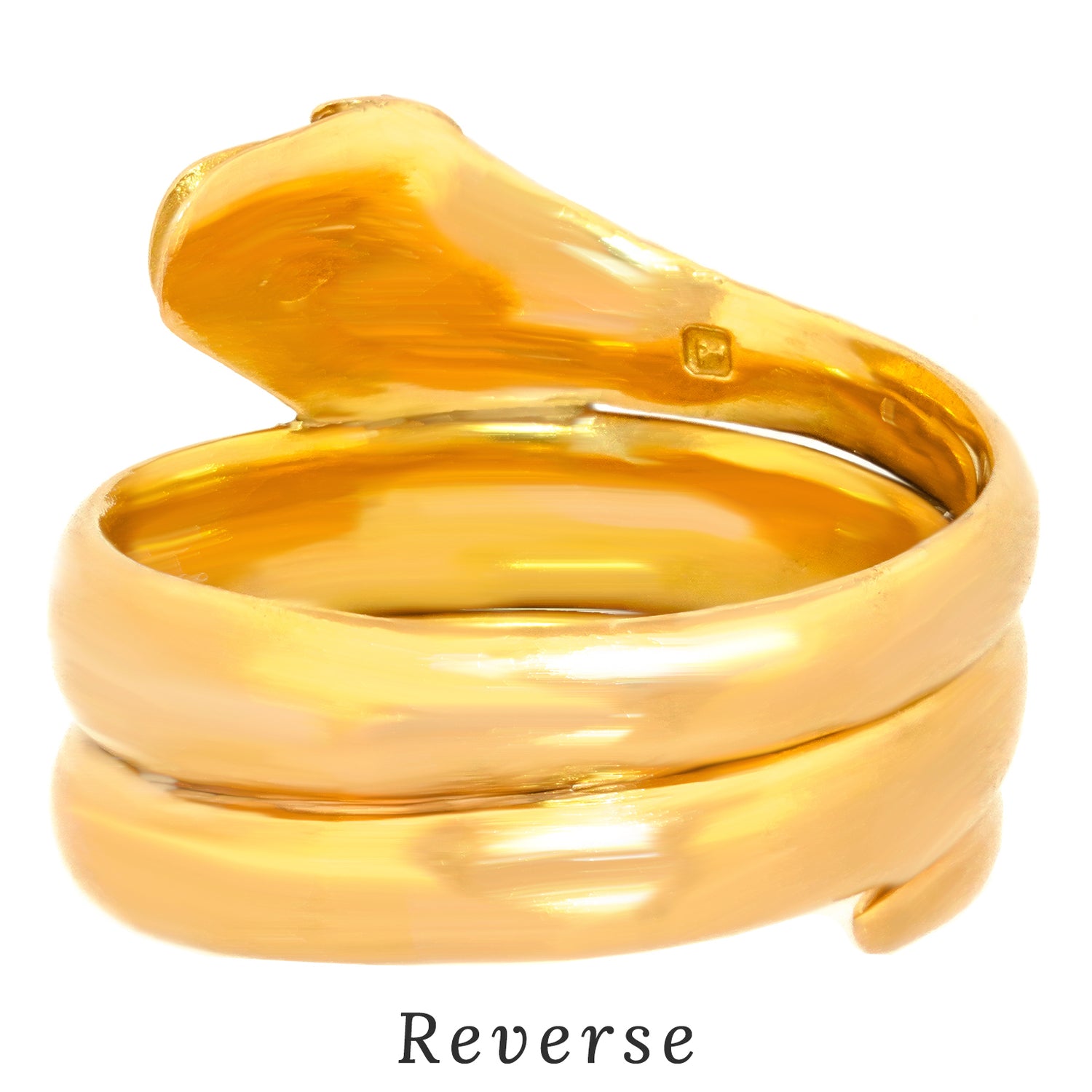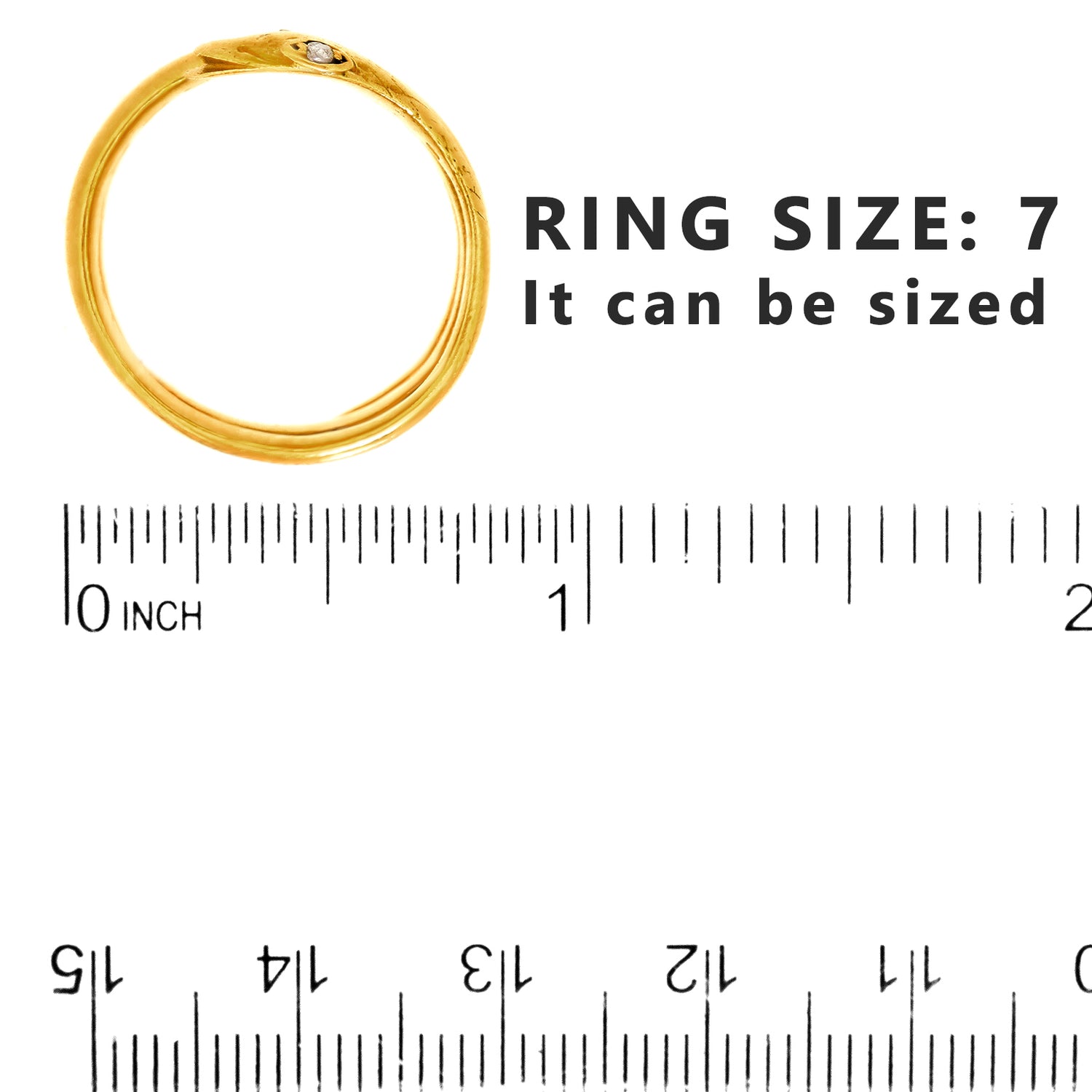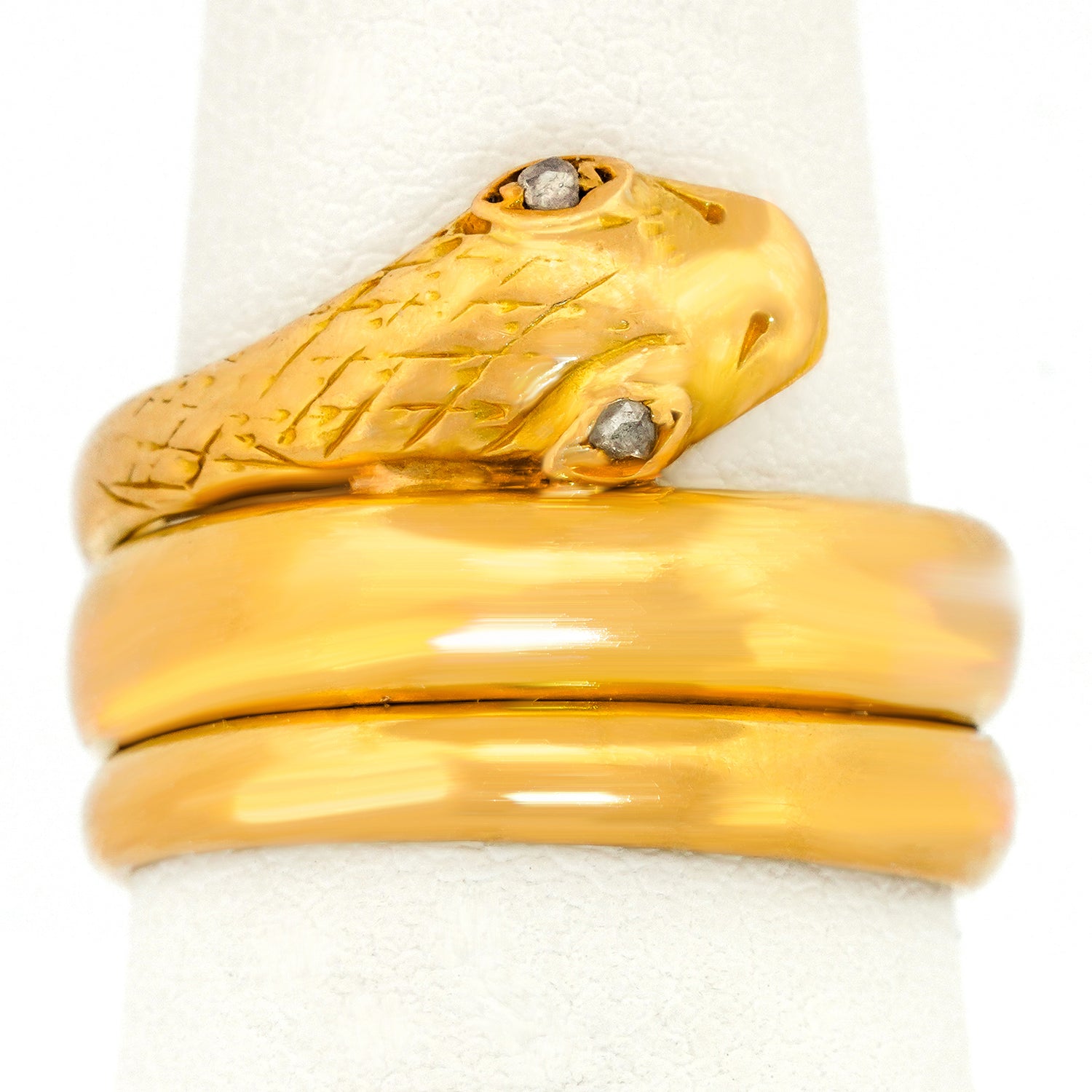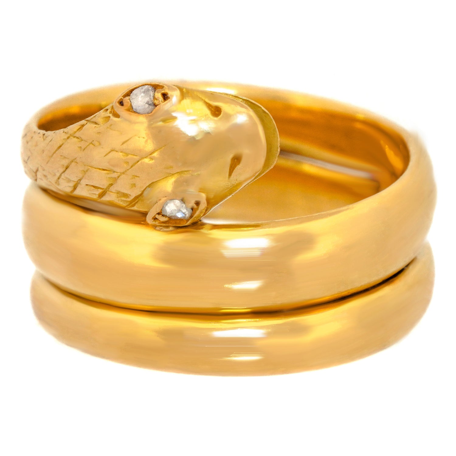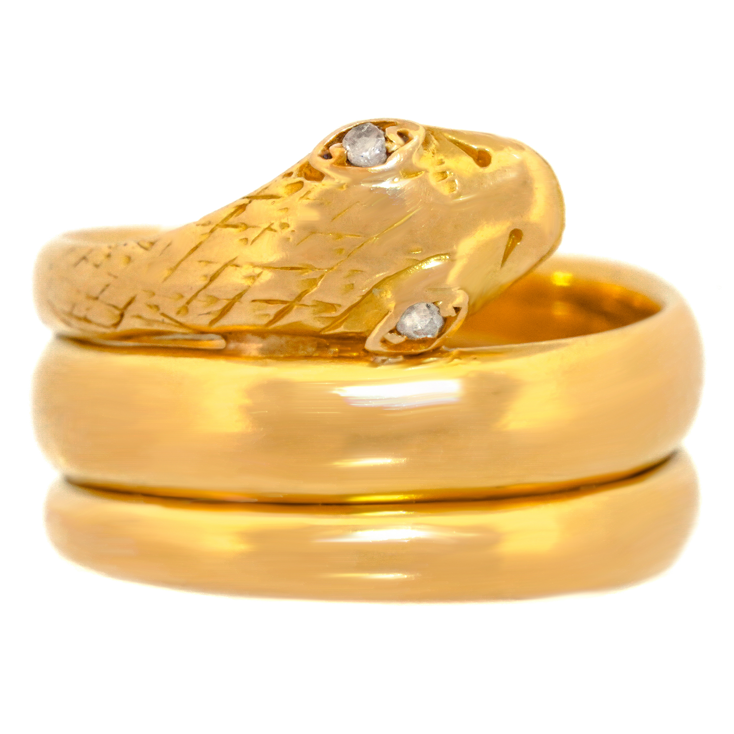 Circa 1873, 18k, England.  Popular for thousands of years, snake rings were especially fashionable in the Victorian period. This particularly profuse example is well made in 18k gold and set with diamonds for eyes. Excellent condition.