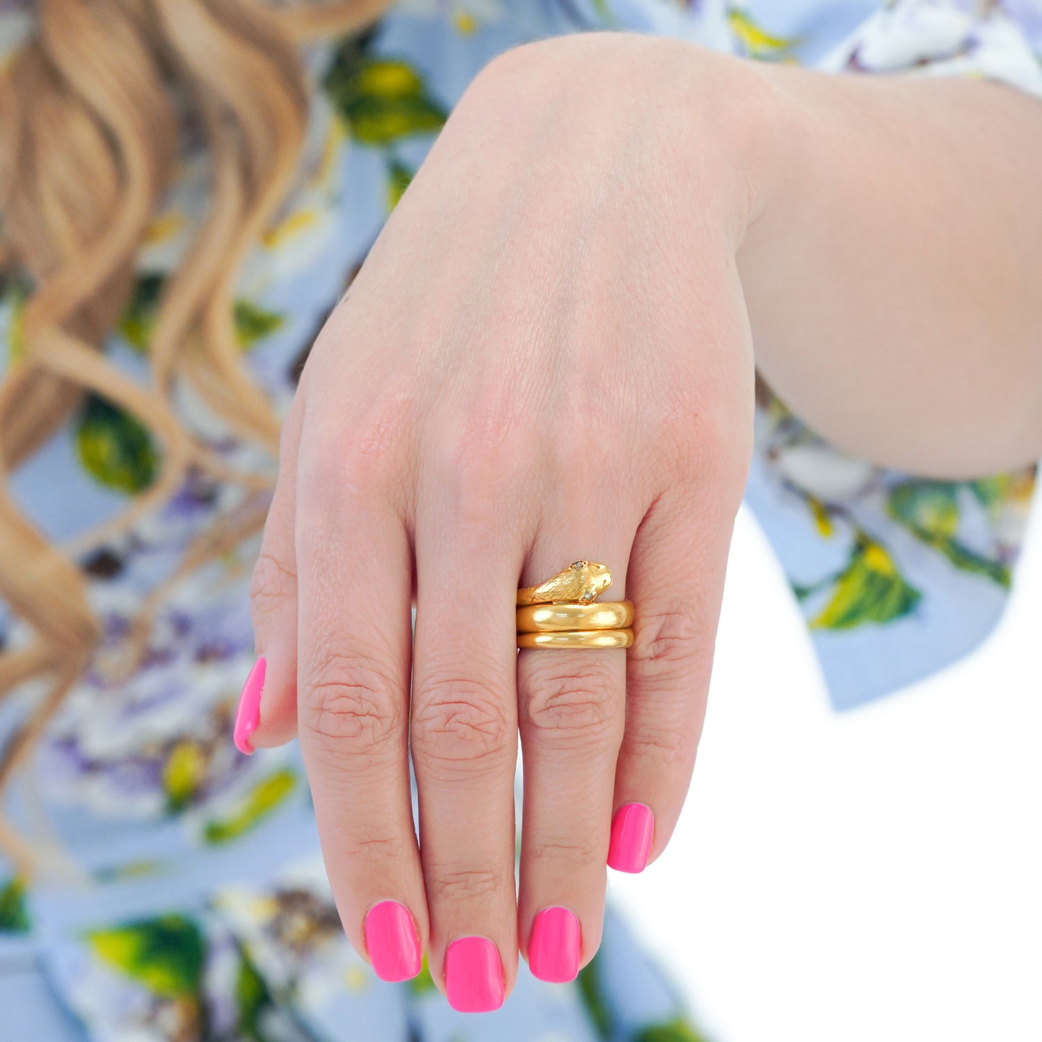 Remarks from Lawrence Jeffrey: "Sleek little serpents have long decorated our fingers and wrists. Though they traditionally represent fidelity and friendship, we love them for their exotic charm."