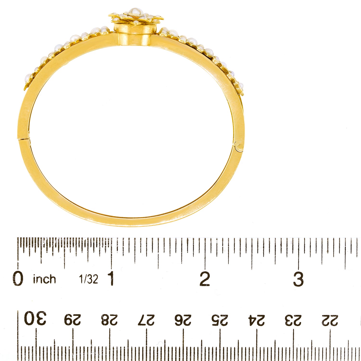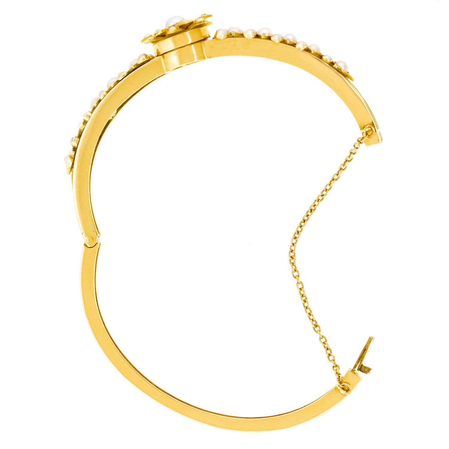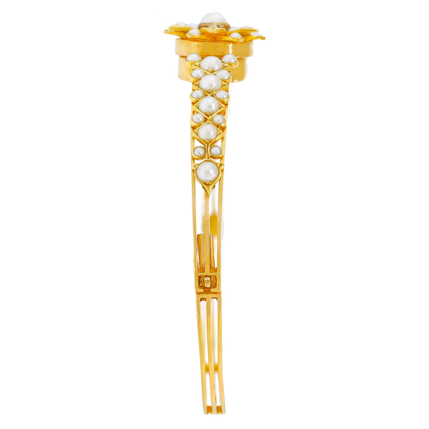 Circa 1870s, 14k. This charming Victorian bracelet is set with delicate natural pearls. Truly a visual confection, the floral element is set with different size pearls set at different heights. The look is breezily Victorian for any era chic. Finely made, this hinged bangle is in excellent condition.