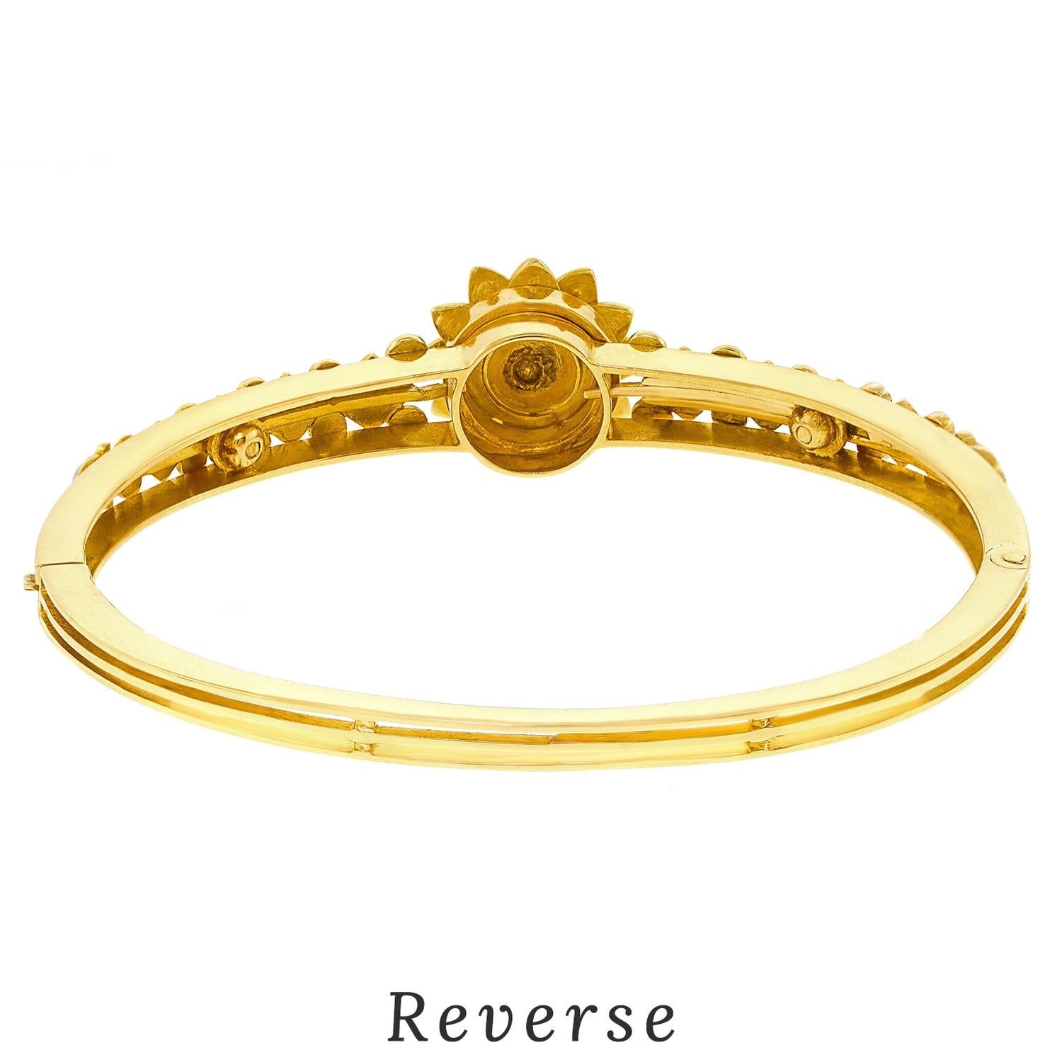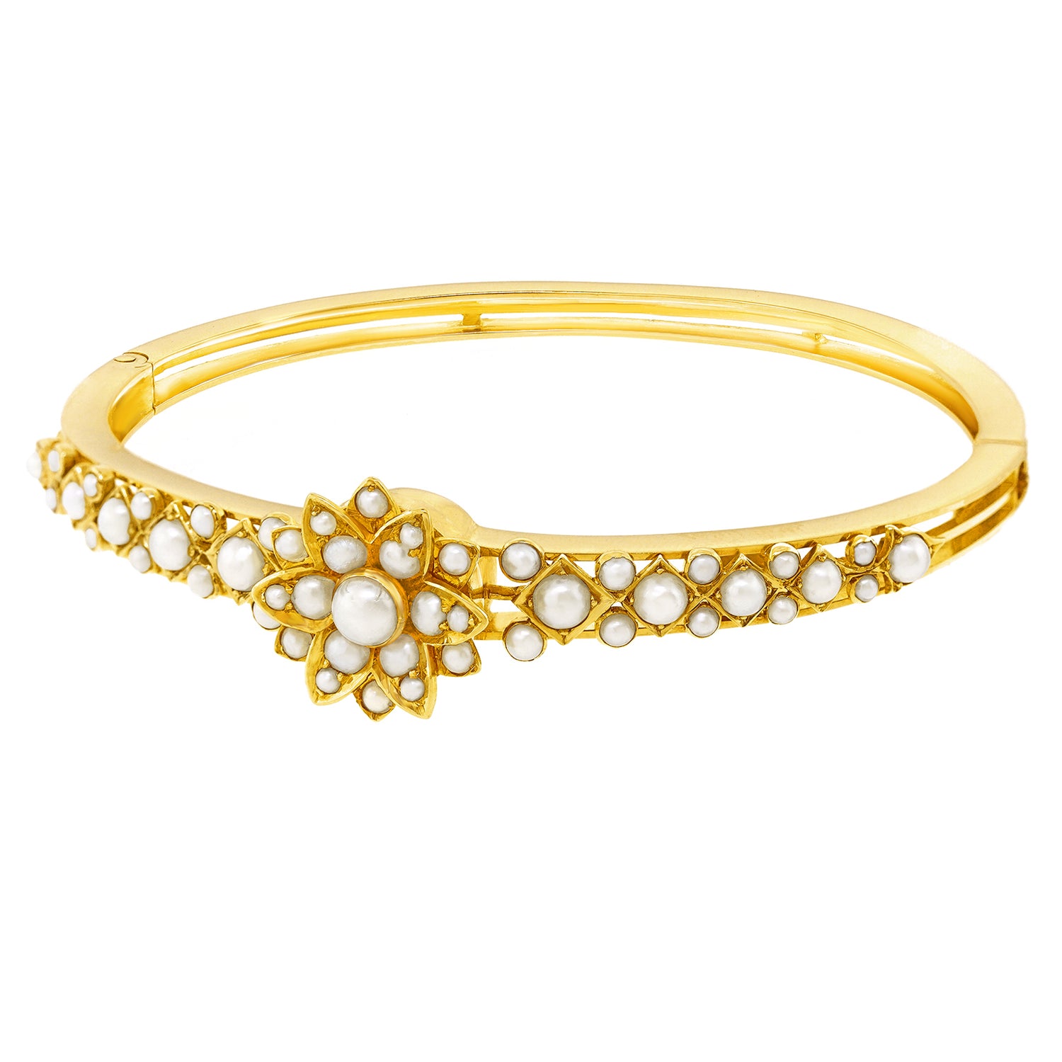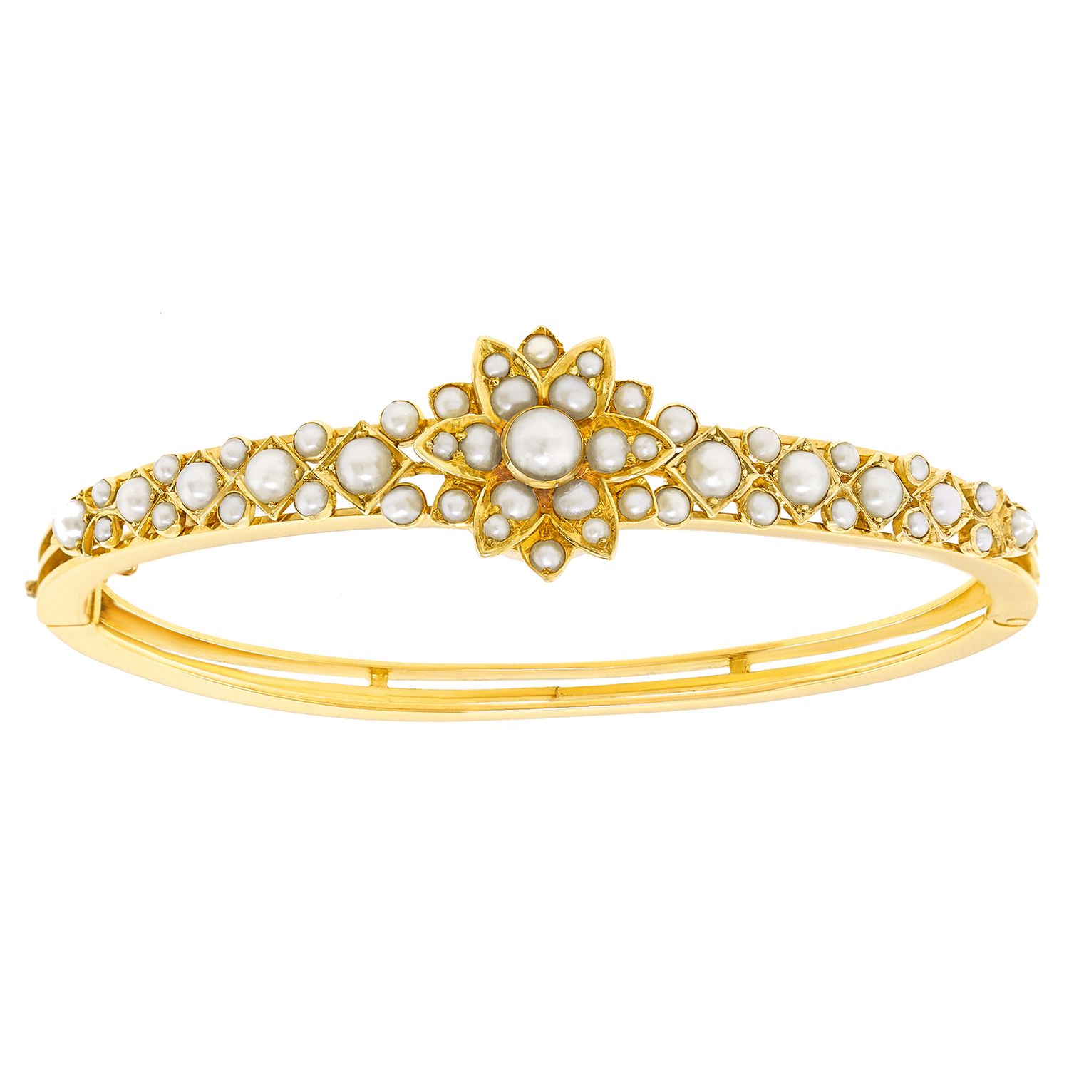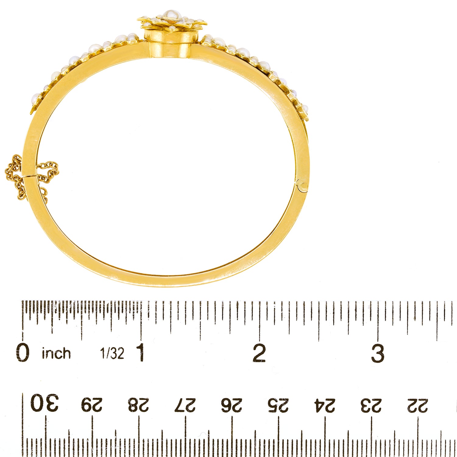 Circa 1870s, 14k. This charming Victorian bracelet is set with delicate natural pearls. Truly a visual confection, the floral element is set with different size pearls set at different heights. The look is breezily Victorian for any era chic. Finely made, this hinged bangle is in excellent condition.