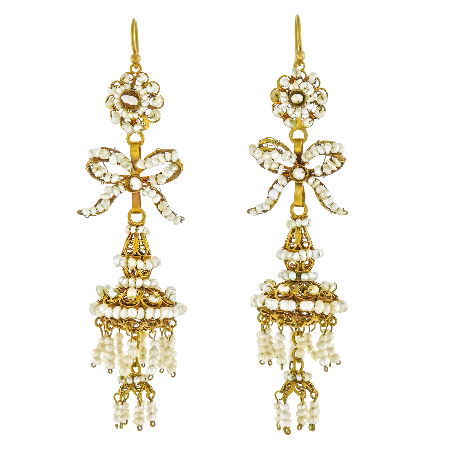 Circa 1870s, 18k, Iberian.  Featuring long elegant lines jazzed with flirty movement, these chandelier earrings are vintage fashion at their antique best. Finely made in 18k gold and festooned with natural pearls, they are perfect hippie chic or ballroom ready!  Excellent condition.