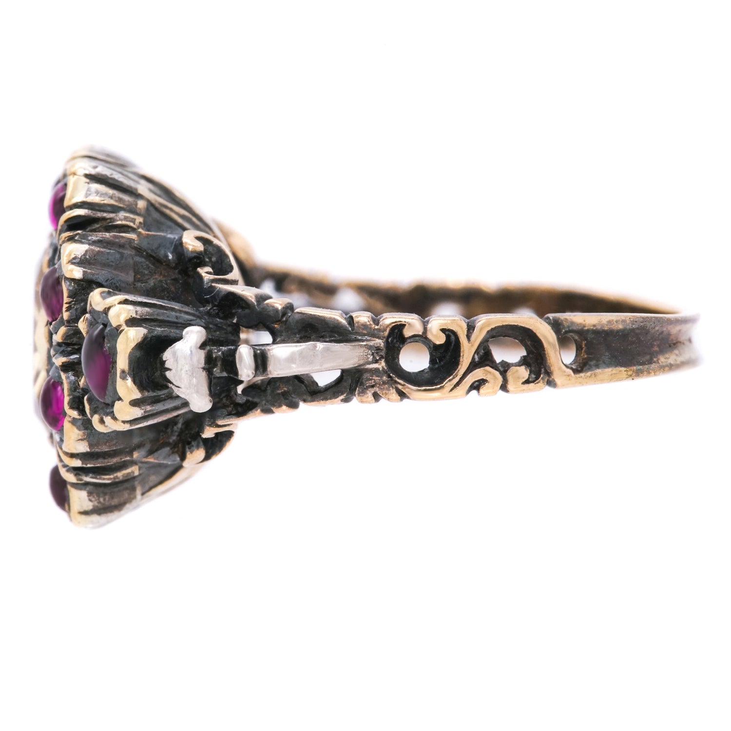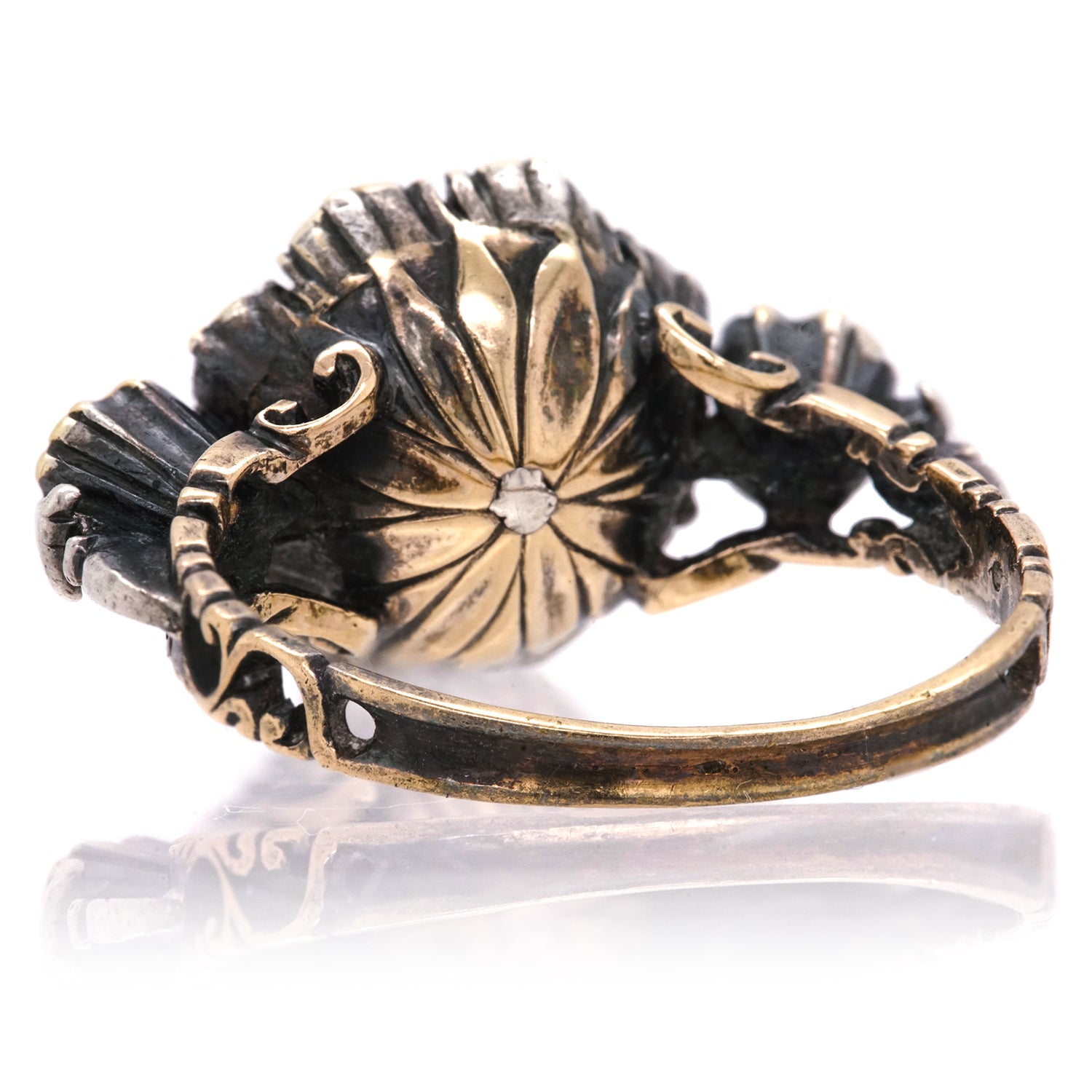 Circa early 1800s, 18k with silver accents, possibly Southern Europe. Redolent of Georgian charm and displaying patina only two centuries can bring, the elegant floral motif of this ring is underscored by sublime details. The look is antique chic at its vintage 200 years old best! Very good condition.