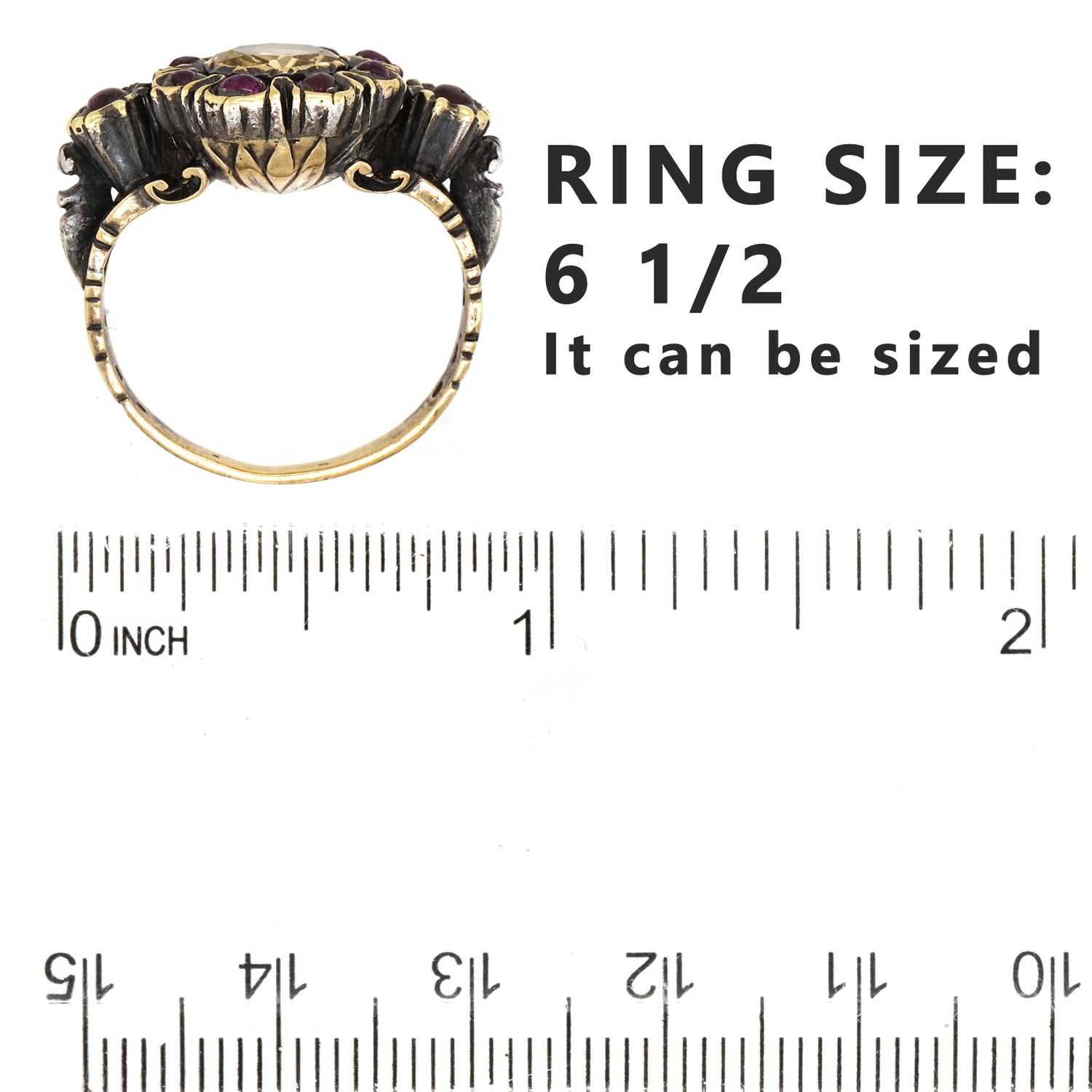 Ring Size: 6 1/2, it can be sized.