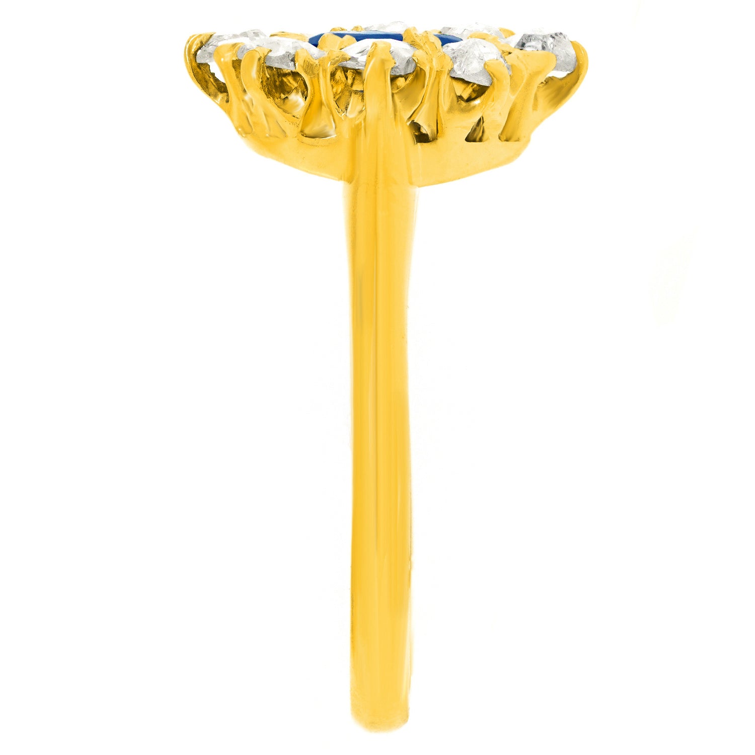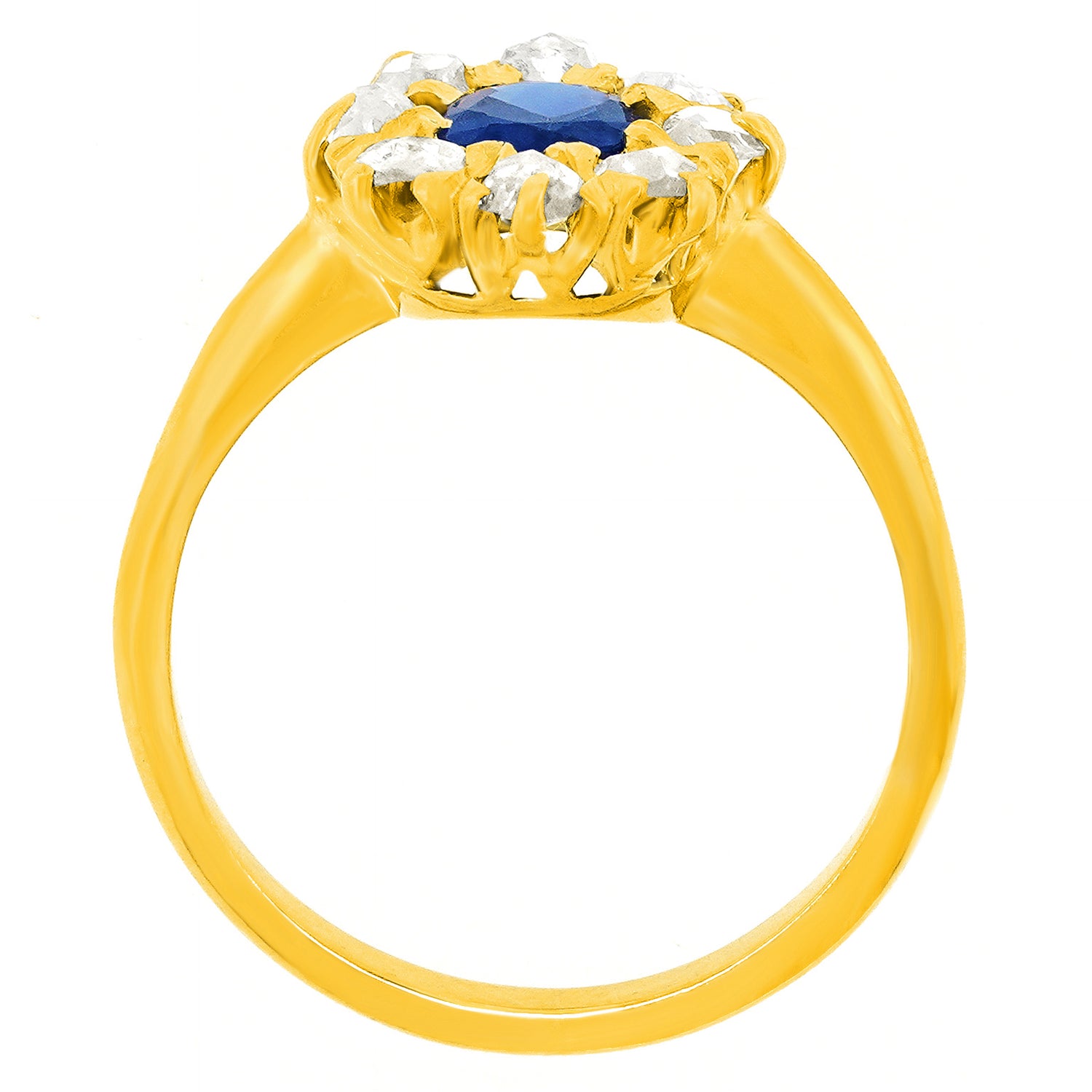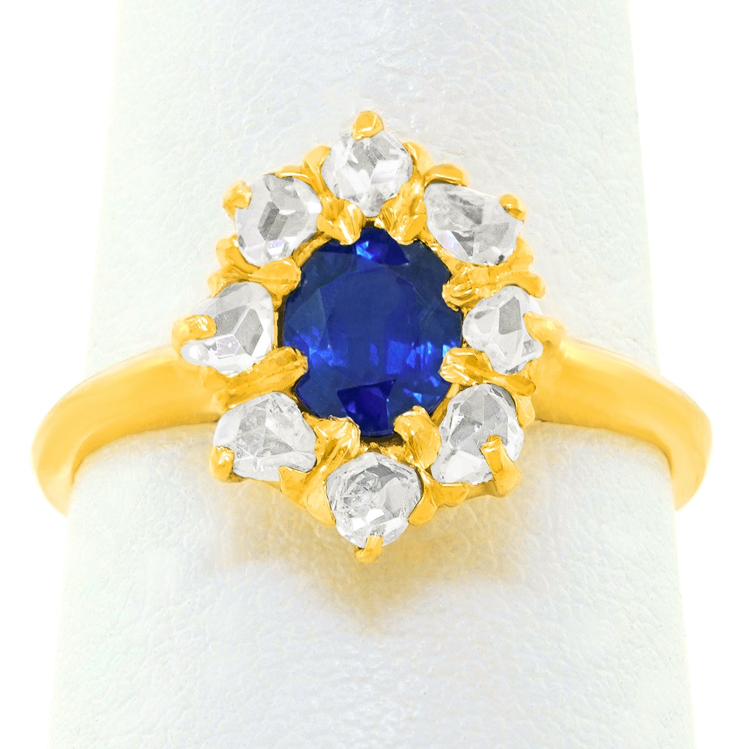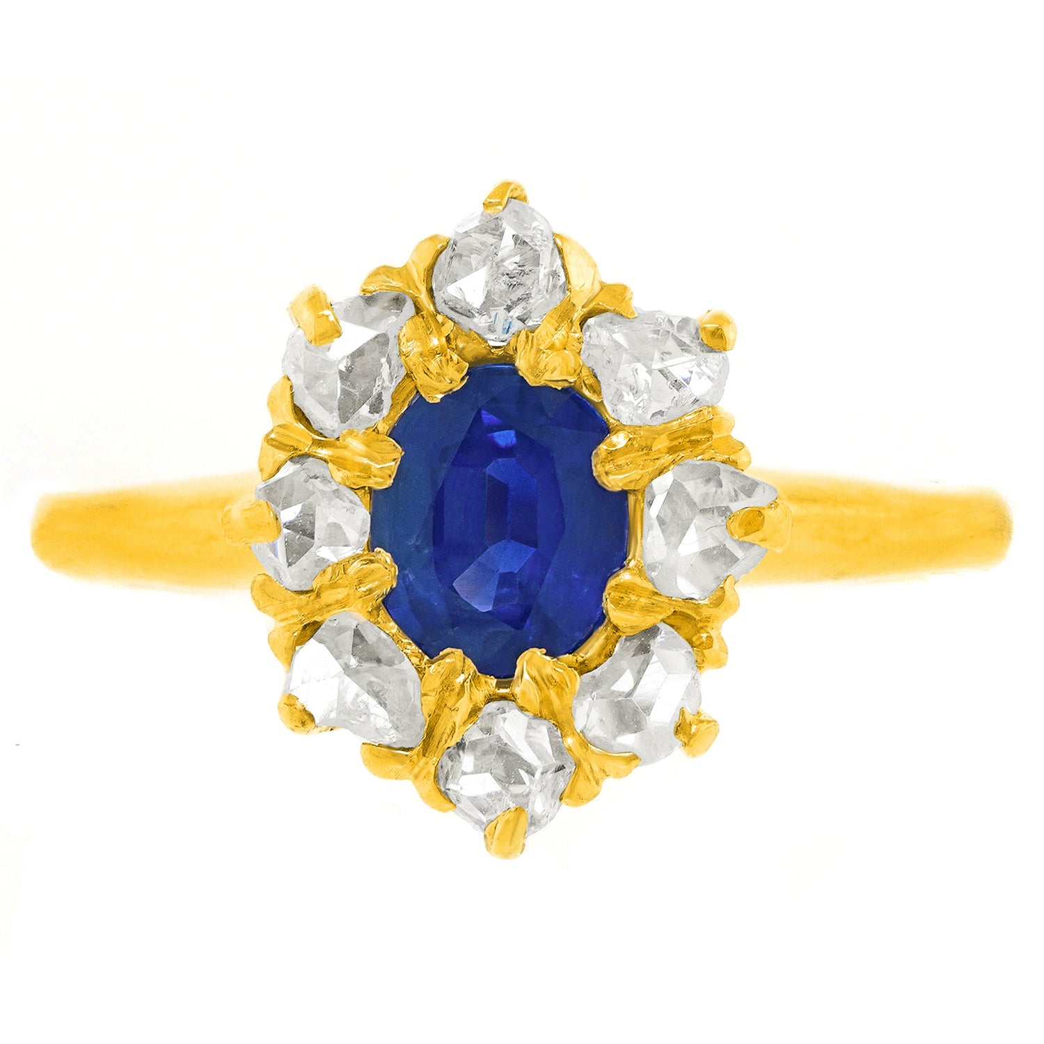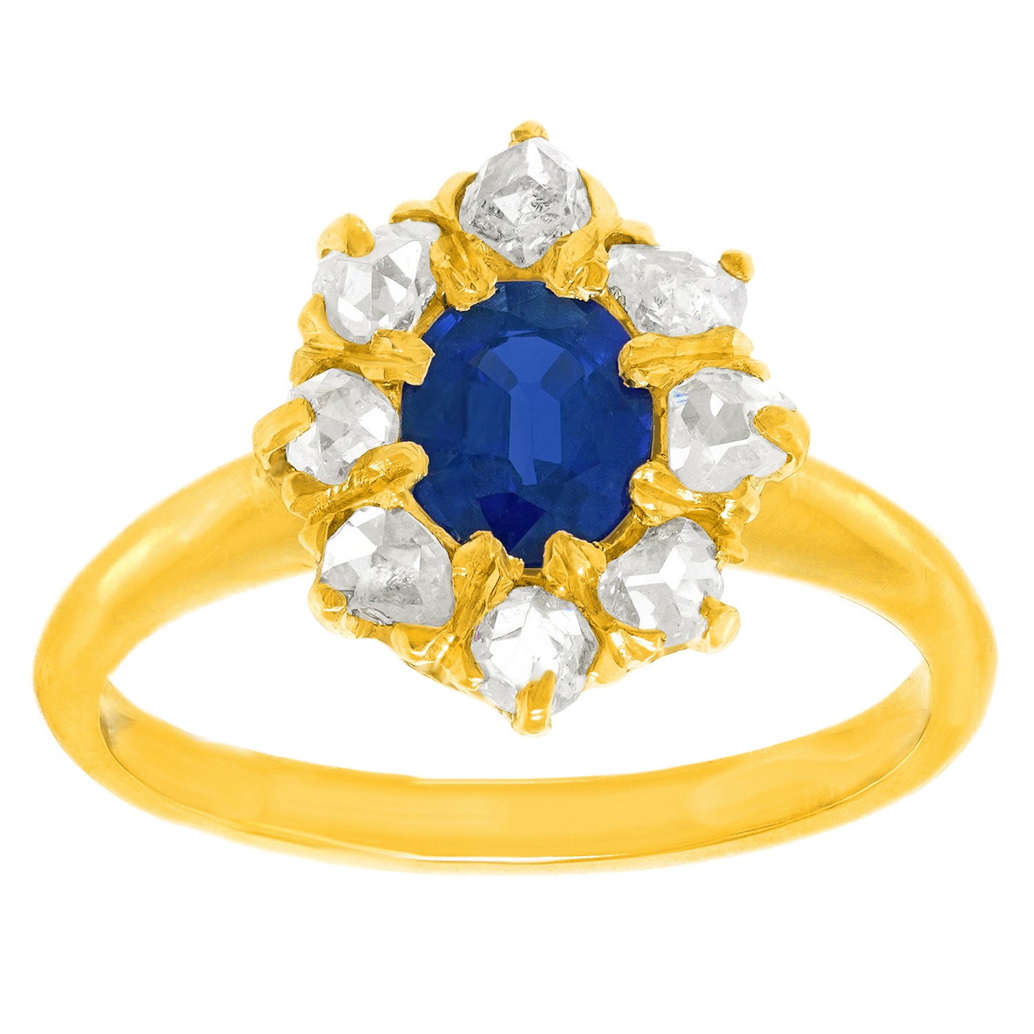 Circa 1920s, 14k, American. From Georgian beauties to Kate Middleton, these lush sapphire and diamond rings have been on the best-dressed list for centuries. This well turned out example features a superb .78-carat lush blue stone surrounded by .40 carats of rose-cut diamonds. The ring is meticulously made in fourteen-karat yellow gold. Excellent condition.