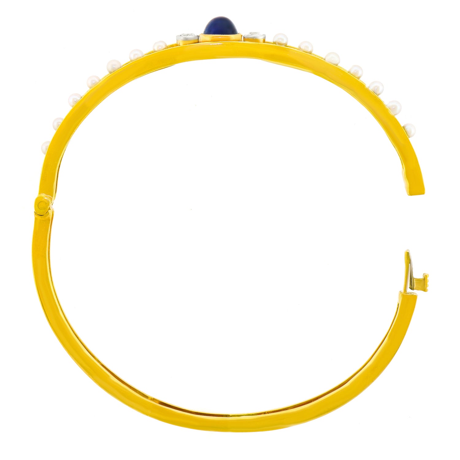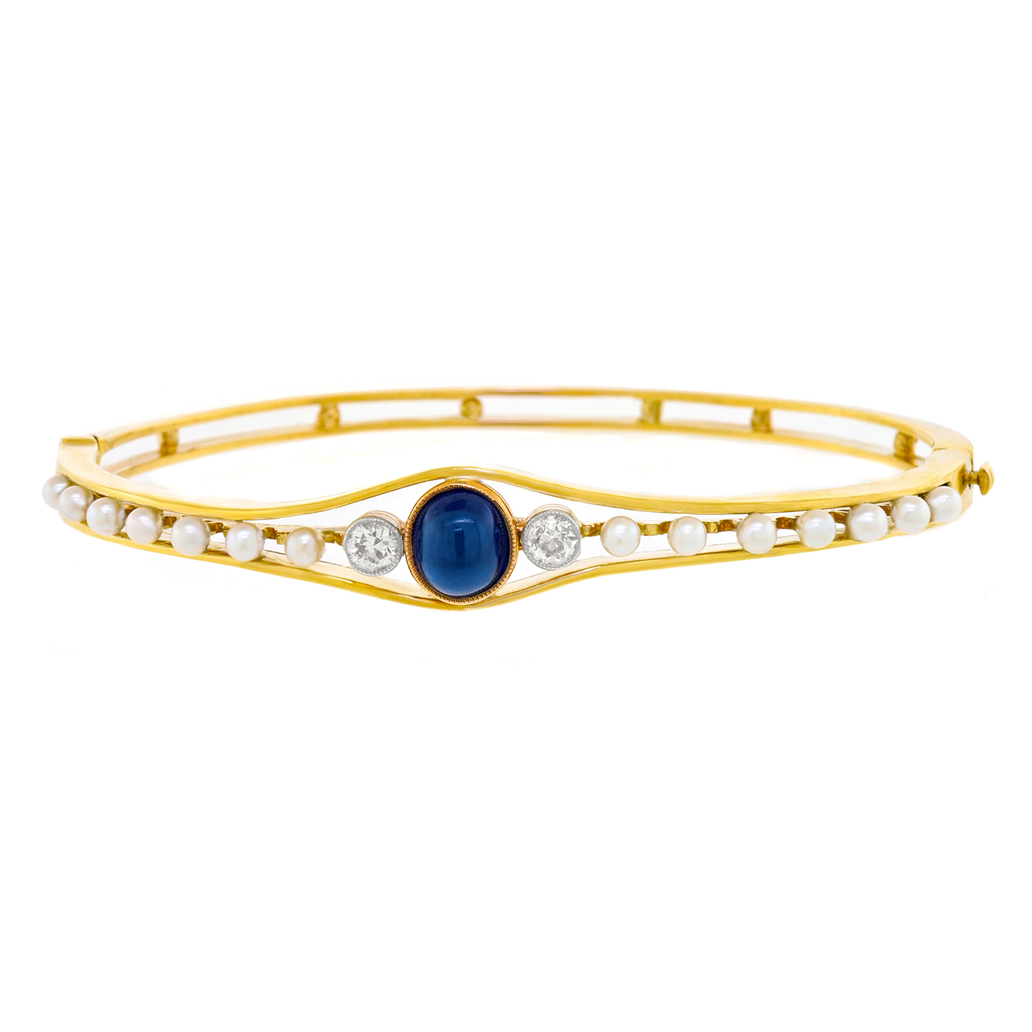 Circa 1910, 14k, American. This antique sapphire and diamond bracelet effortlessly dresses up or down. Its beautiful 2.0-carat cabochon sapphire is collet set in 14k yellow gold and is the dramatic center of this demure jewel. Fine white diamonds sit on each side of the sapphire and pearls complete the gamine visual. Finely hand fabricated it is in excellent condition.