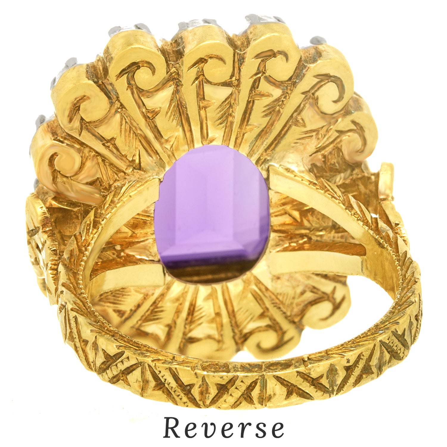 Circa 1920s, 18k/Silver, Spain. This Renaissance Revival twenties ring from Spain features intricately hand-carved and engraved details. Fabricated in 18k yellow gold with silver settings, the vivid 5.0 carat amethyst is surrounded by .40 carats of period diamonds. Its old world narrative is antique chic at its vintage best.   Excellent condition.