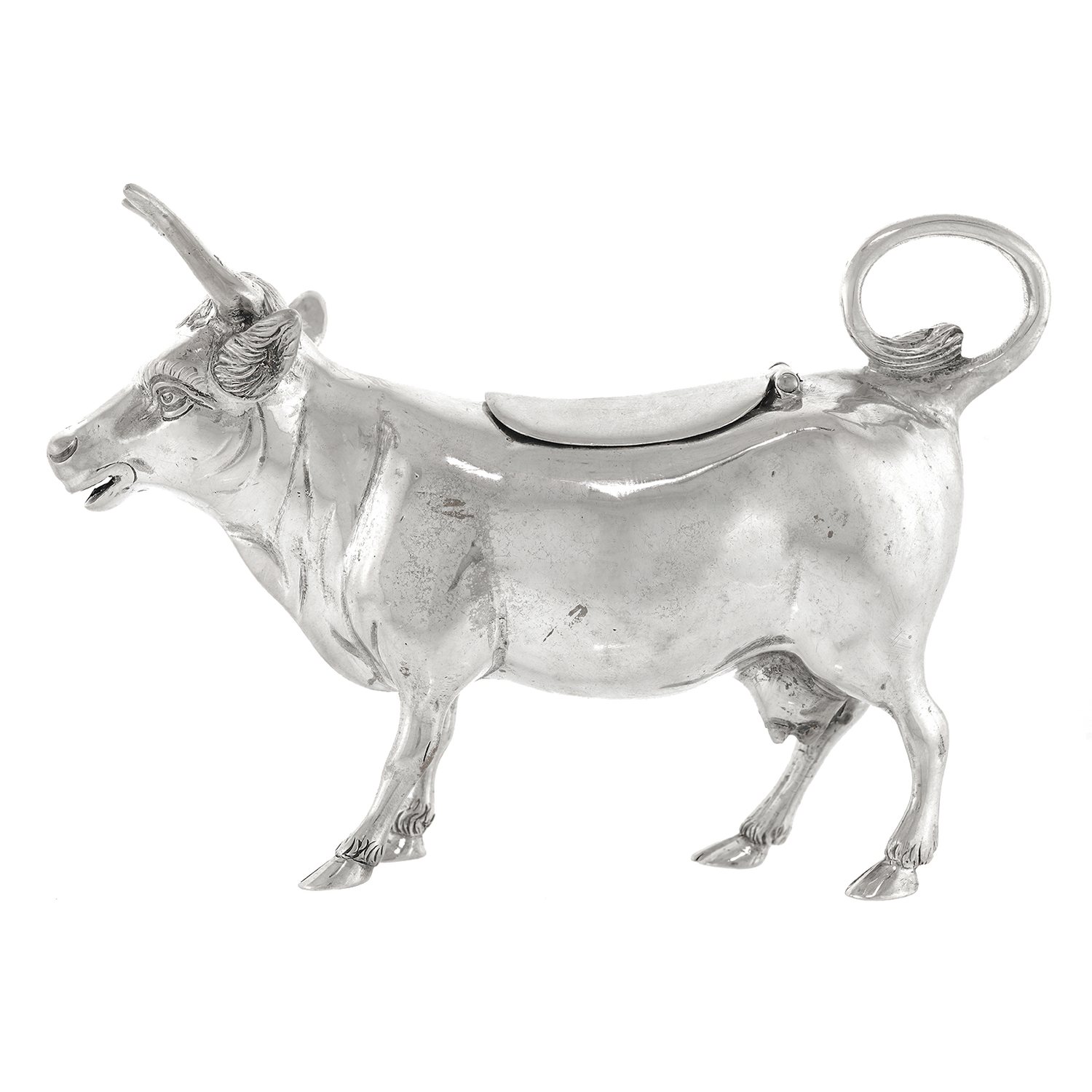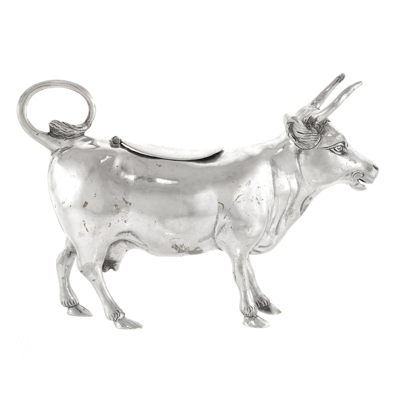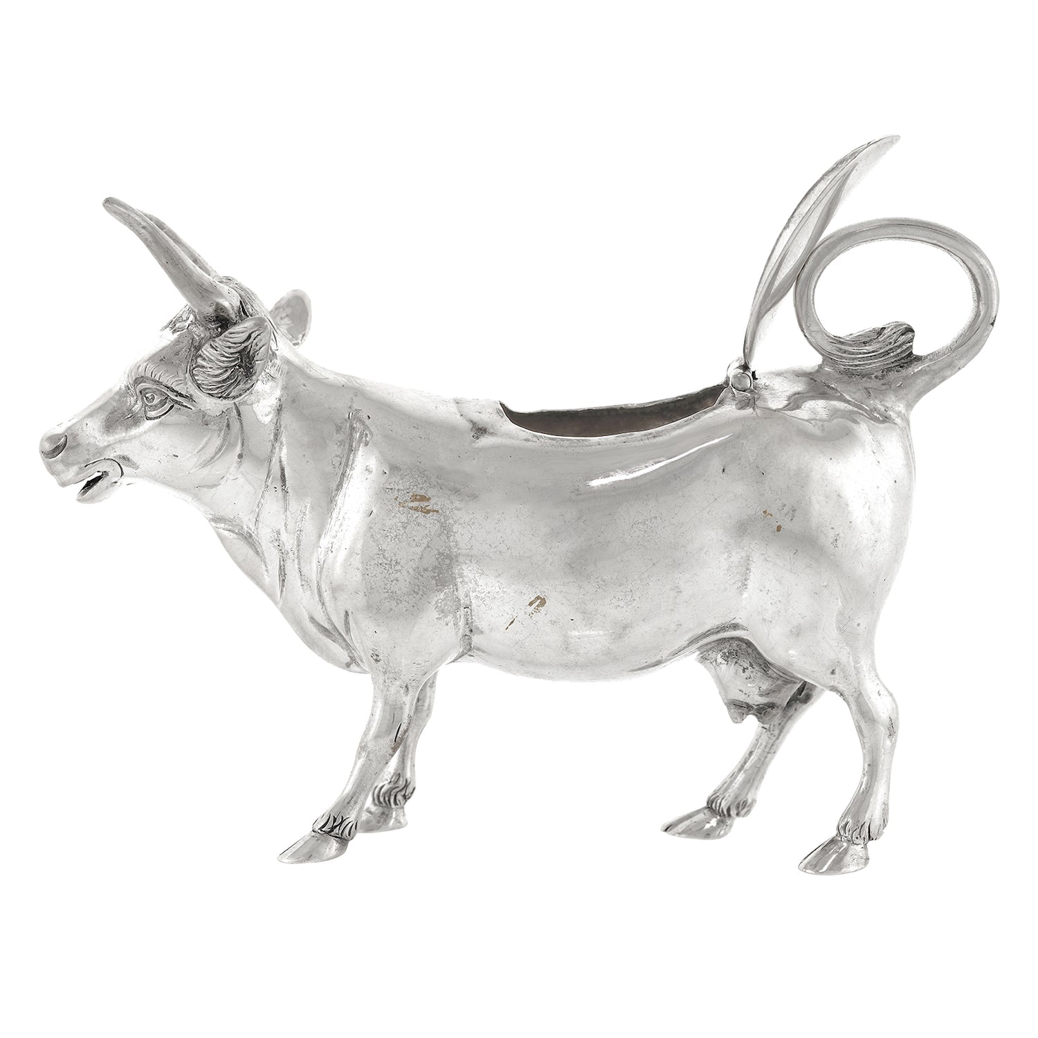 Circa 1890s, .800 fineness solid silver, Hanau, Germany. This charming cow creamer brings a playfully pastoral look to any table. Stylistically dating back to the Georgian period, these whimsical creamers are perfect for country houses and brilliant in your urban cottage. Finely fabricated in .800 fineness solid silver, this example is wonderfully detailed and in excellent condition.