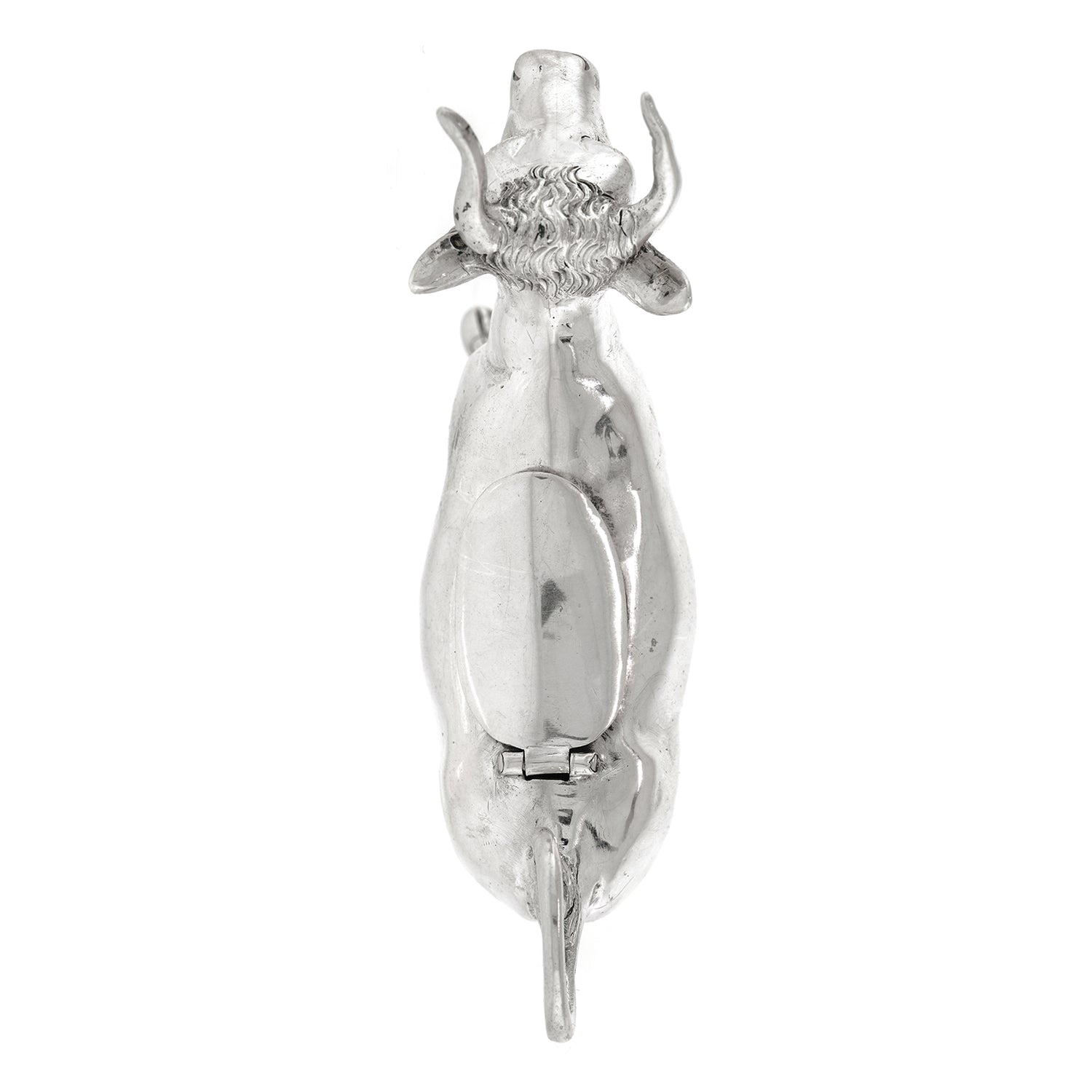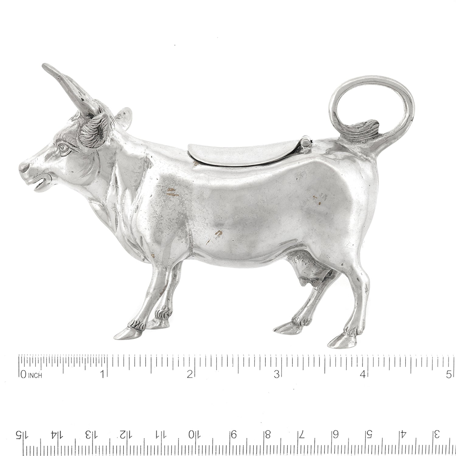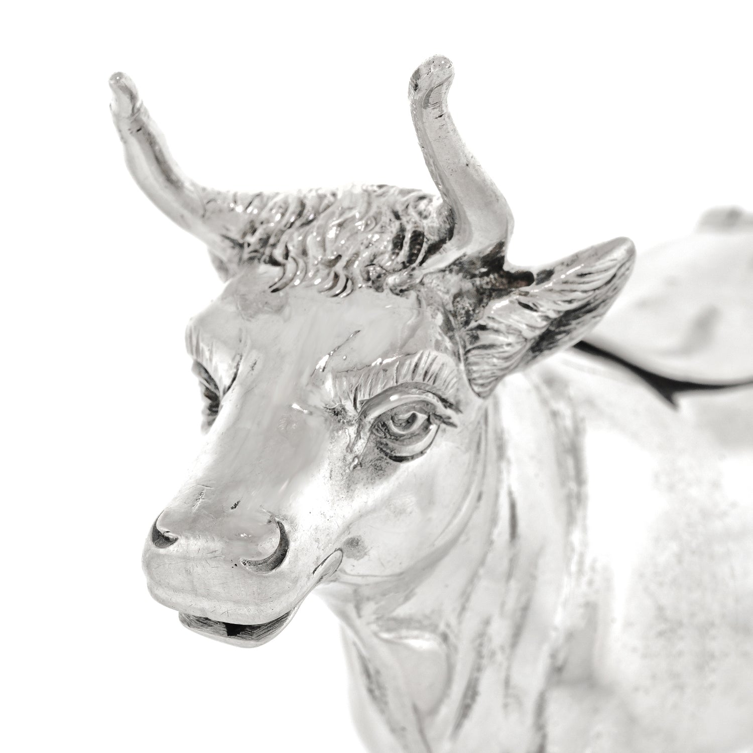Circa 1890s, .800 fineness solid silver, Hanau, Germany. This charming cow creamer brings a playfully pastoral look to any table. Stylistically dating back to the Georgian period, these whimsical creamers are perfect for country houses and brilliant in your urban cottage. Finely fabricated in .800 fineness solid silver, this example is wonderfully detailed and in excellent condition.