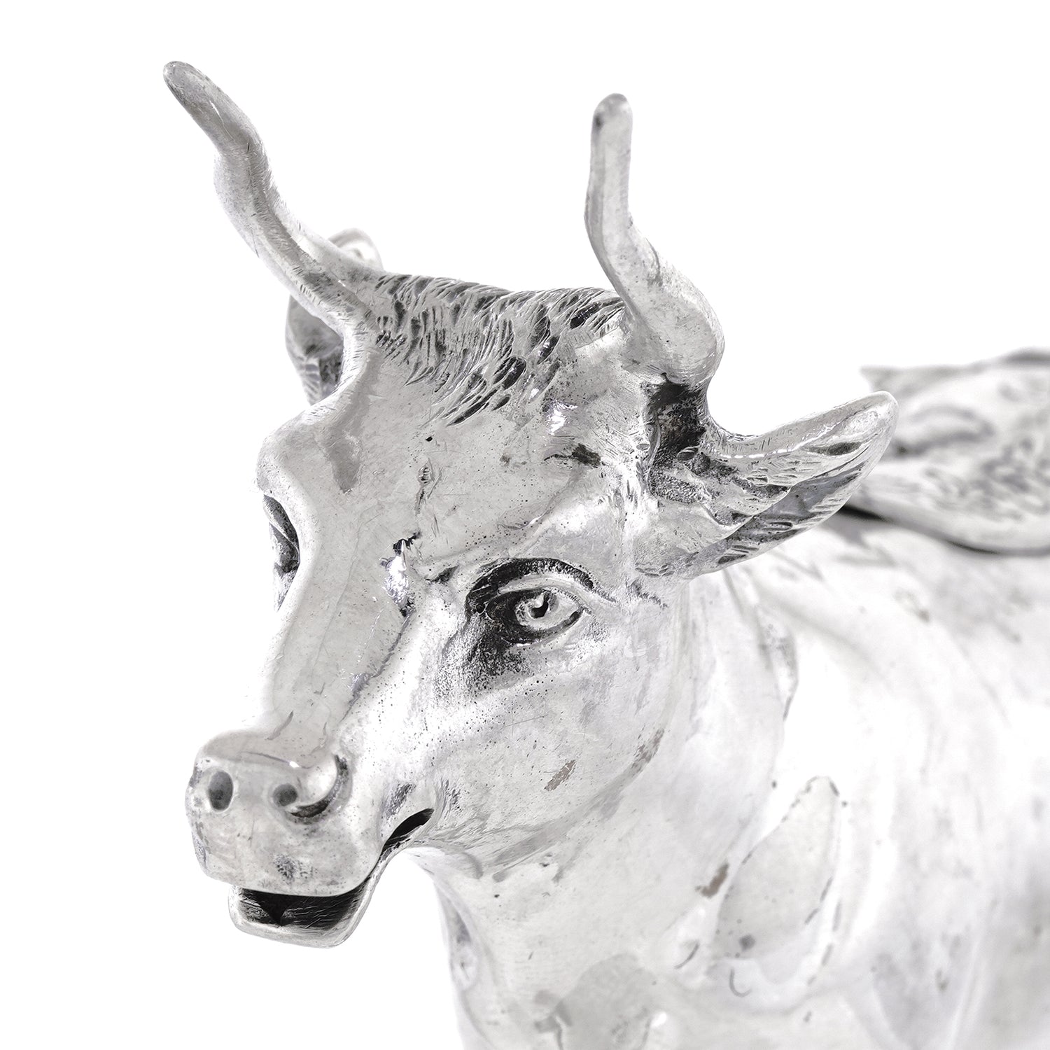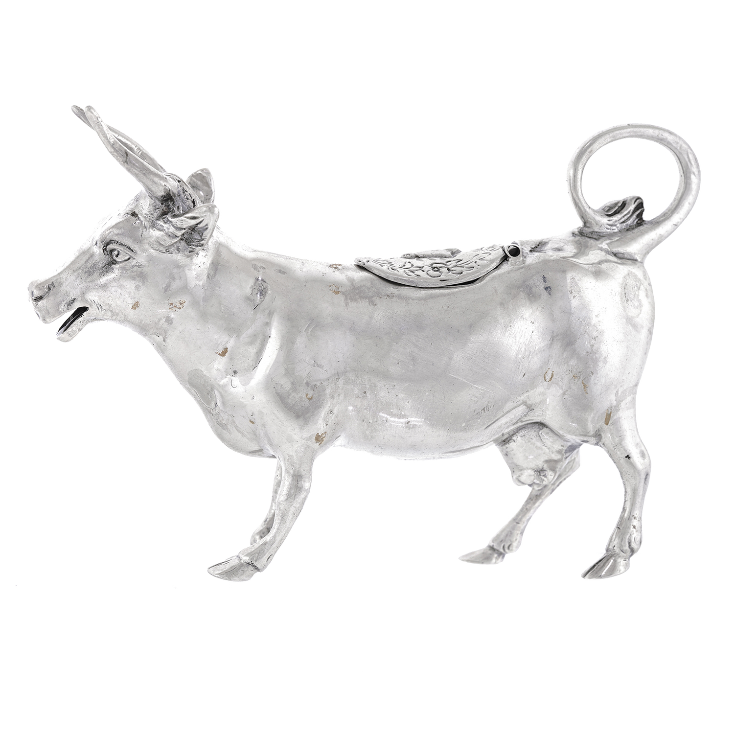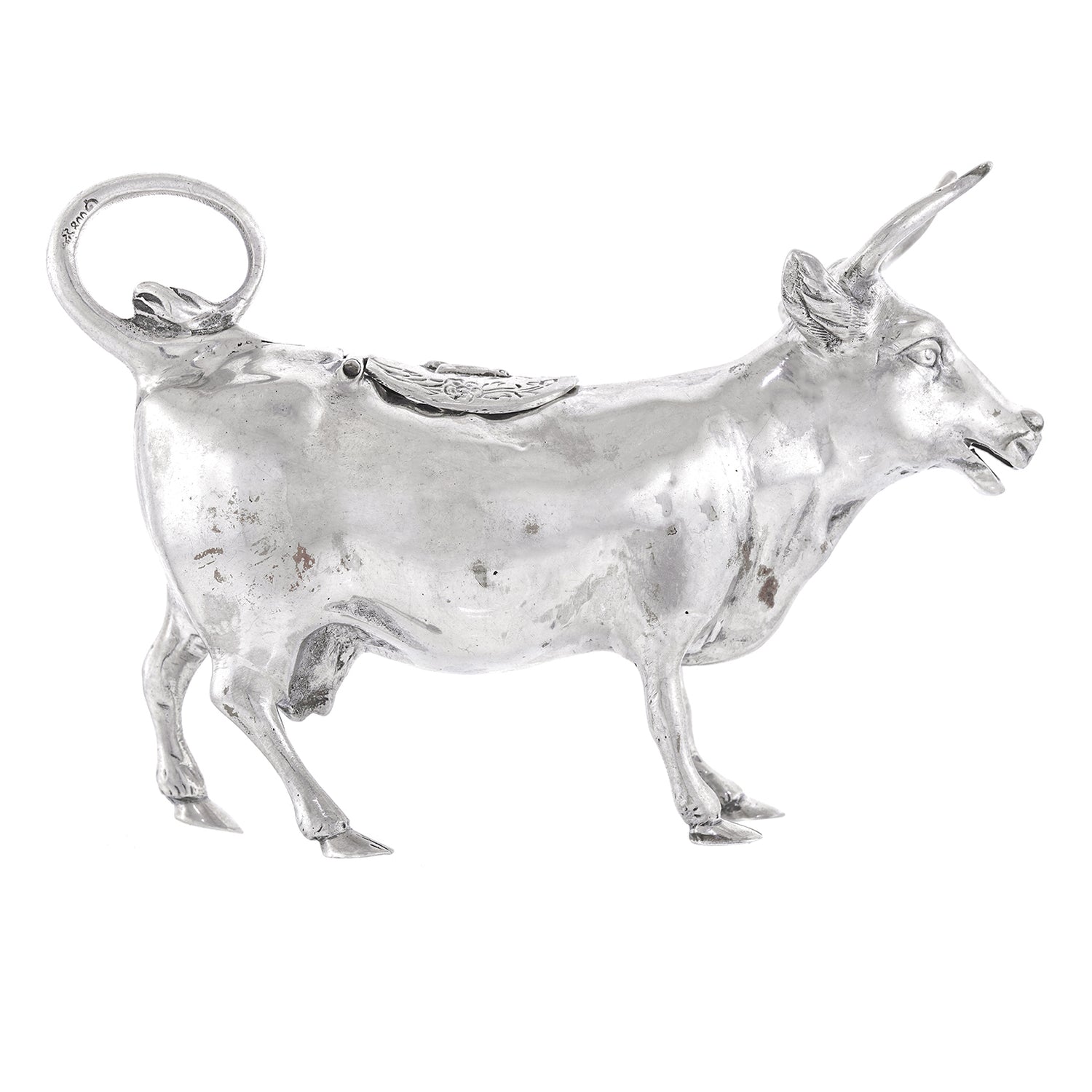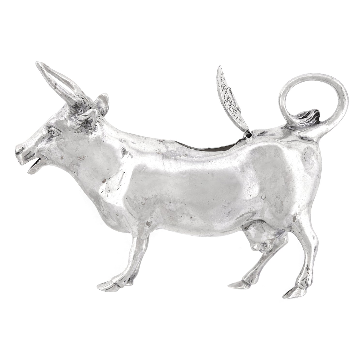 Circa 1920s, .800 fineness silver, Germany. This charming cow creamer brings a playfully pastoral look to any table. Stylistically dating back to the Georgian period, these whimsical creamers are perfect for country houses and brilliant in your urban cottage. Finely fabricated in .800 fineness solid silver, this example is wonderfully detailed and in excellent condition.