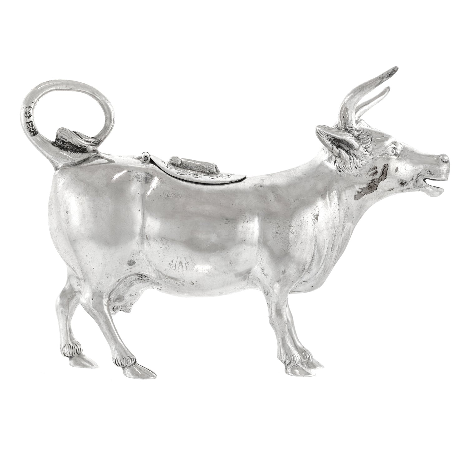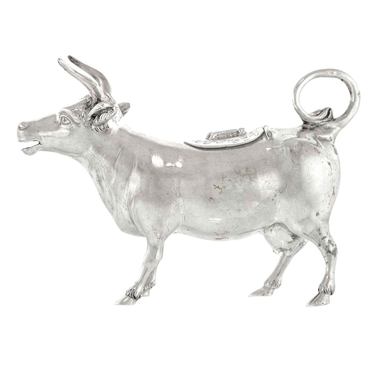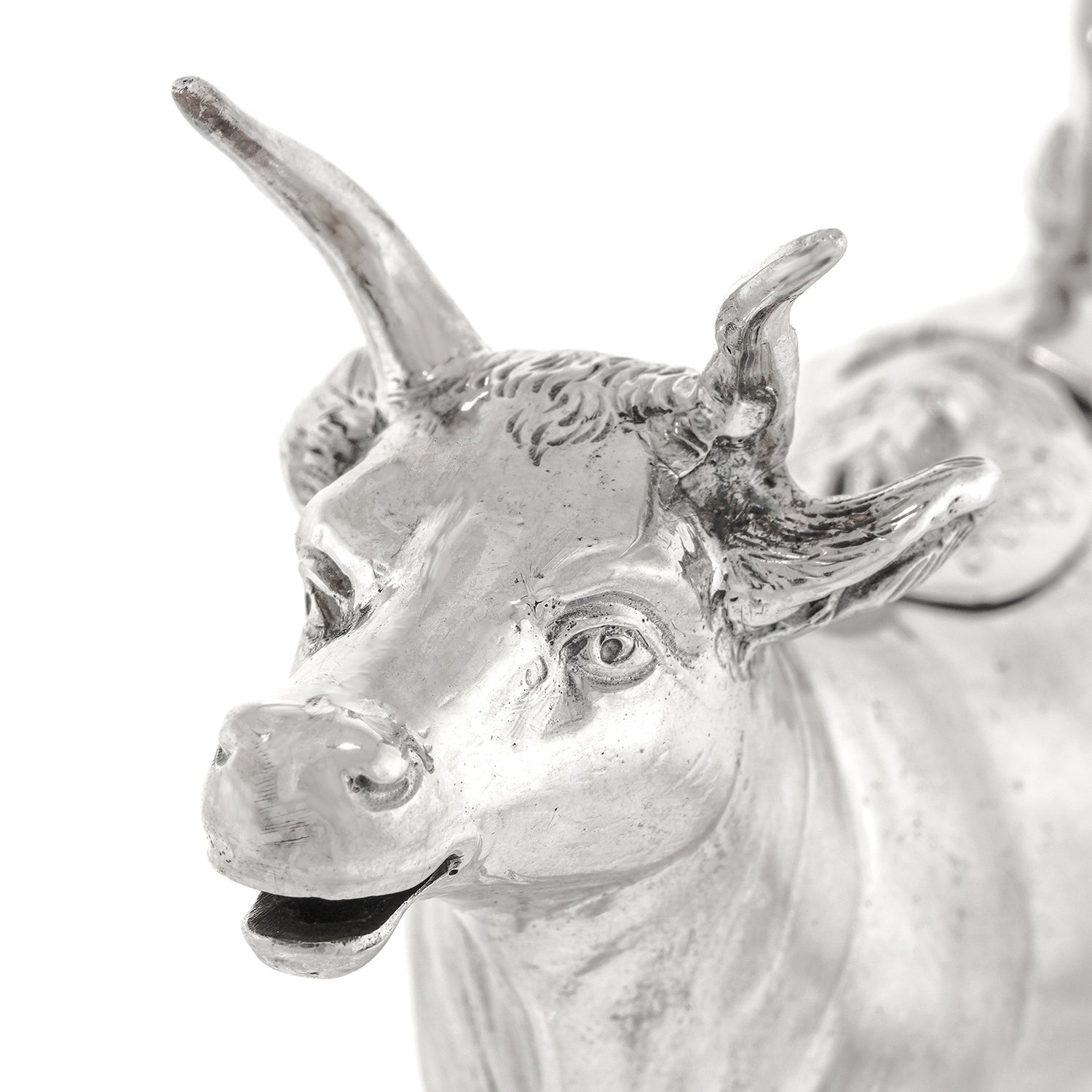 Circa 1890s, .800 fineness solid silver, Hanau, Germany. This charming cow creamer brings a playfully pastoral look to any table. Stylistically dating back to the Georgian period, these whimsical creamers are perfect for country houses and brilliant in your urban cottage. Finely fabricated in .800 fineness solid silver, this example is wonderfully detailed and in excellent condition.