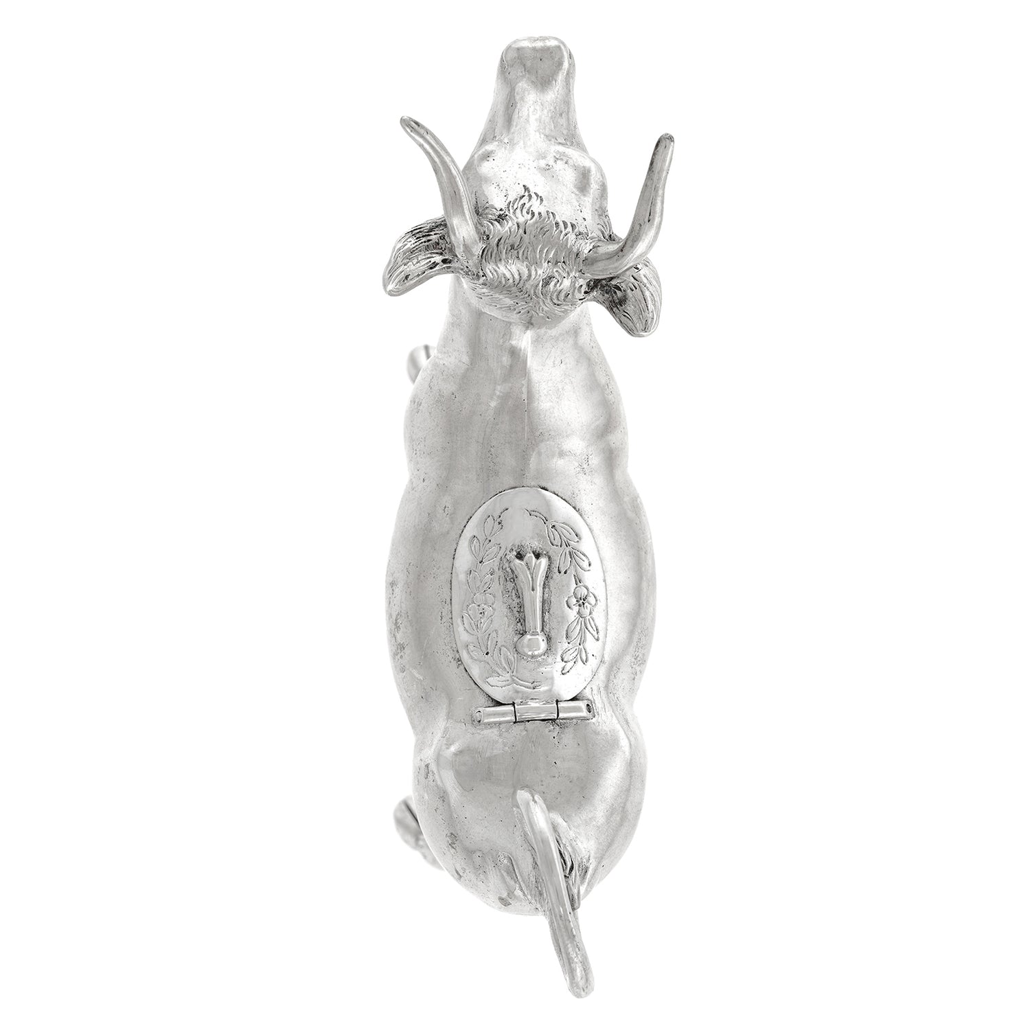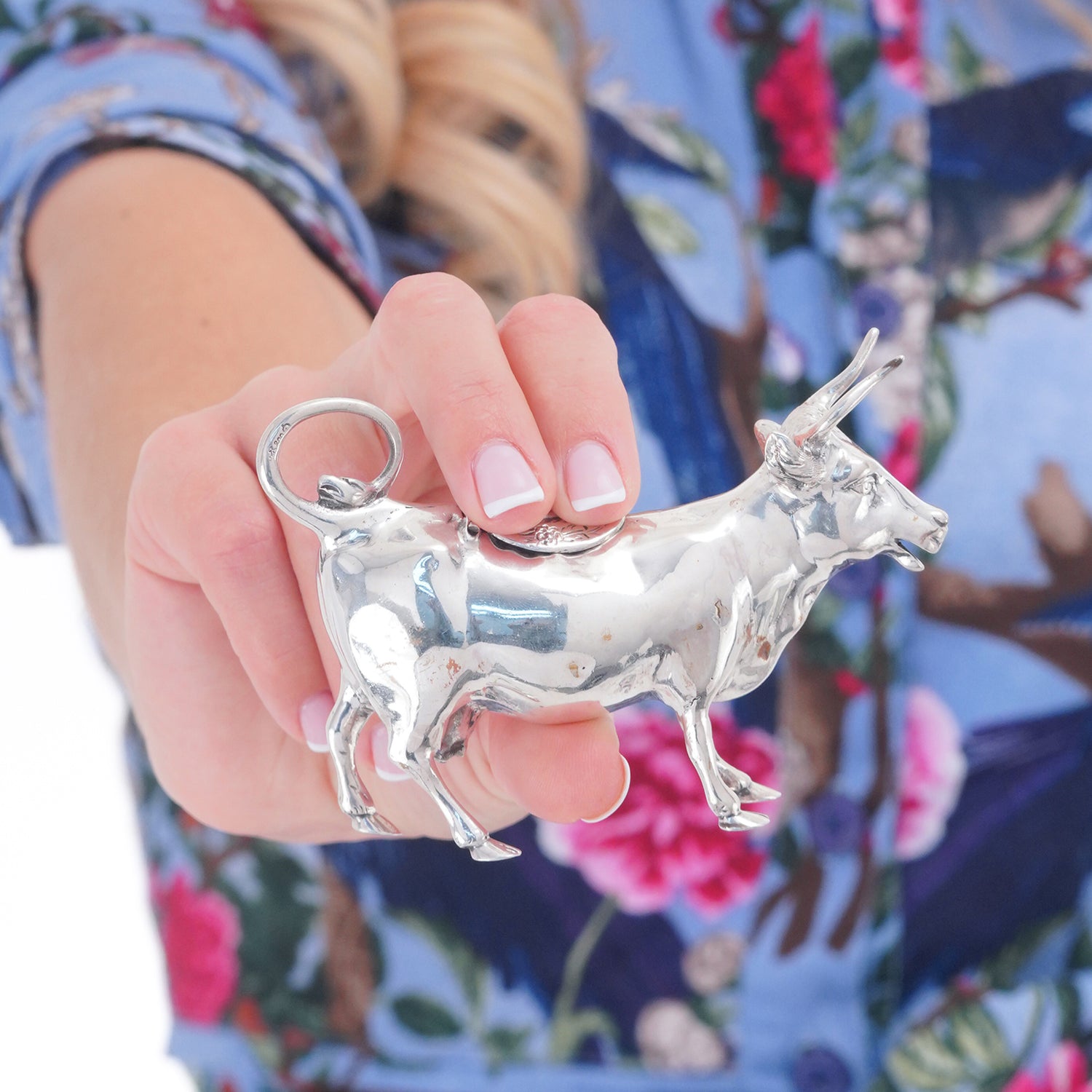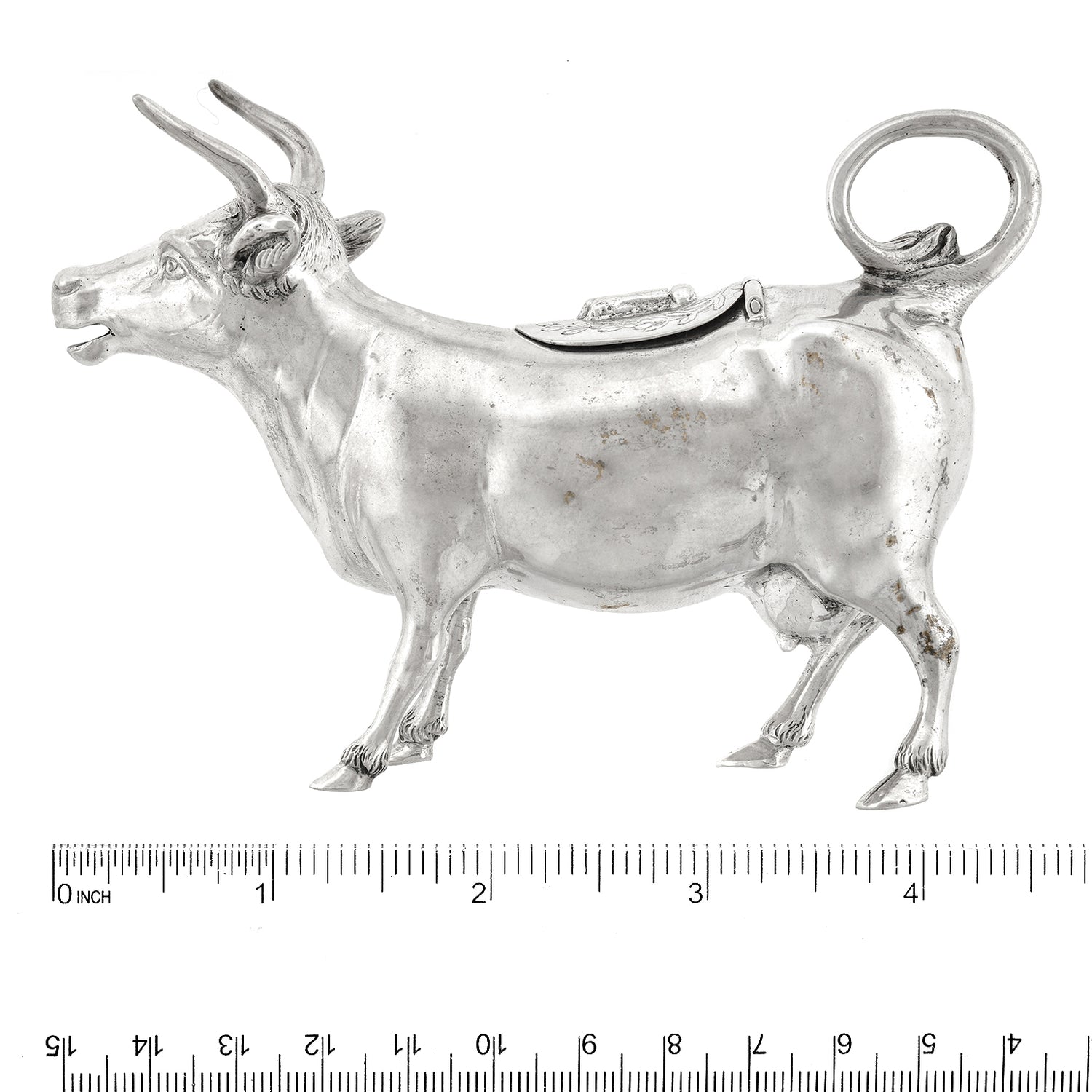 Circa 1890s, .800 fineness solid silver, Hanau, Germany. This charming cow creamer brings a playfully pastoral look to any table. Stylistically dating back to the Georgian period, these whimsical creamers are perfect for country houses and brilliant in your urban cottage. Finely fabricated in .800 fineness solid silver, this example is wonderfully detailed and in excellent condition.