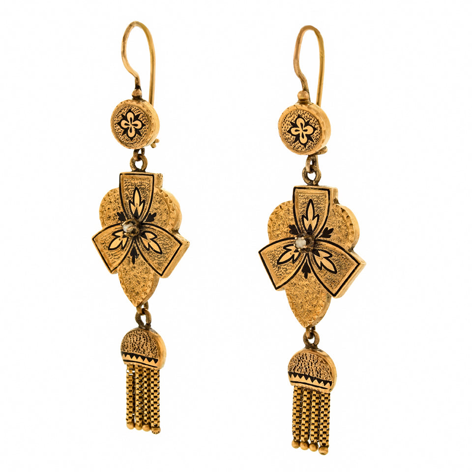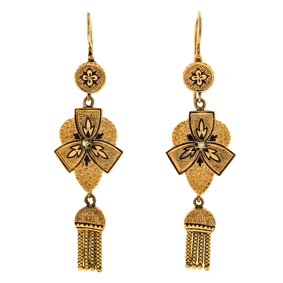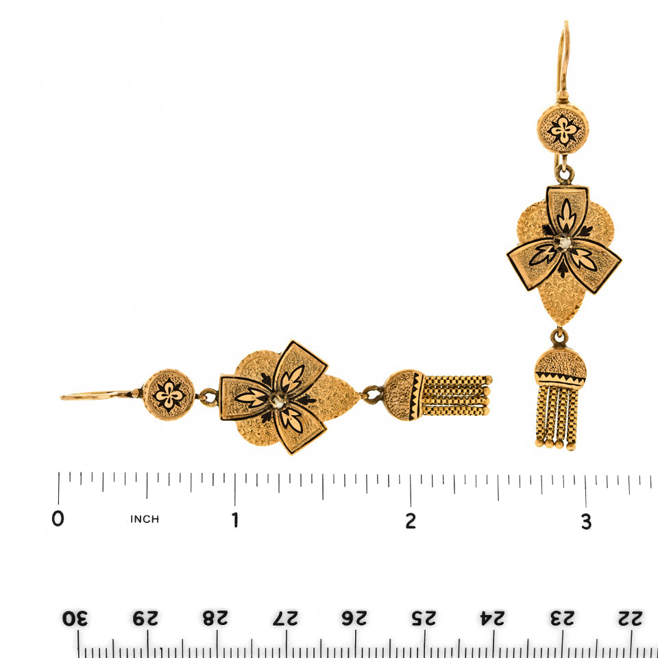 Circa 1890s, 14k, American. These antique American earrings have fabulous length and playful movement, giving them a charming visual narrative - a fabulous find indeed!  The fourteen-karat gold has a pleasing patina, detailed engraving, and black enamel. The look is Victorian chic.  Excellent condition.