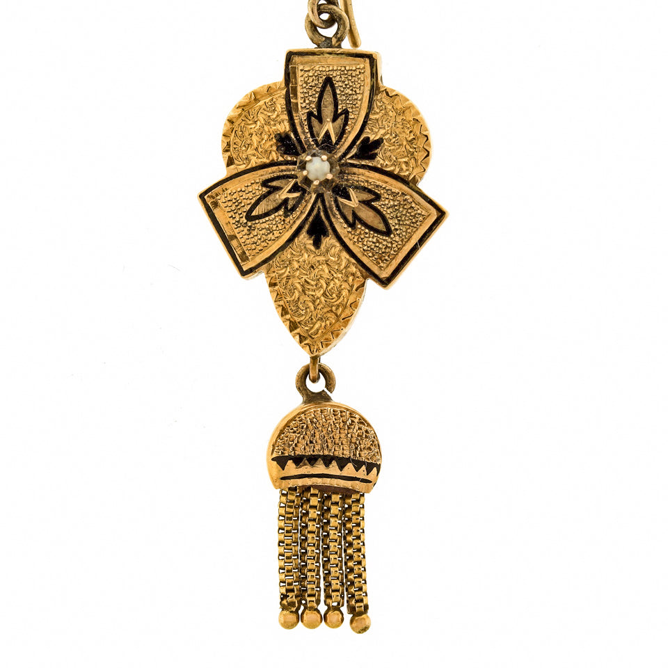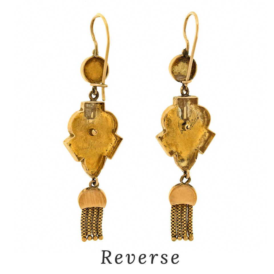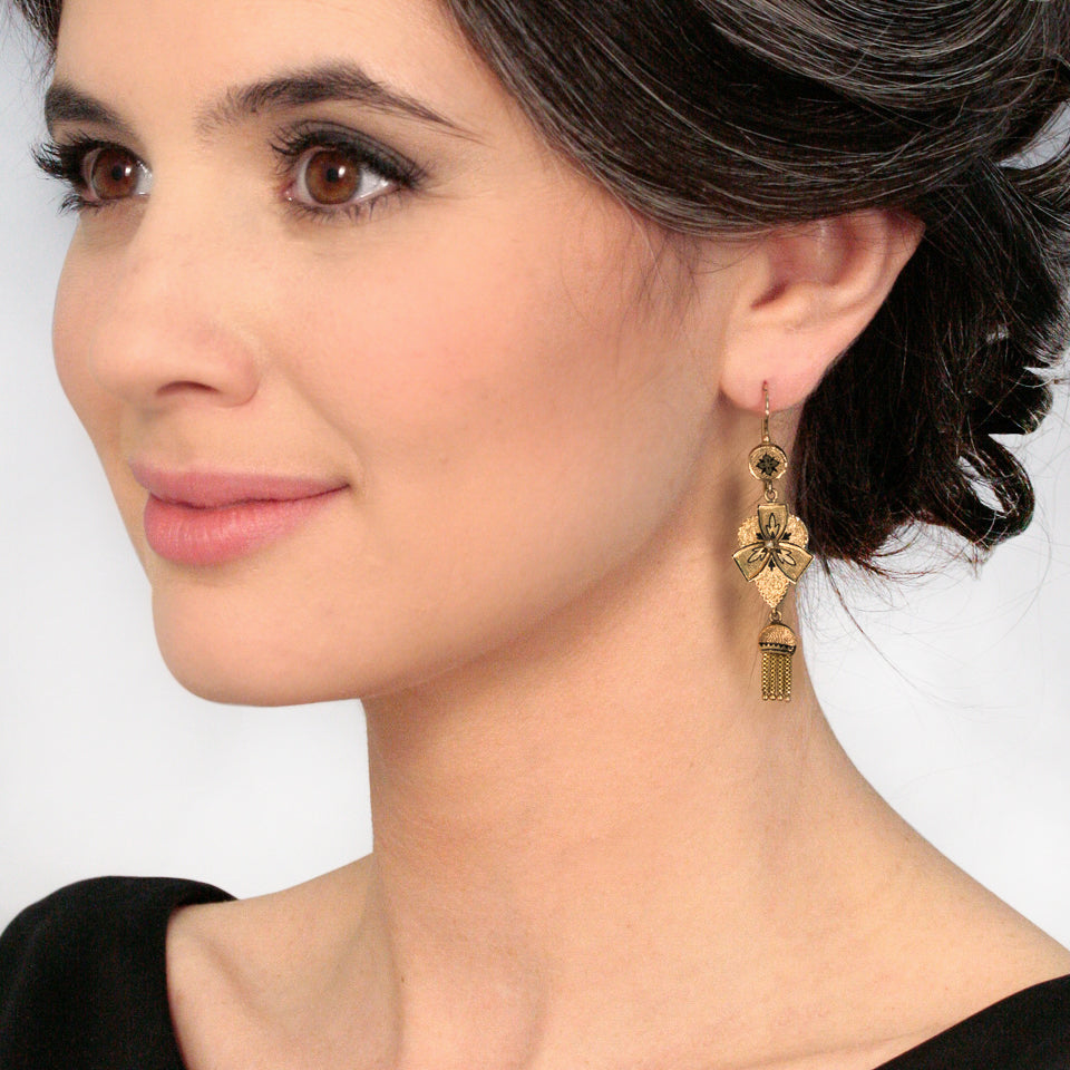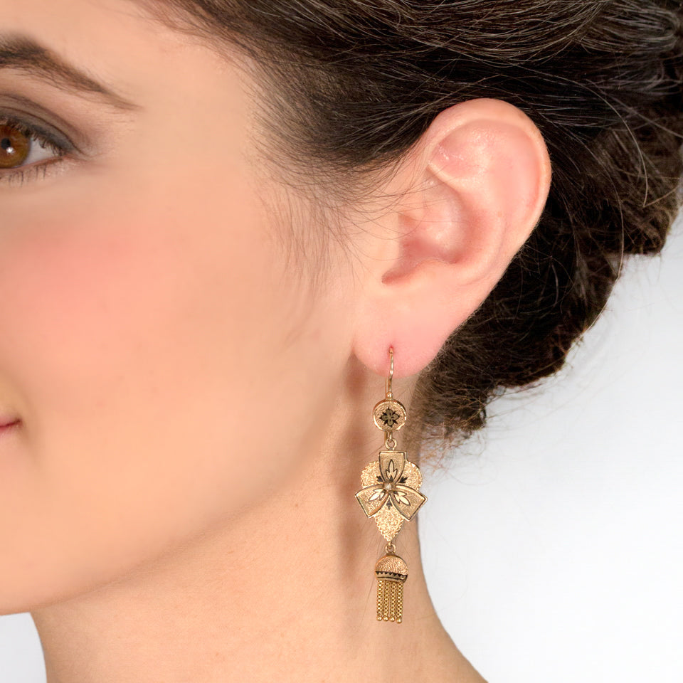 Circa 1890s, 14k, American. These antique American earrings have fabulous length and playful movement, giving them a charming visual narrative - a fabulous find indeed!  The fourteen-karat gold has a pleasing patina, detailed engraving, and black enamel. The look is Victorian chic.  Excellent condition.