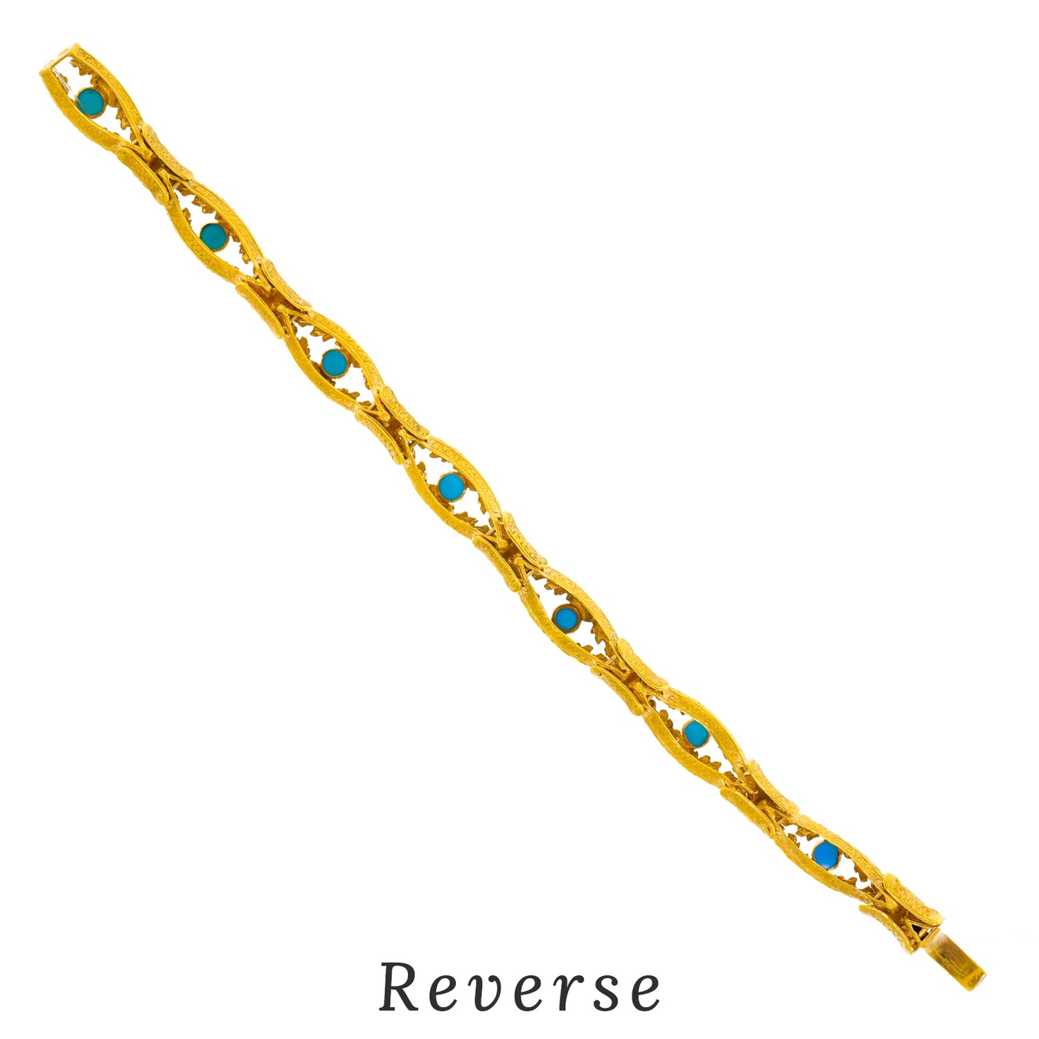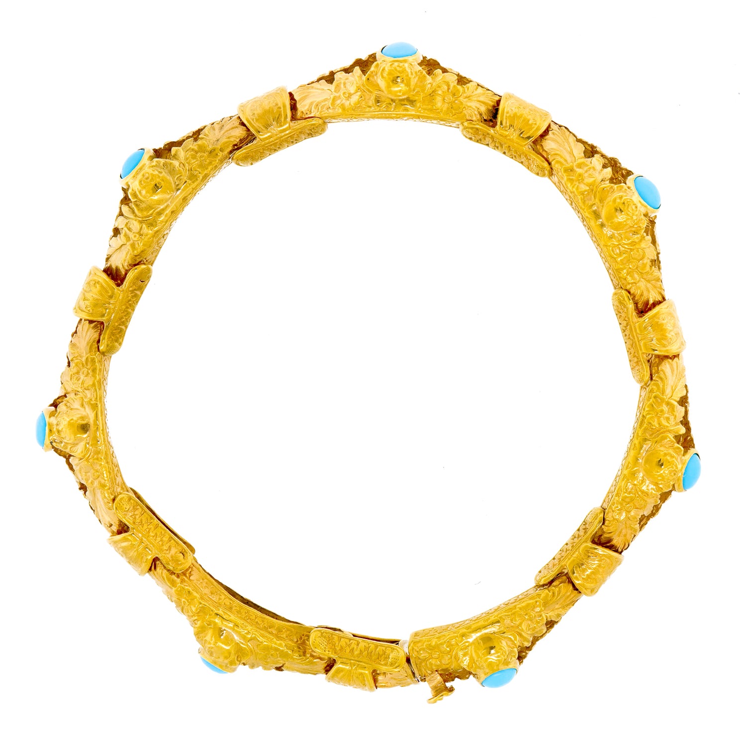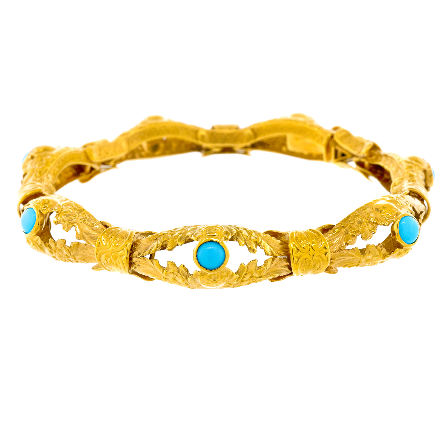 Circa 1890s, 18k.  Beyond charming and past perfection is where this bracelet lives. The turquoise is a visual pop against the rich 18k yellow gold. Feminine and ornate, this bracelet is effortlessly chic in any fashion moment. Excellent condition.