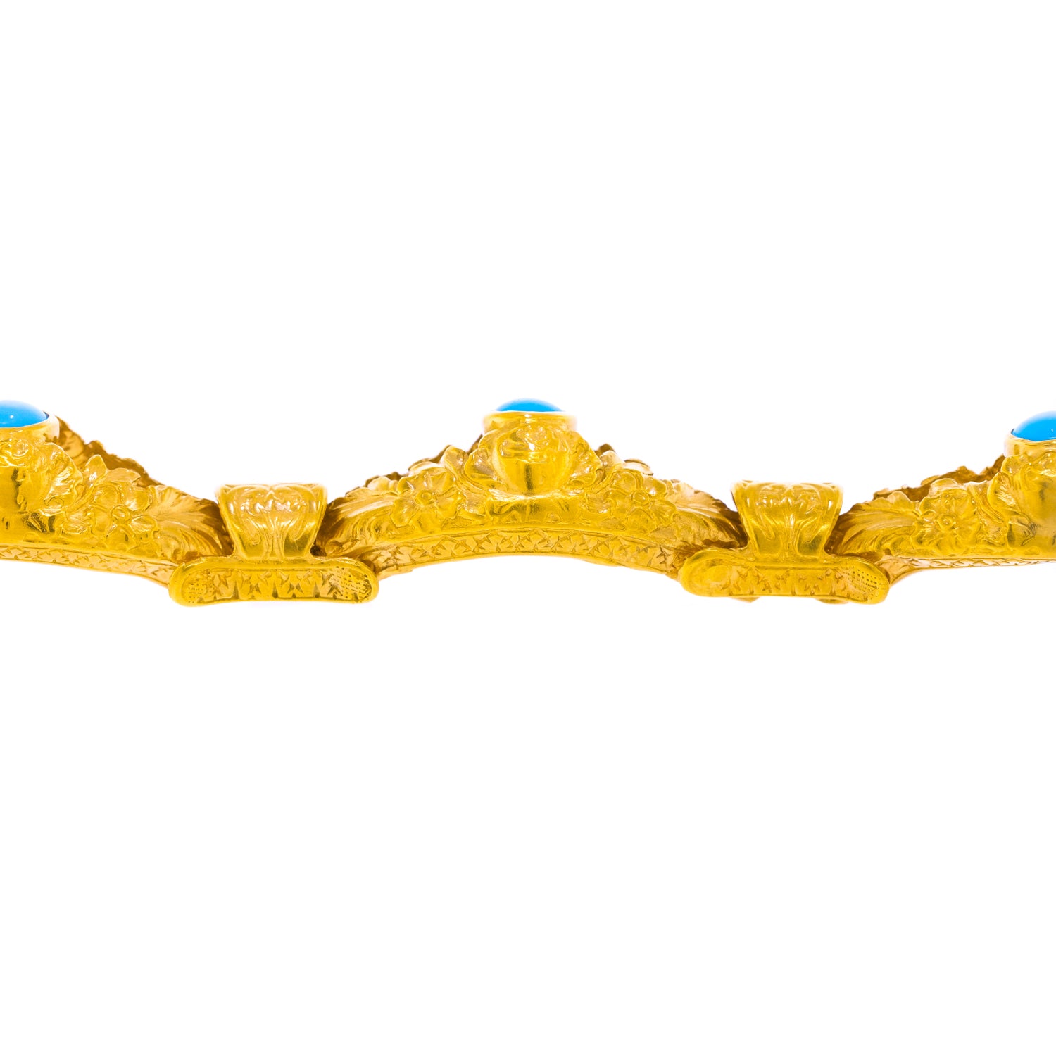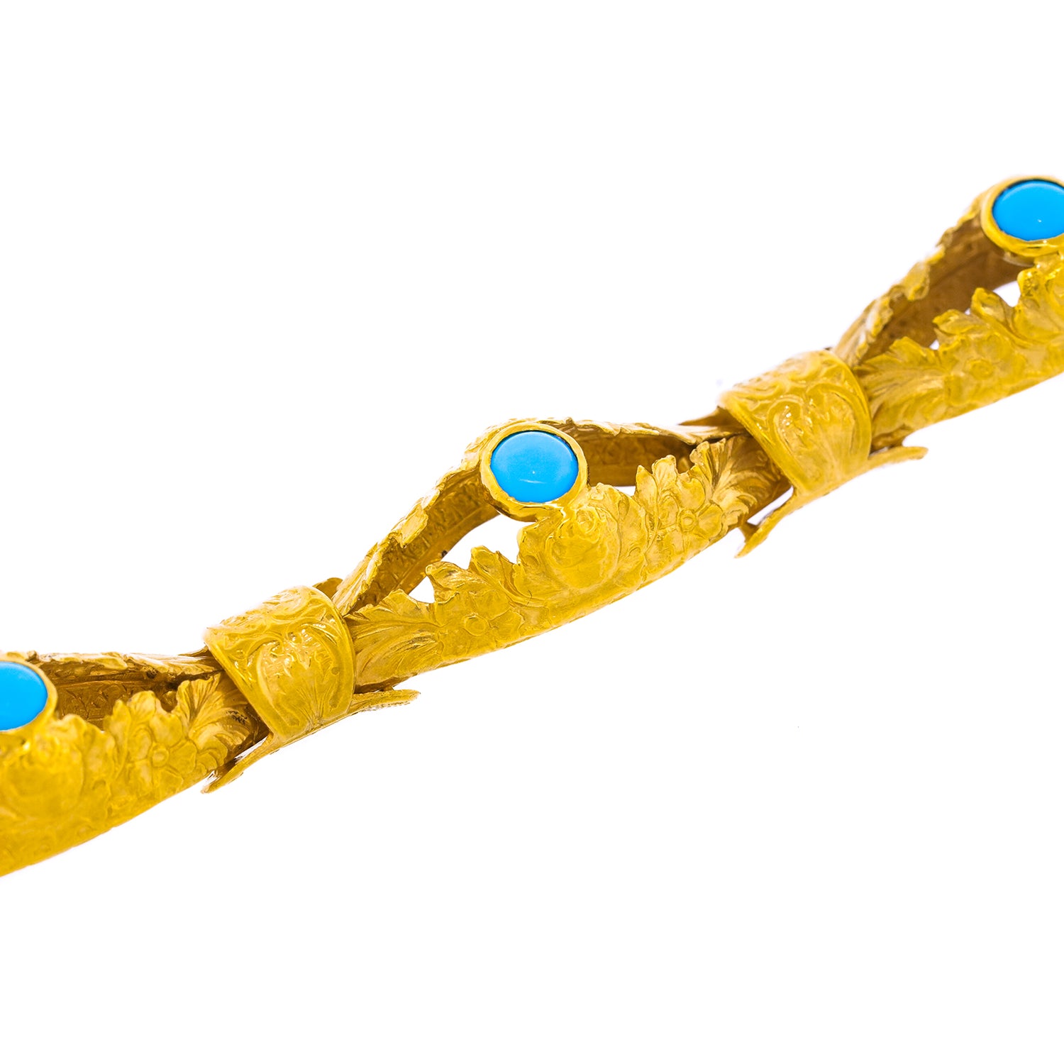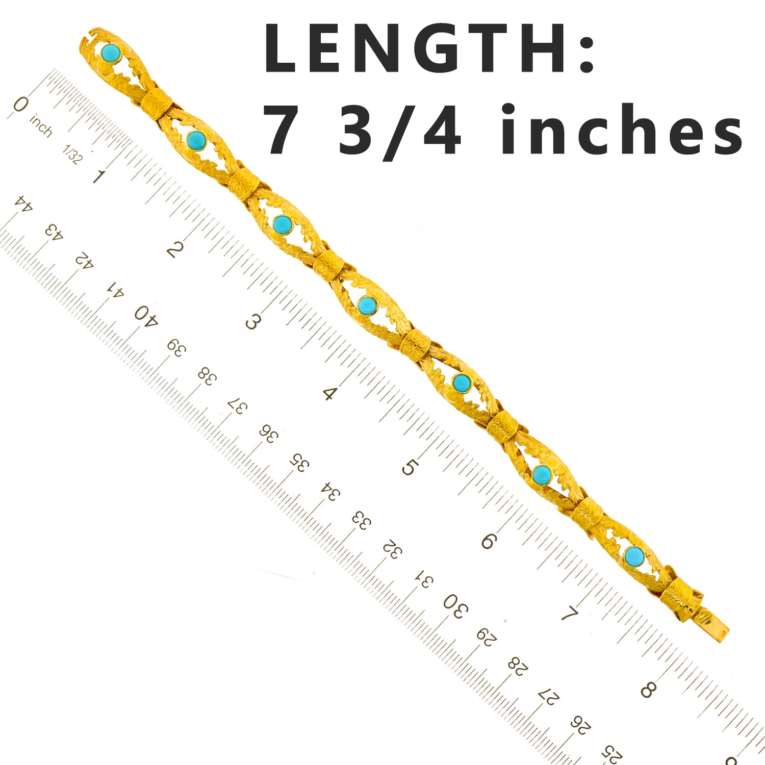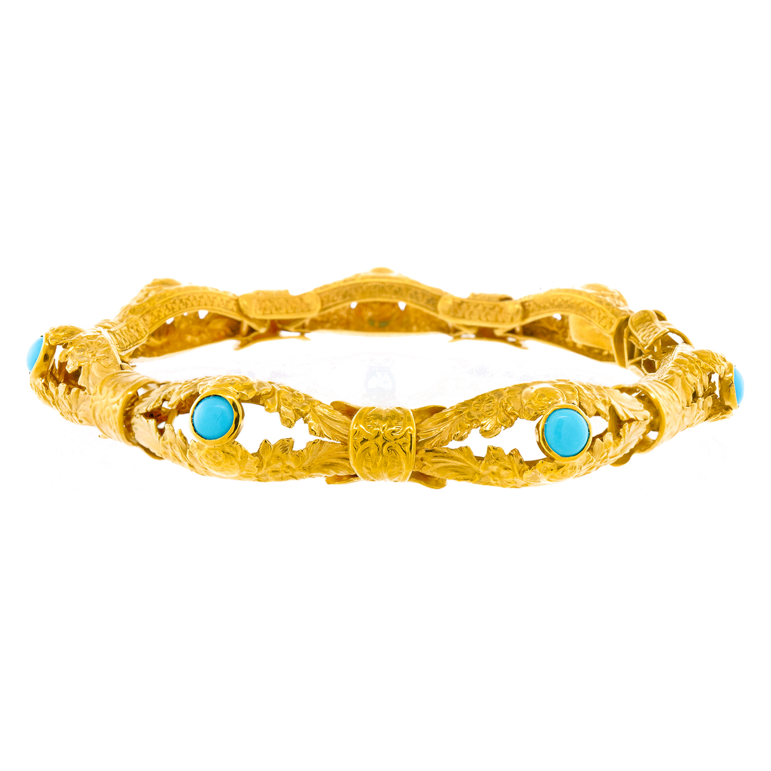 Circa 1890s, 18k.  Beyond charming and past perfection is where this bracelet lives. The turquoise is a visual pop against the rich 18k yellow gold. Feminine and ornate, this bracelet is effortlessly chic in any fashion moment. Excellent condition.