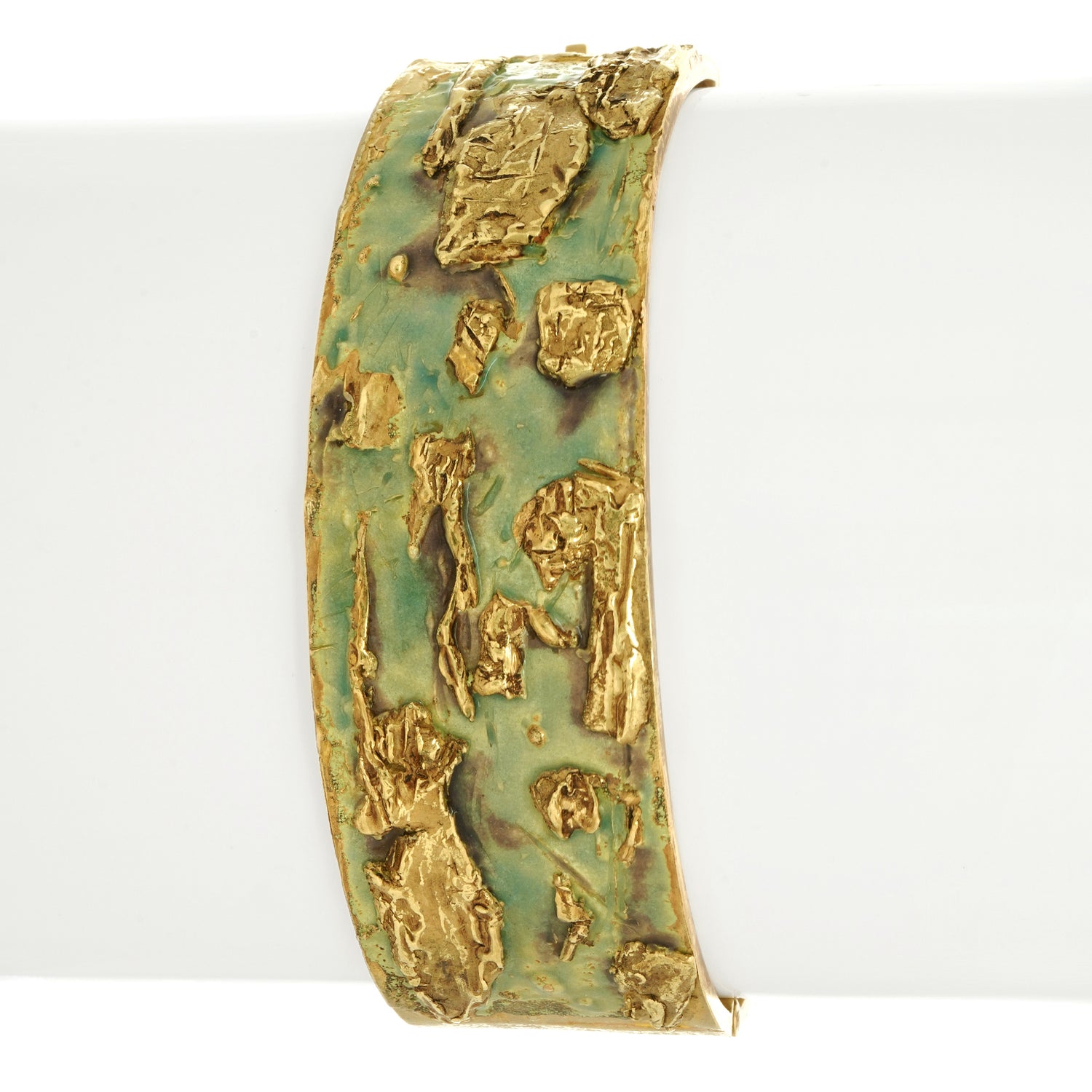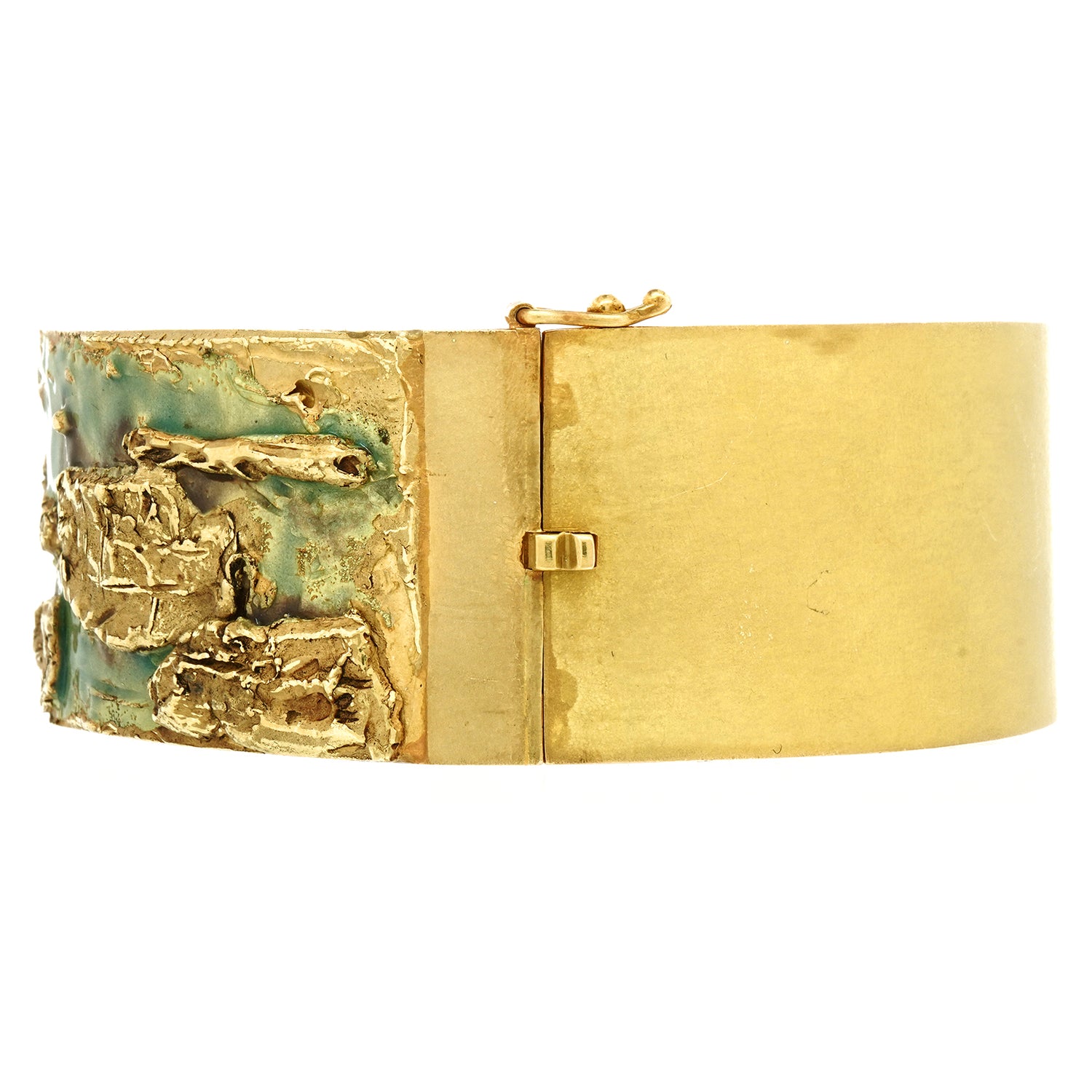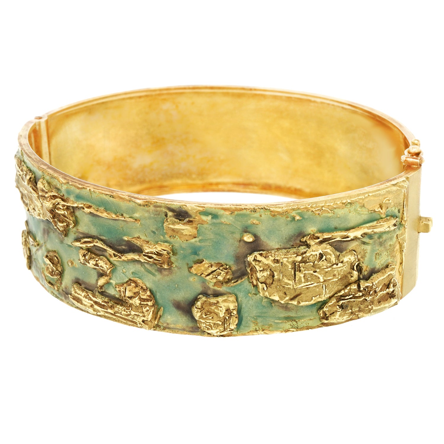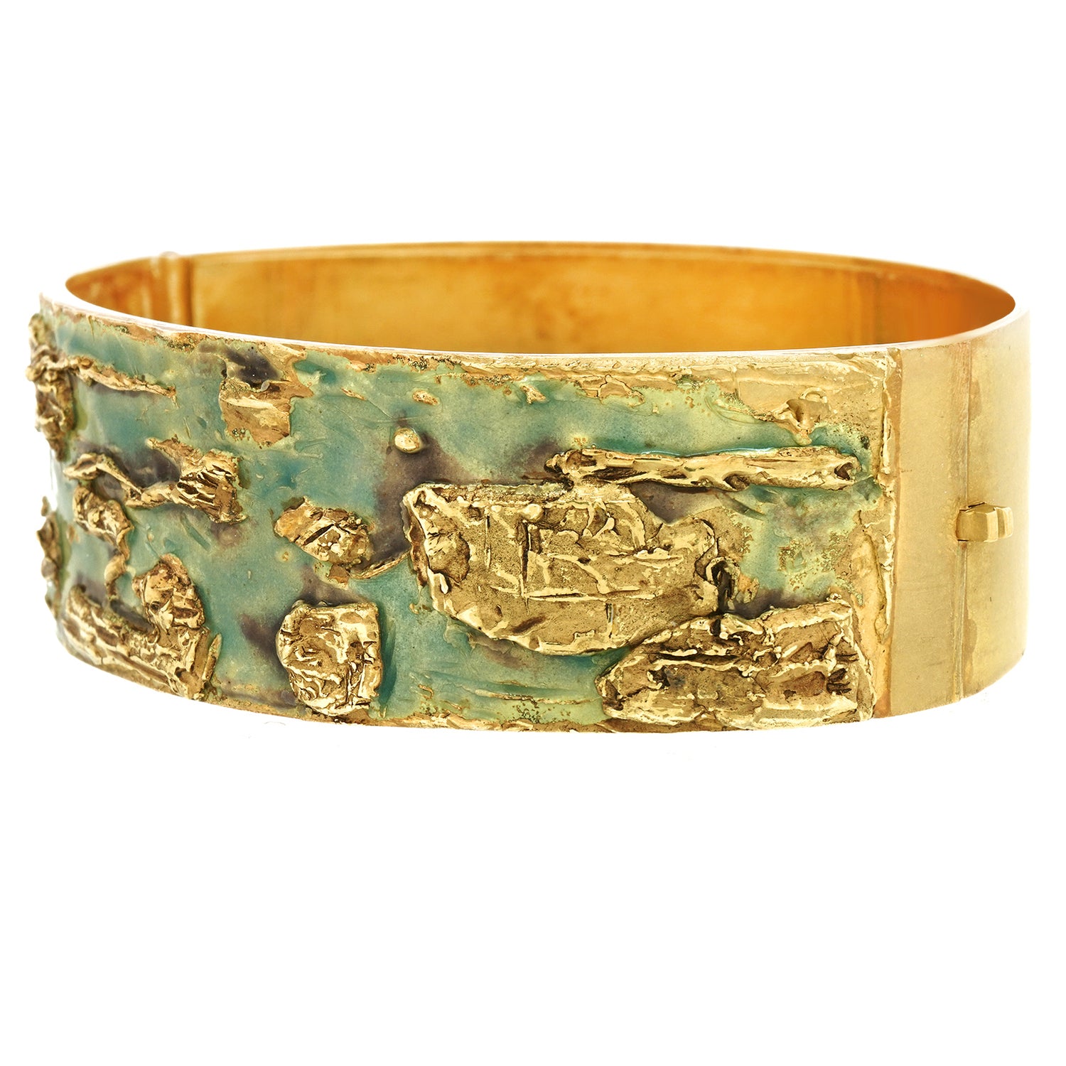 Circa 1970s, 18k, by Anton Fruhauf, Italy. This spectacular bracelet by Anton Fruhauf features beautiful blue-green enamel and spectacular organic goldwork. Famous for producing one-of-a-kind pieces with unique surfaces and sophisticated enamel work, Fruhauf was recognized as early as 1957 for his innovative modernist designs (he received numerous awards). His pieces are prized by connoisseurs and museums alike. Excellent condition.