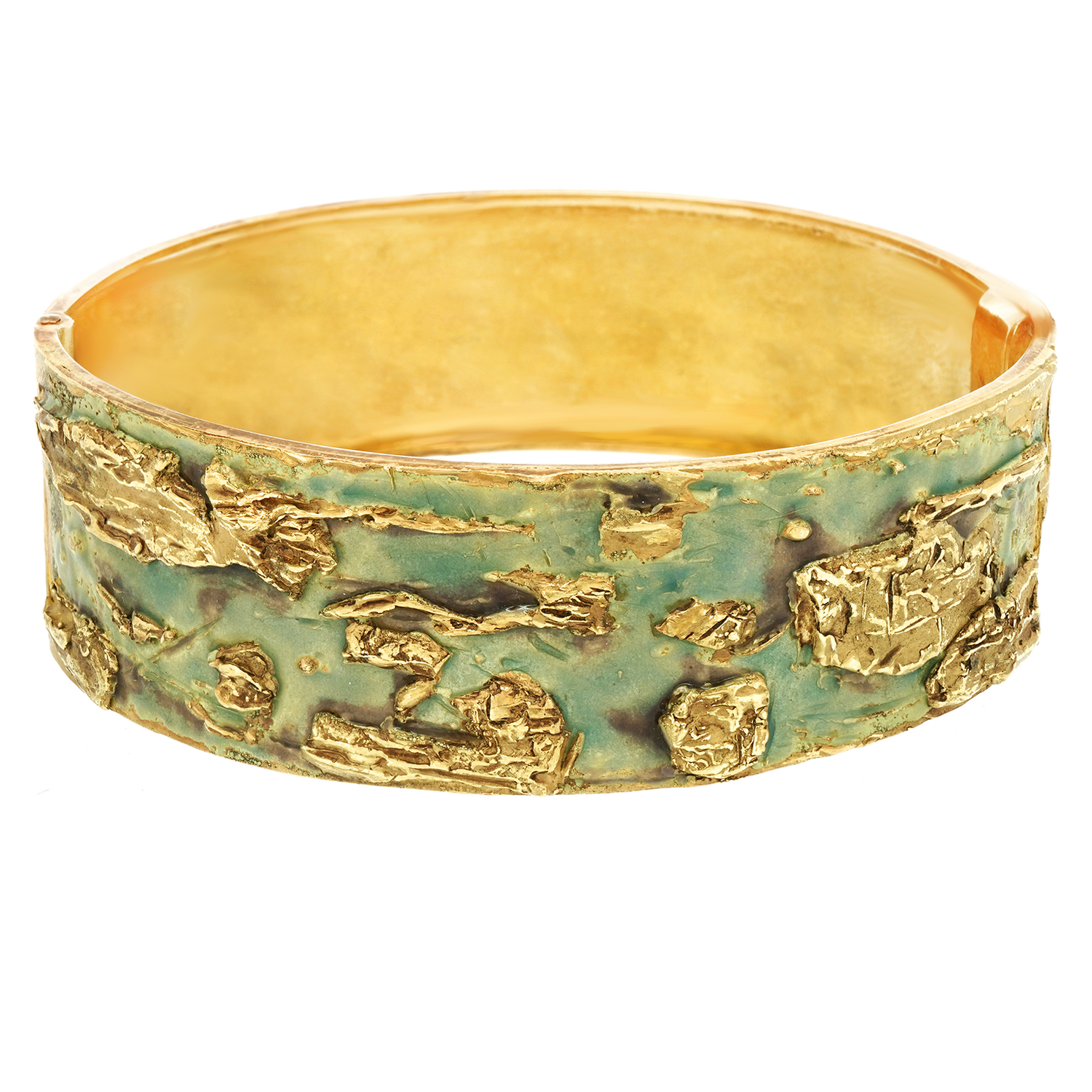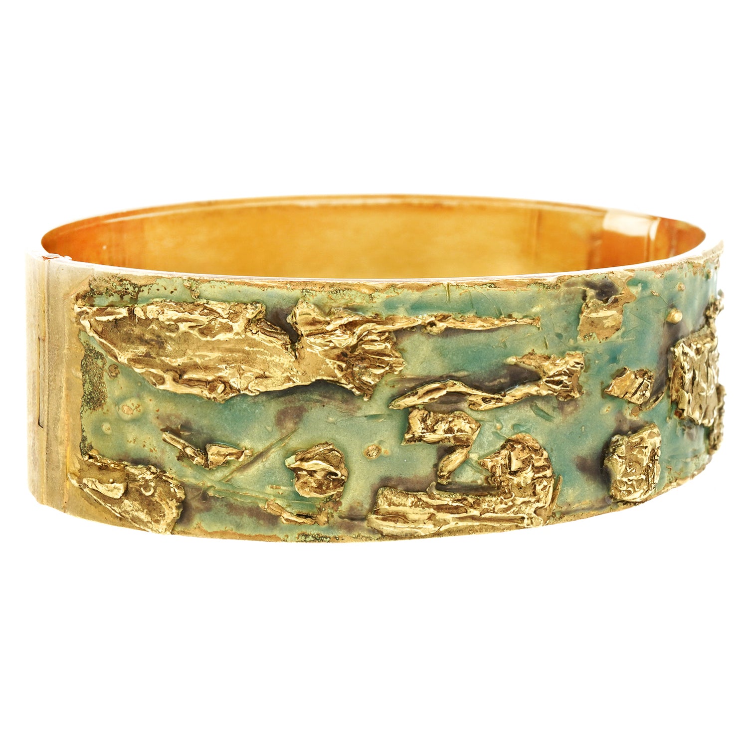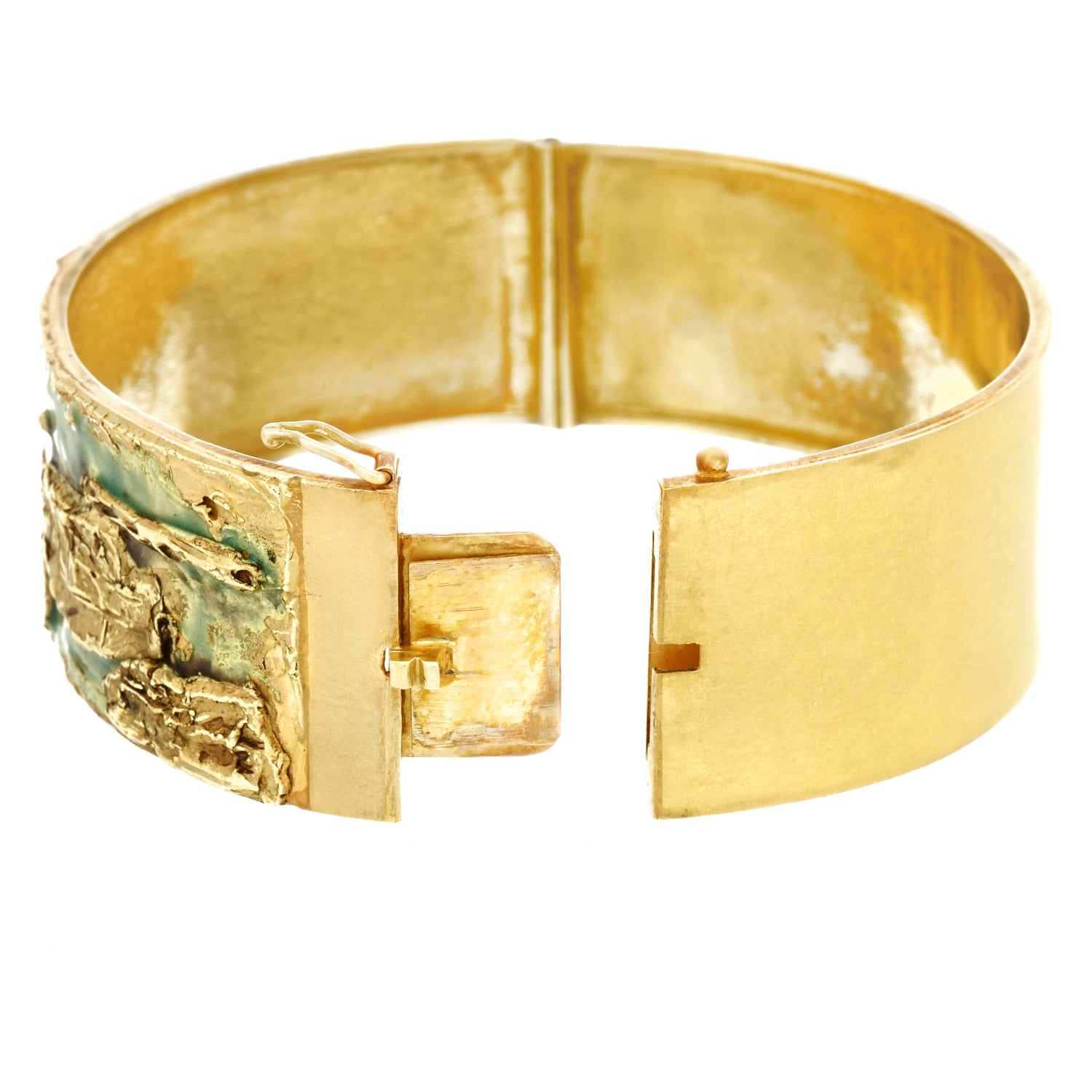 Circa 1970s, 18k, by Anton Fruhauf, Italy. This spectacular bracelet by Anton Fruhauf features beautiful blue-green enamel and spectacular organic goldwork. Famous for producing one-of-a-kind pieces with unique surfaces and sophisticated enamel work, Fruhauf was recognized as early as 1957 for his innovative modernist designs (he received numerous awards). His pieces are prized by connoisseurs and museums alike. Excellent condition.