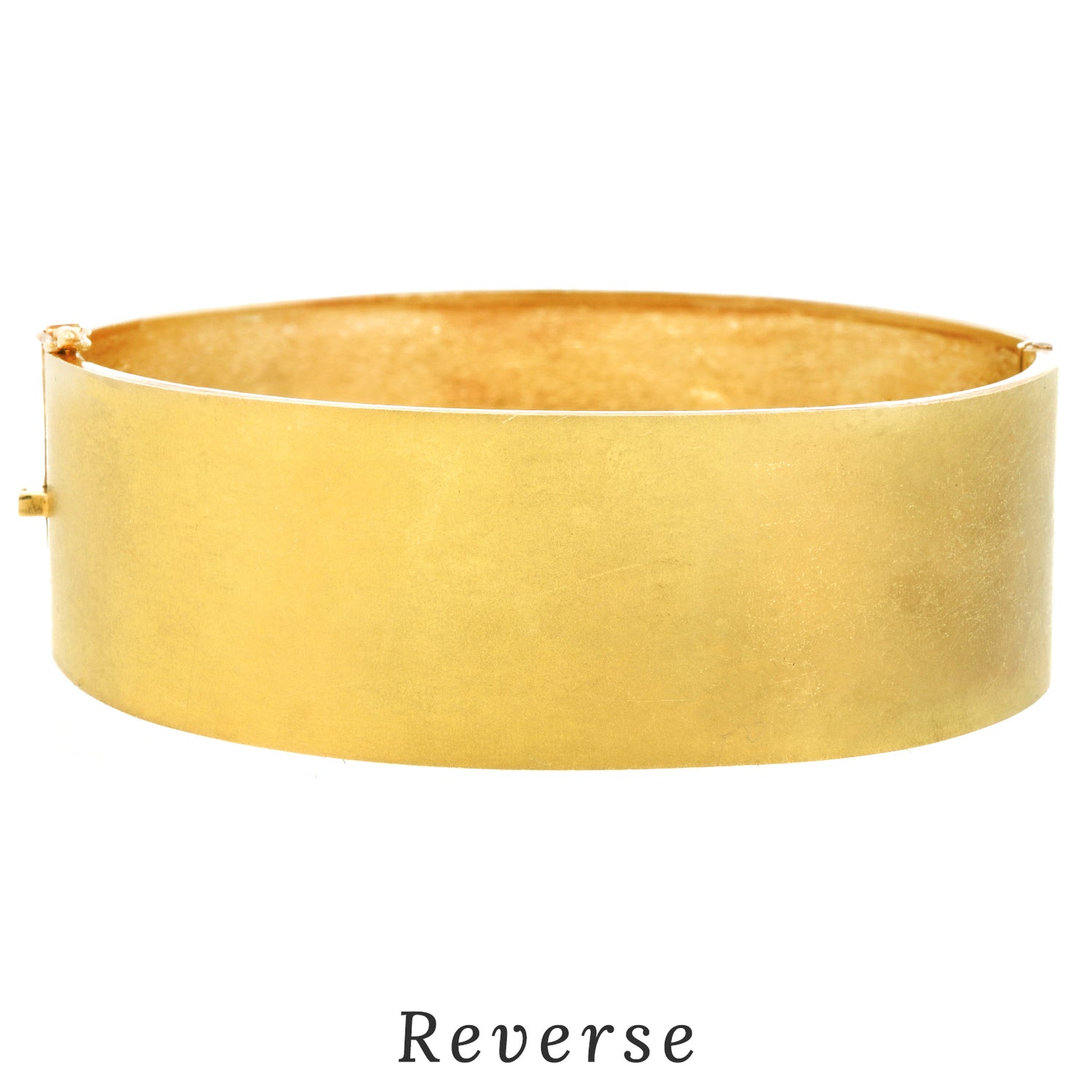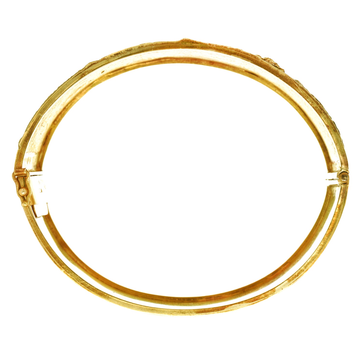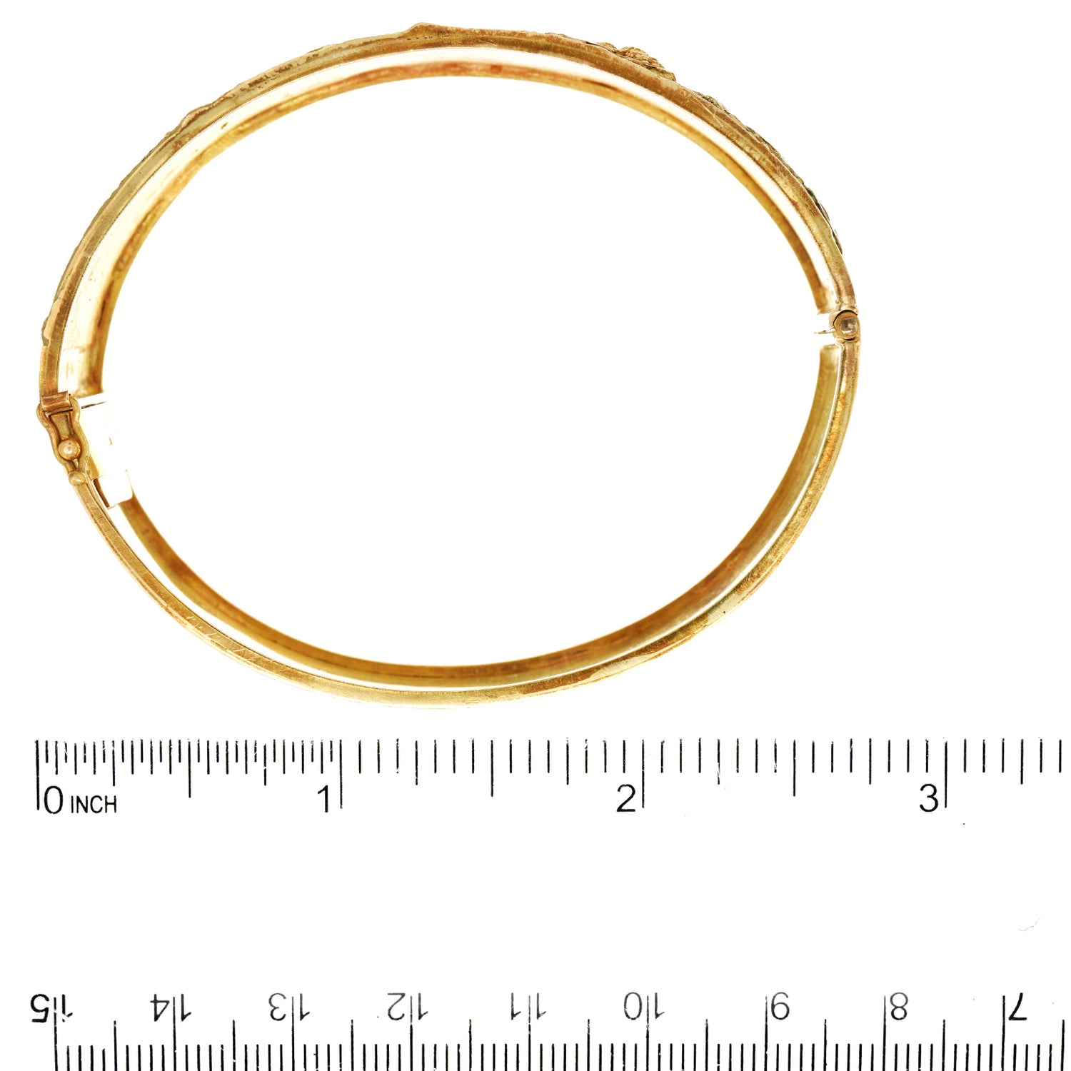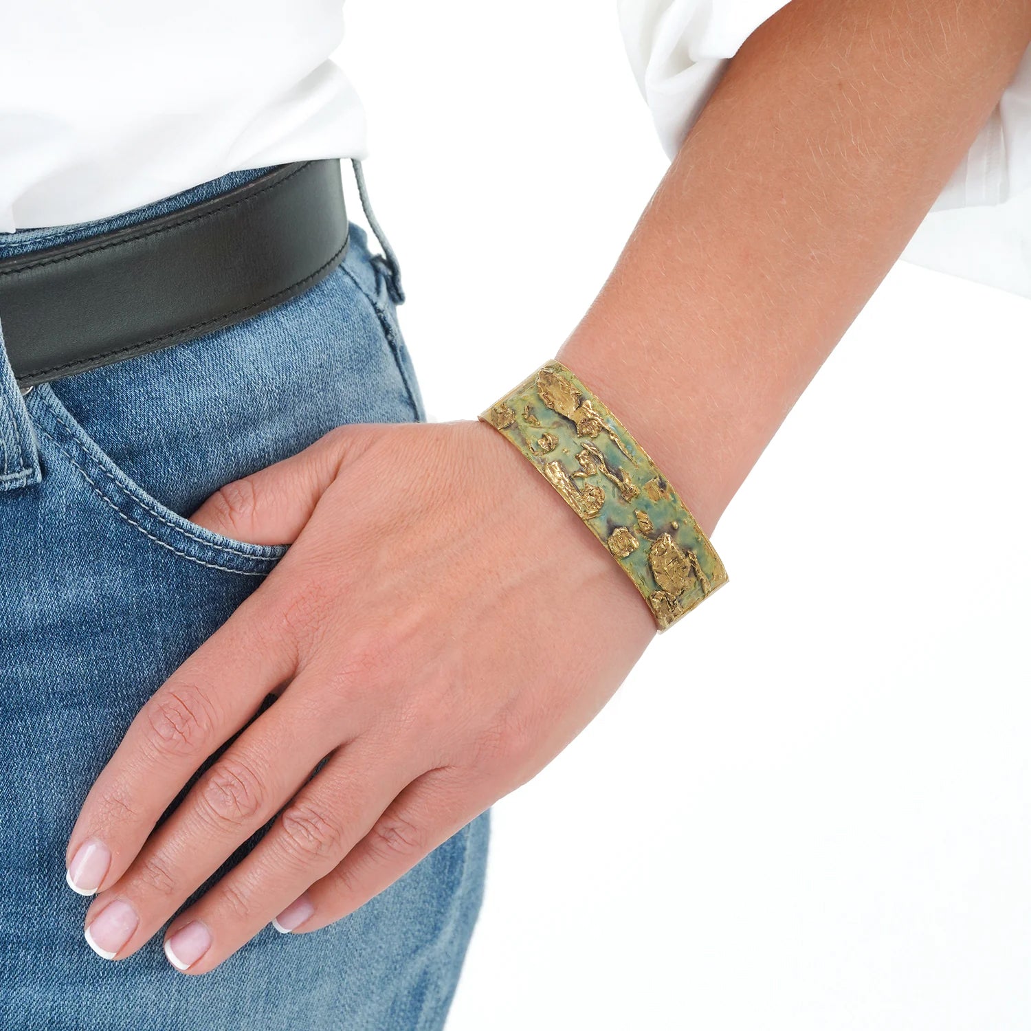 Circa 1970s, 18k, by Anton Fruhauf, Italy. This spectacular bracelet by Anton Fruhauf features beautiful blue-green enamel and spectacular organic goldwork. Famous for producing one-of-a-kind pieces with unique surfaces and sophisticated enamel work, Fruhauf was recognized as early as 1957 for his innovative modernist designs (he received numerous awards). His pieces are prized by connoisseurs and museums alike. Excellent condition.