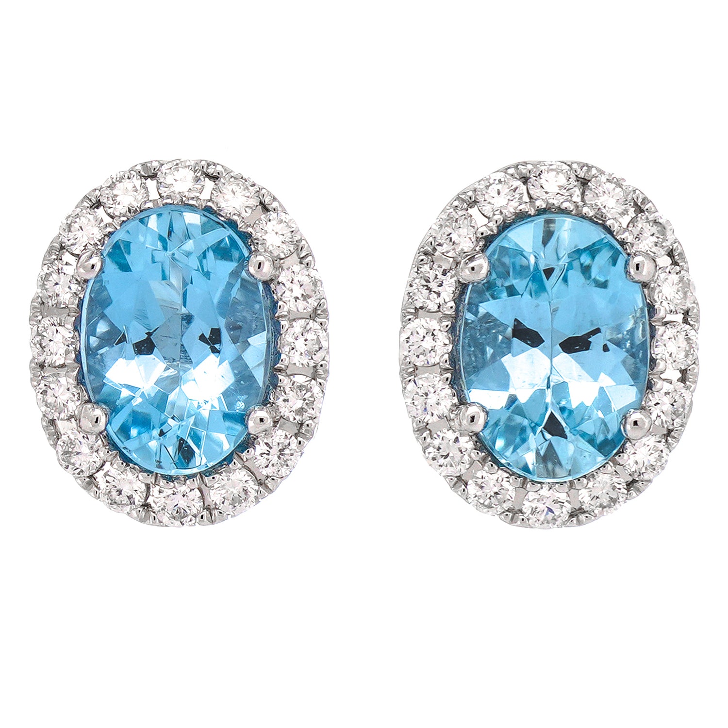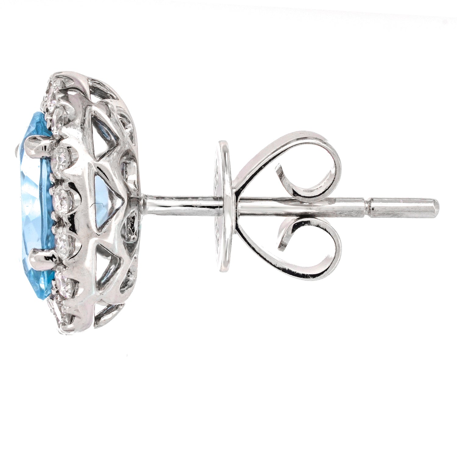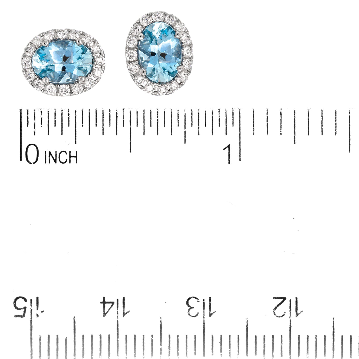 Circa 2000s, 14k, American.   Classically elegant, these 14k white gold earrings feature 1.50 carats of vibrant aquamarine, perfectly balanced with .25 carats of brilliant diamonds (H color, SI1 clarity). Fabulously versatile, they are in excellent condition.