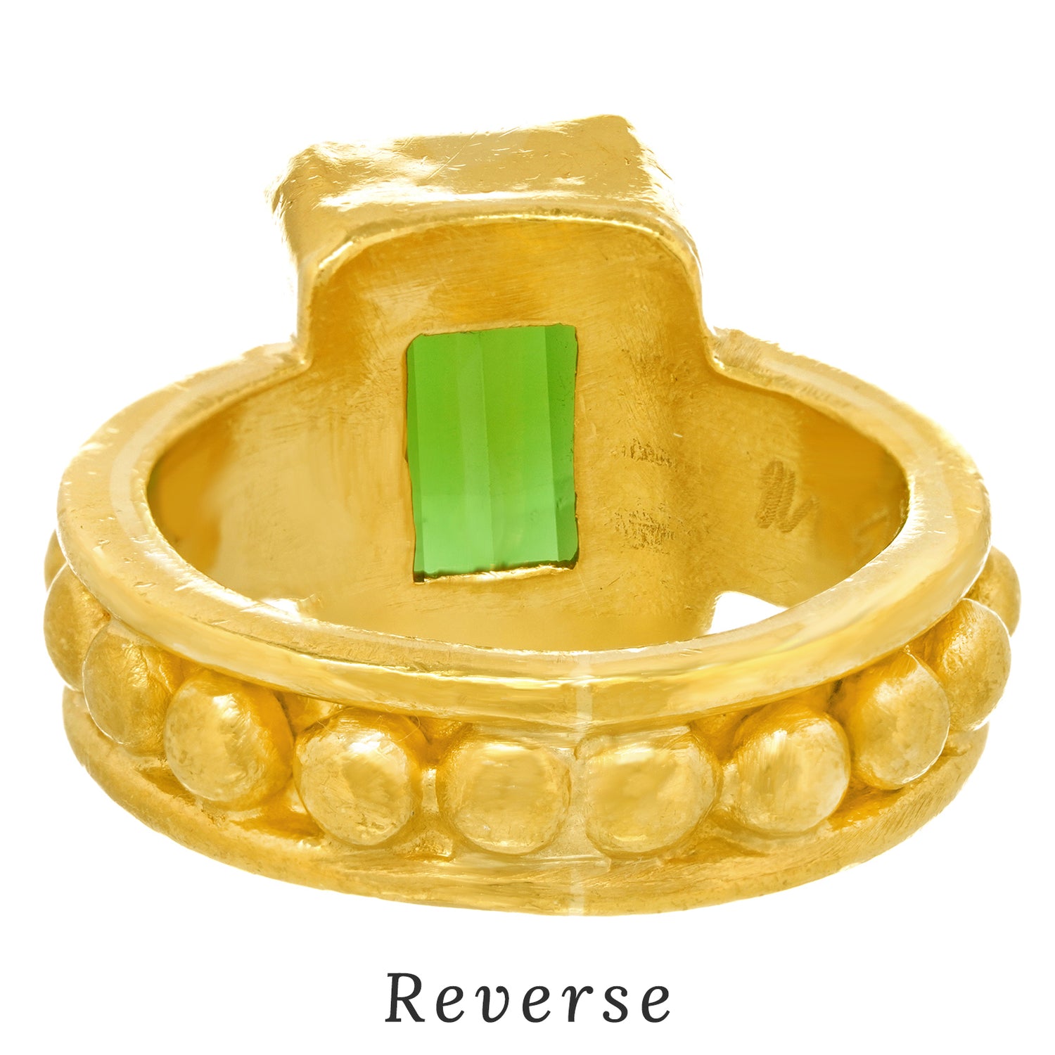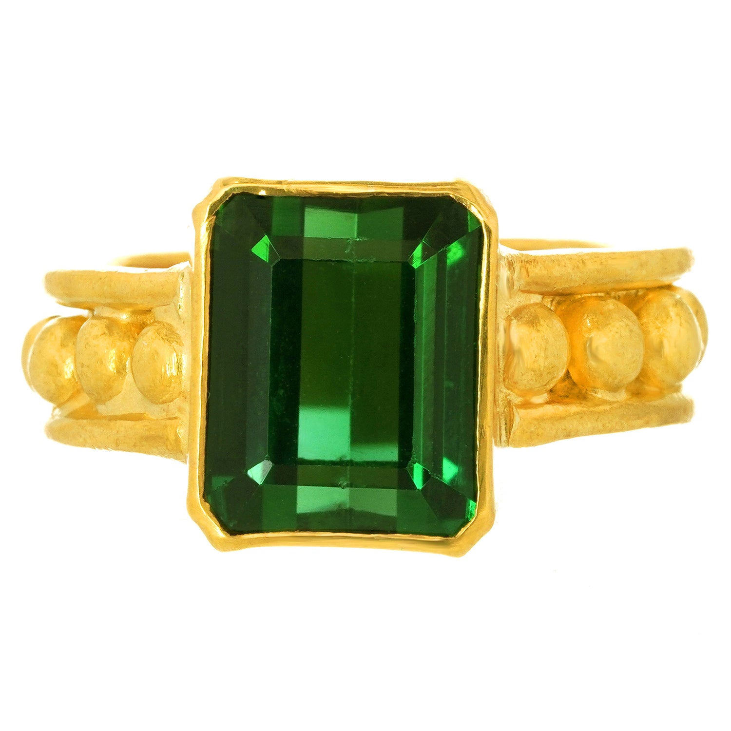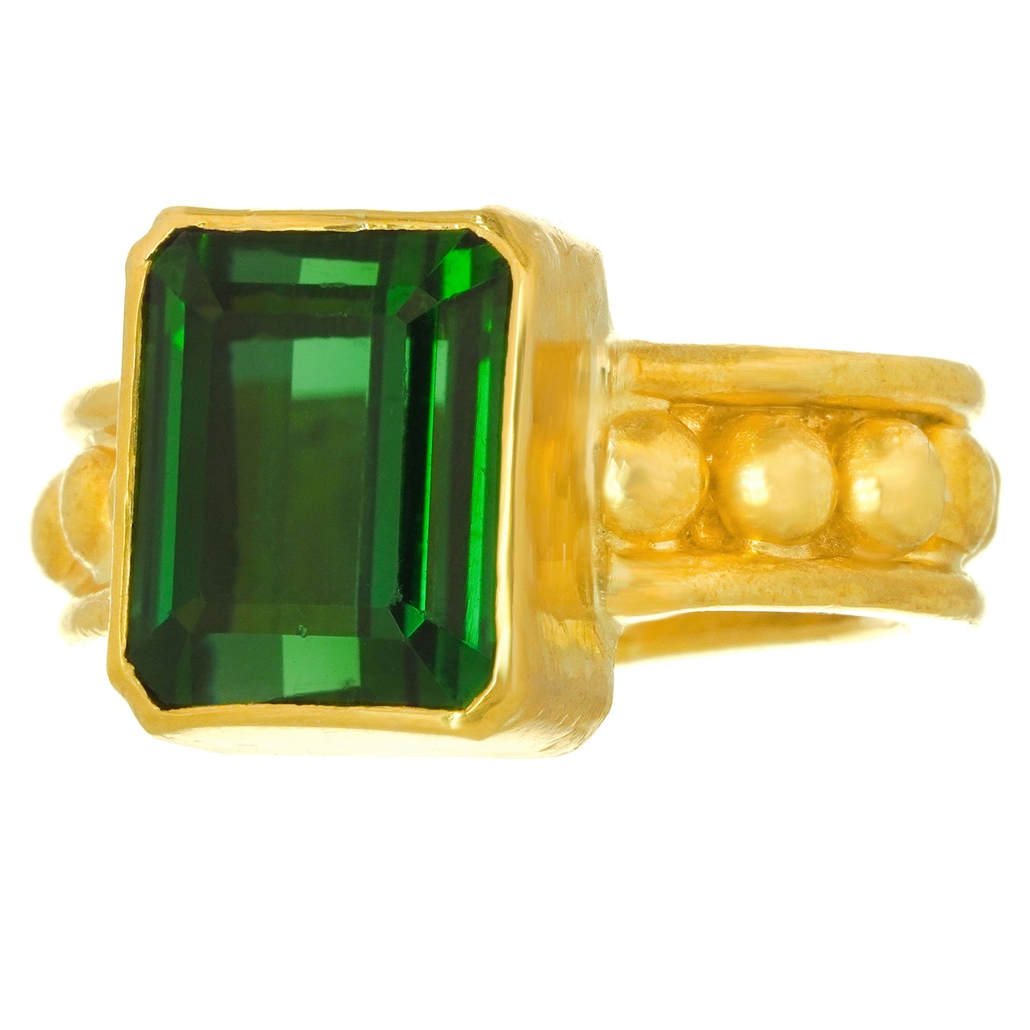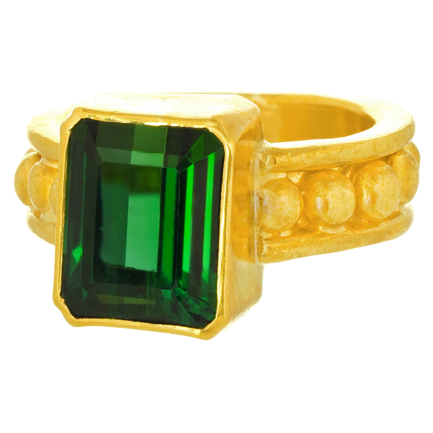 Circa 1990s, 22k, American. This chic 22k ring is set with a rich, sparkly, green tourmaline. Decorated with large bead work in organic high karat gold, the look is archaic, mystic… ancienne. Finely hand-fabricated, its casual elegance easily dresses up or down. Excellent condition.
