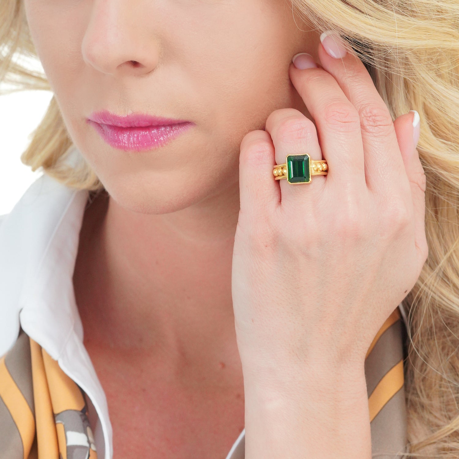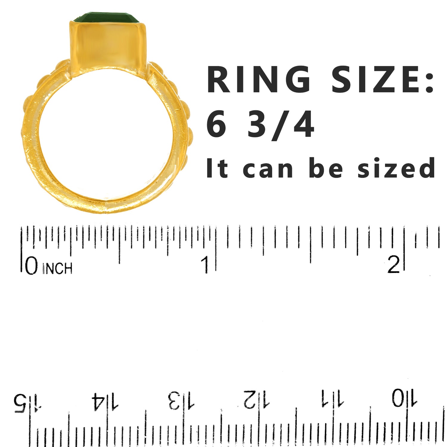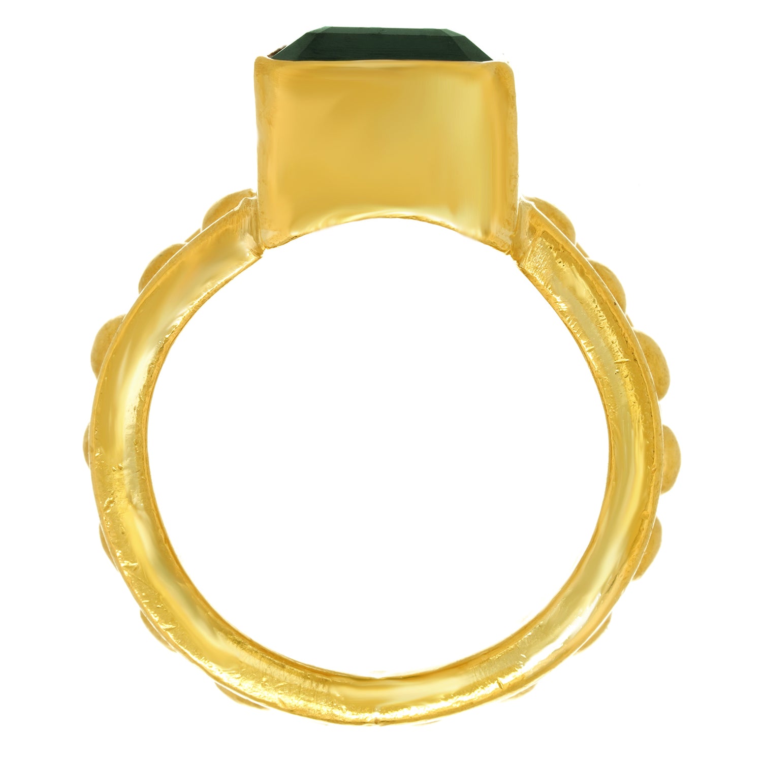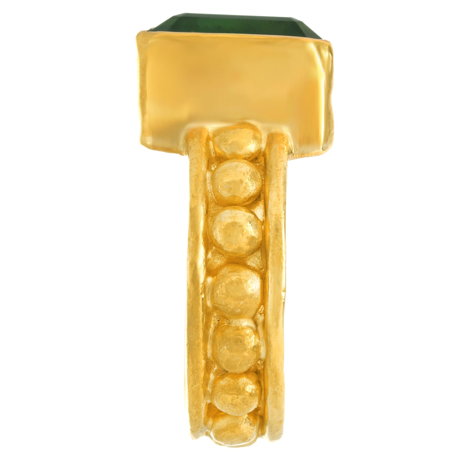 Circa 1990s, 22k, American. This chic 22k ring is set with a rich, sparkly, green tourmaline. Decorated with large bead work in organic high karat gold, the look is archaic, mystic… ancienne. Finely hand-fabricated, its casual elegance easily dresses up or down. Excellent condition.