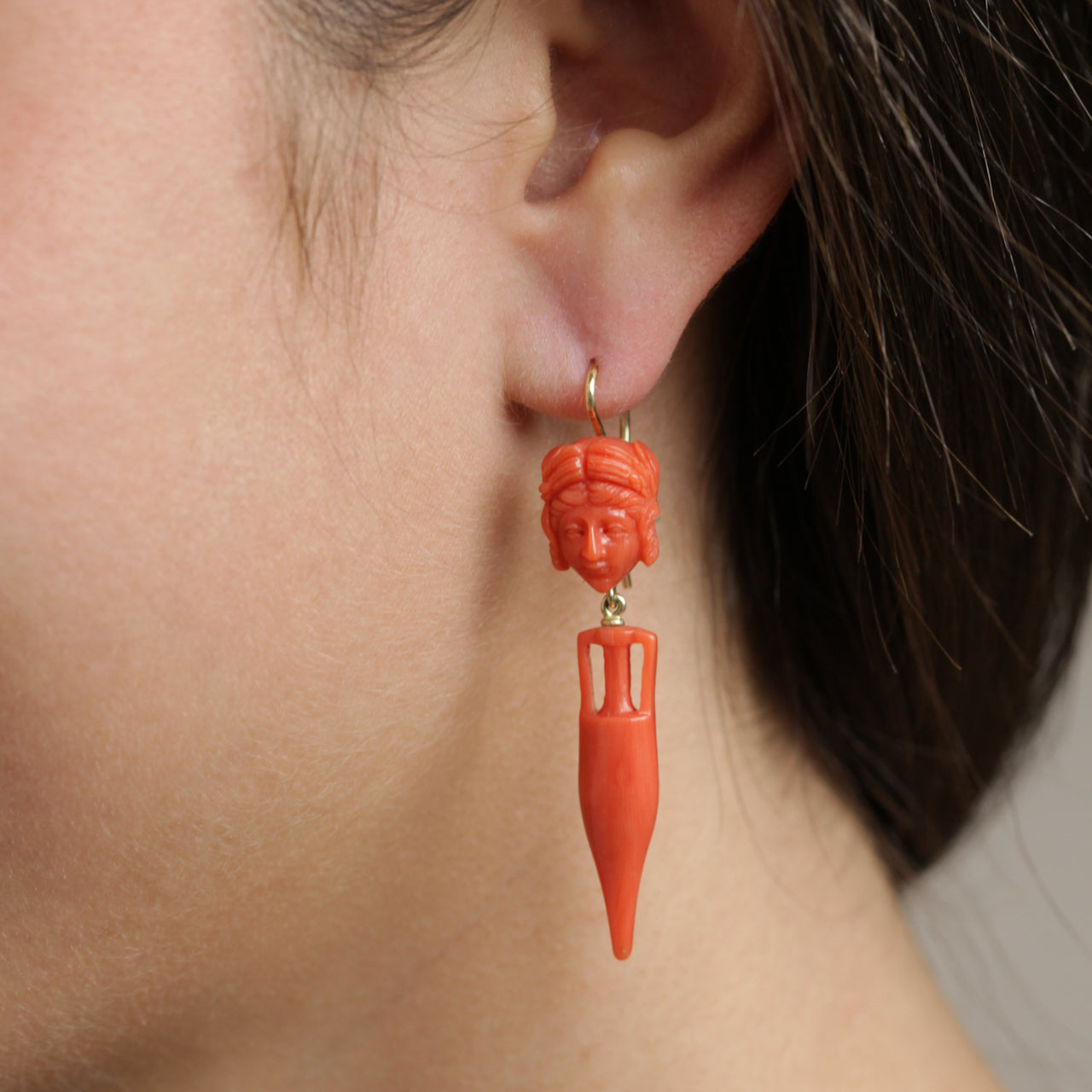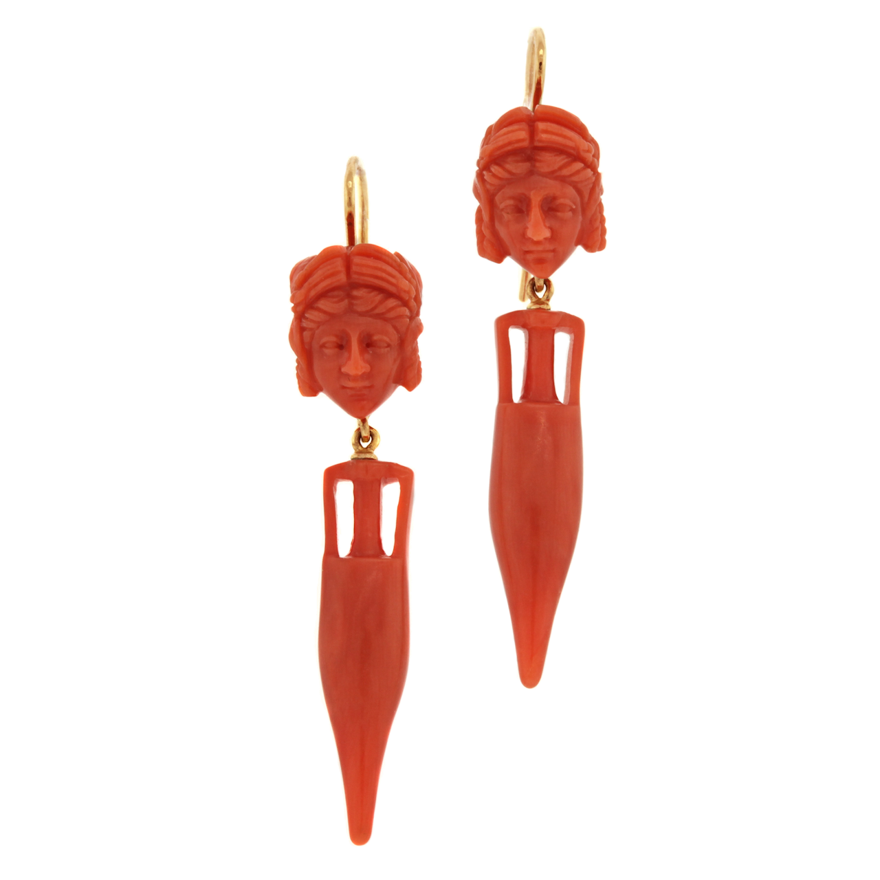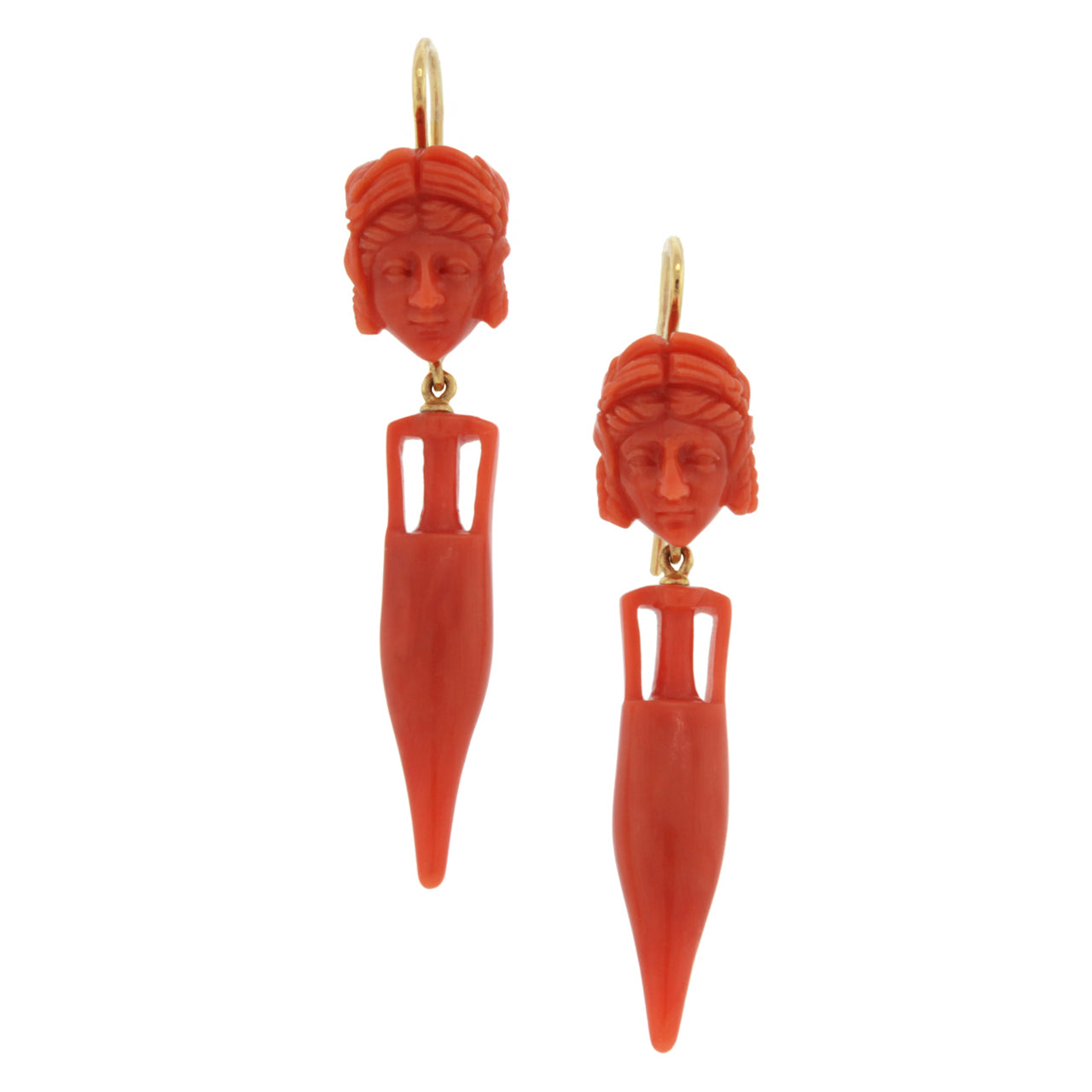 Circa 1870s, 15k, attributed to Italy. These Victorian Archeological Revival earrings feature ethereal figures carved in beautiful natural coral. The 15k gold work is meticulous. Their style is timelessly romantic. Excellent condition.