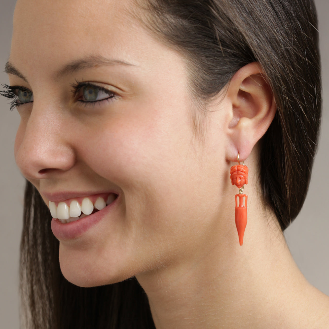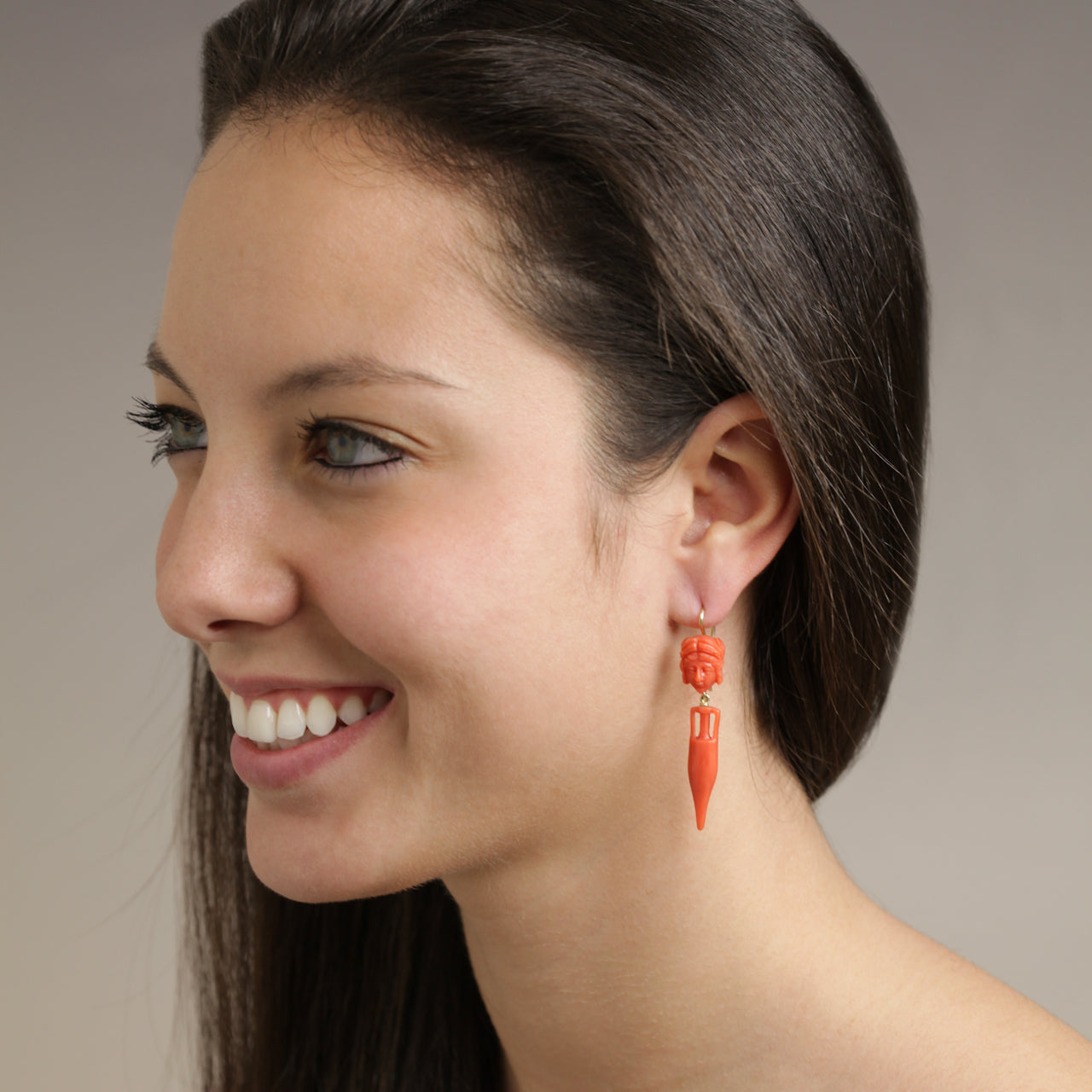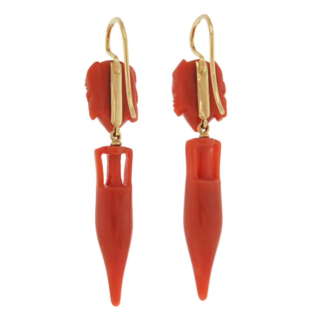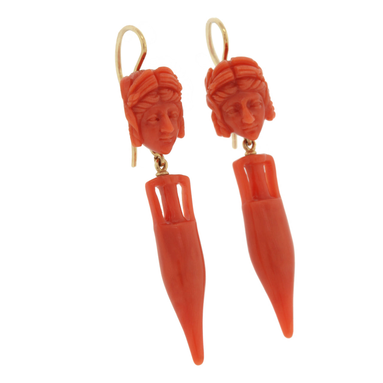 Circa 1870s, 15k, attributed to Italy. These Victorian Archeological Revival earrings feature ethereal figures carved in beautiful natural coral. The 15k gold work is meticulous. Their style is timelessly romantic. Excellent condition.