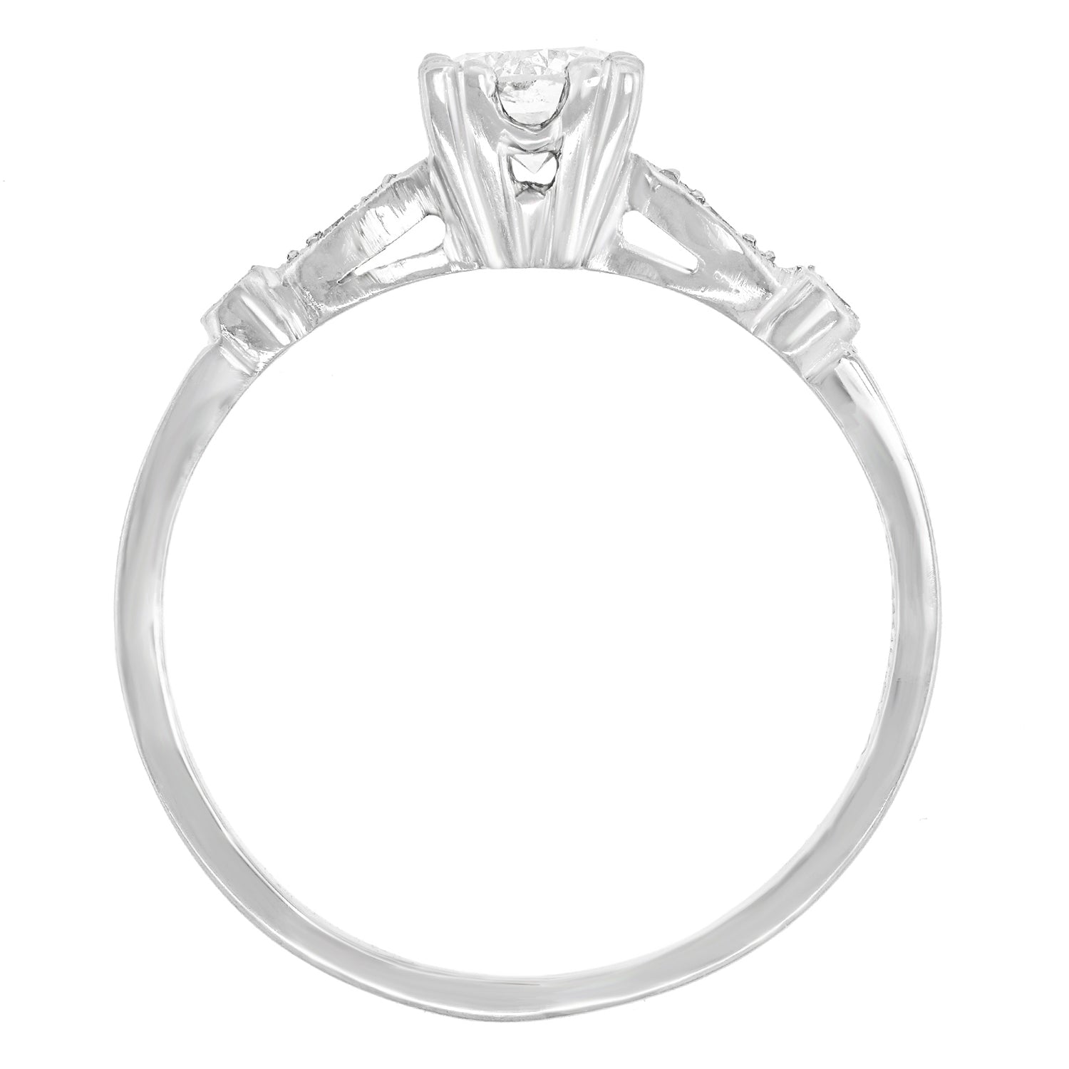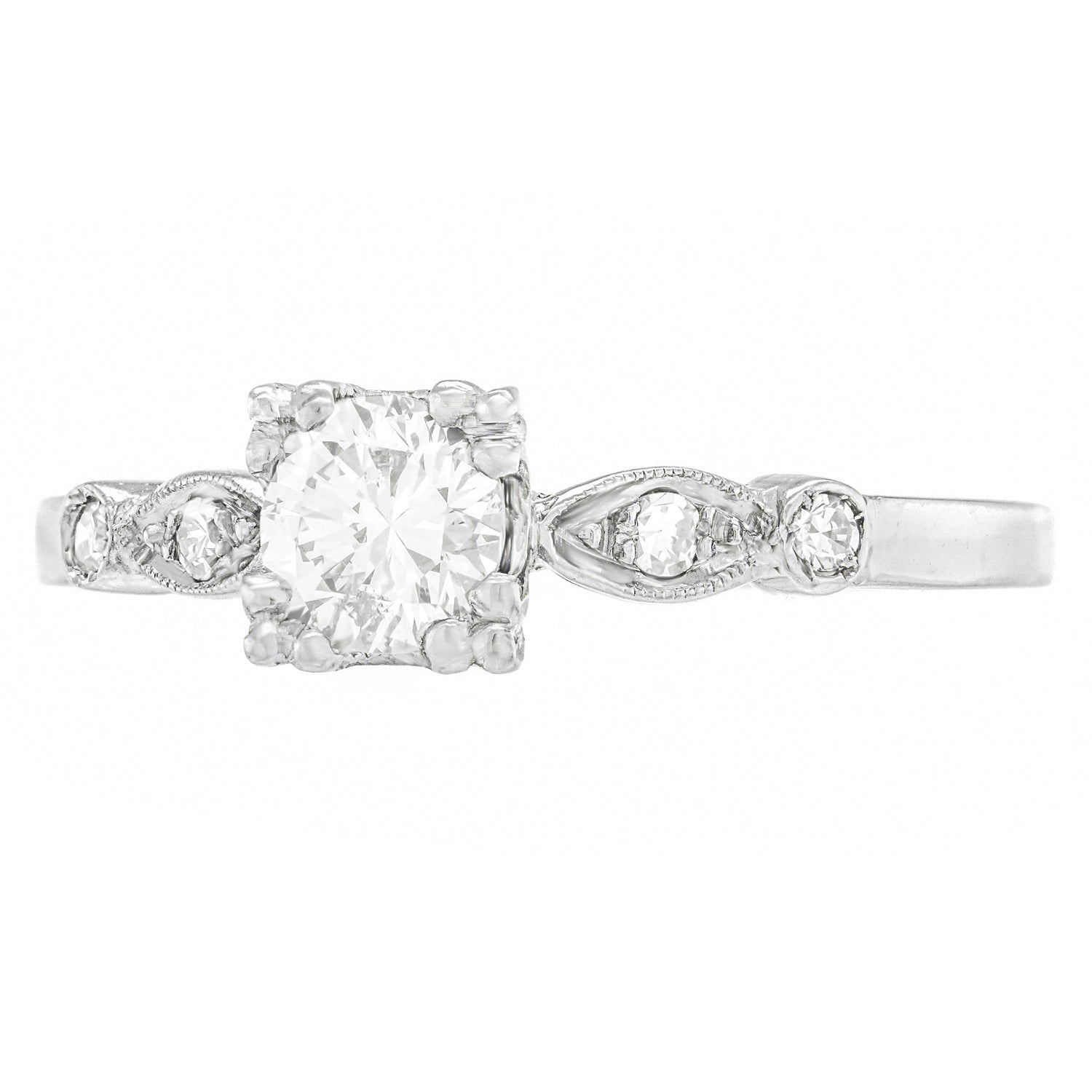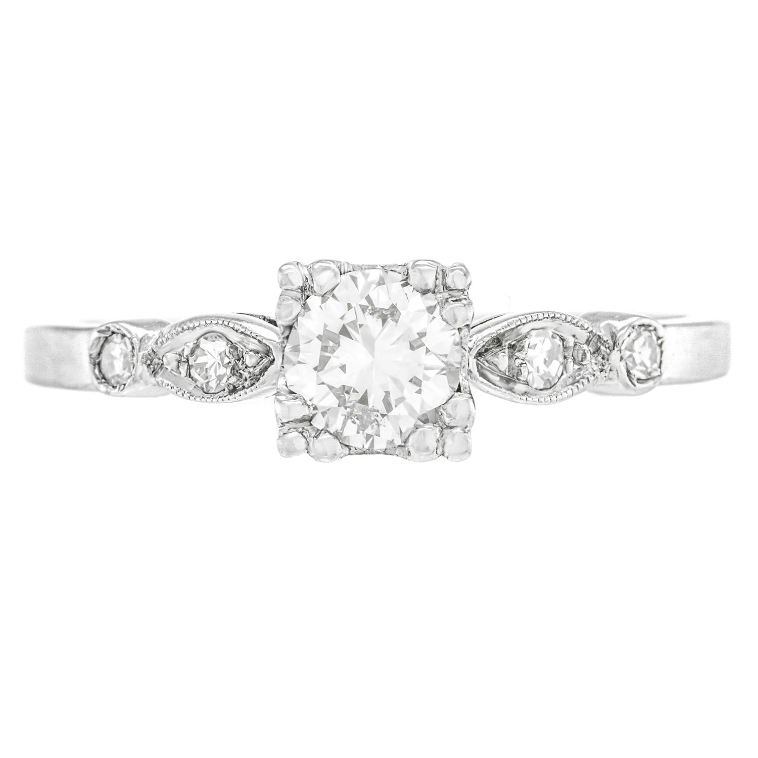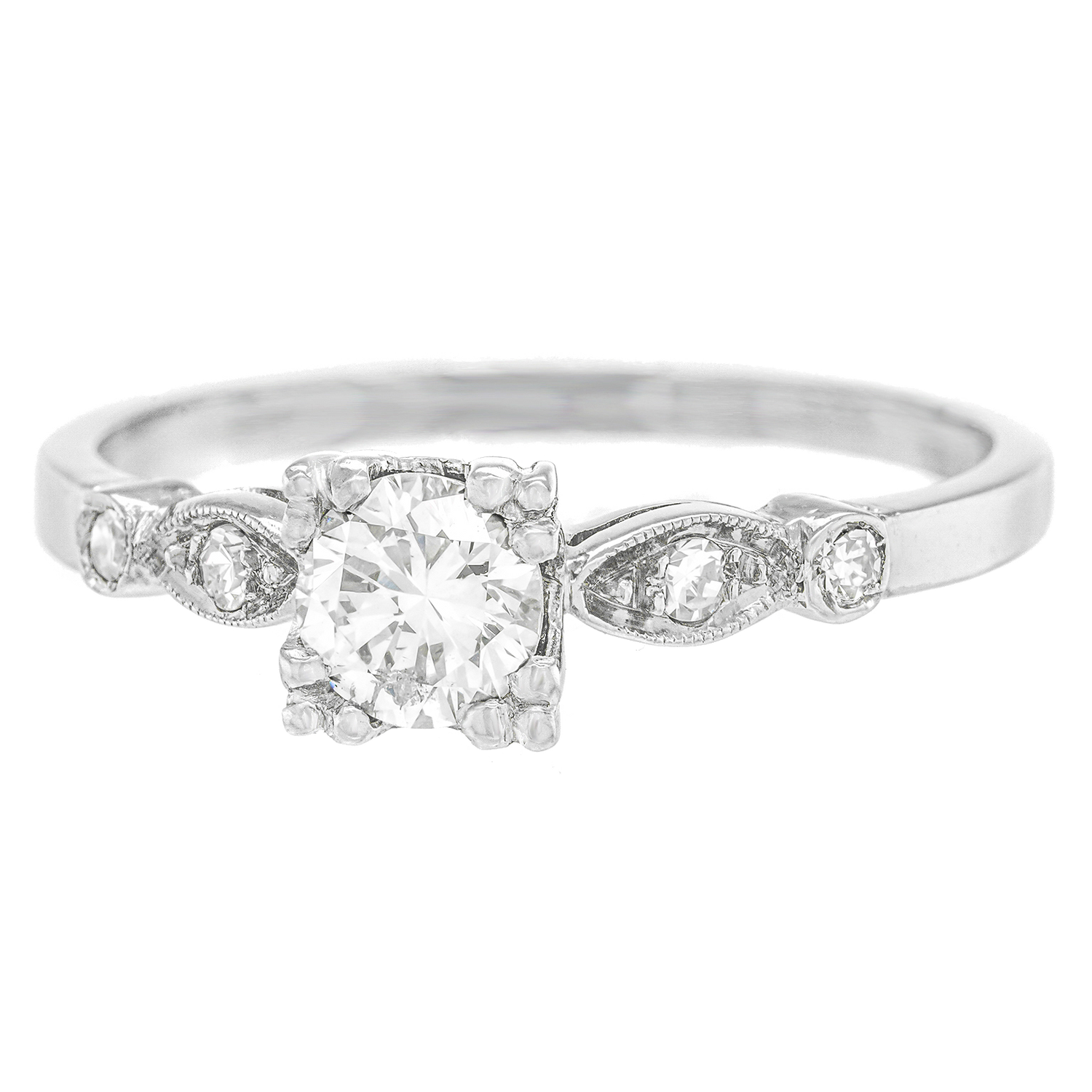 Circa 1930s, Platinum.  This delightful Art Deco engagement ring is set with a brilliant .42 carat J color, SI2 clarity center stone, and .08 carats of additional accent diamonds. With chic Art Deco lines, the look is sophisticated and unique. At 100 years old, it is an authentic Deco ring. Excellent condition.