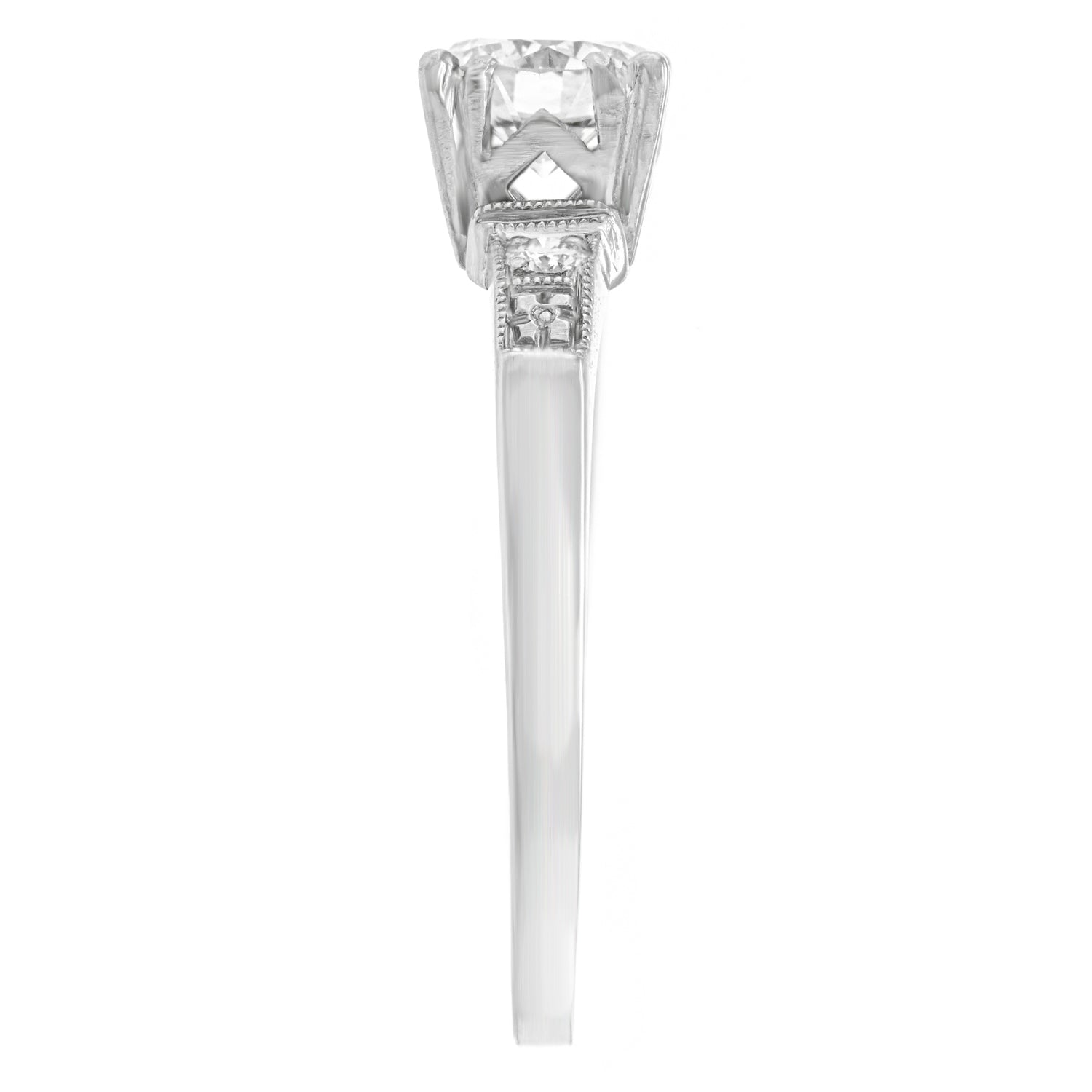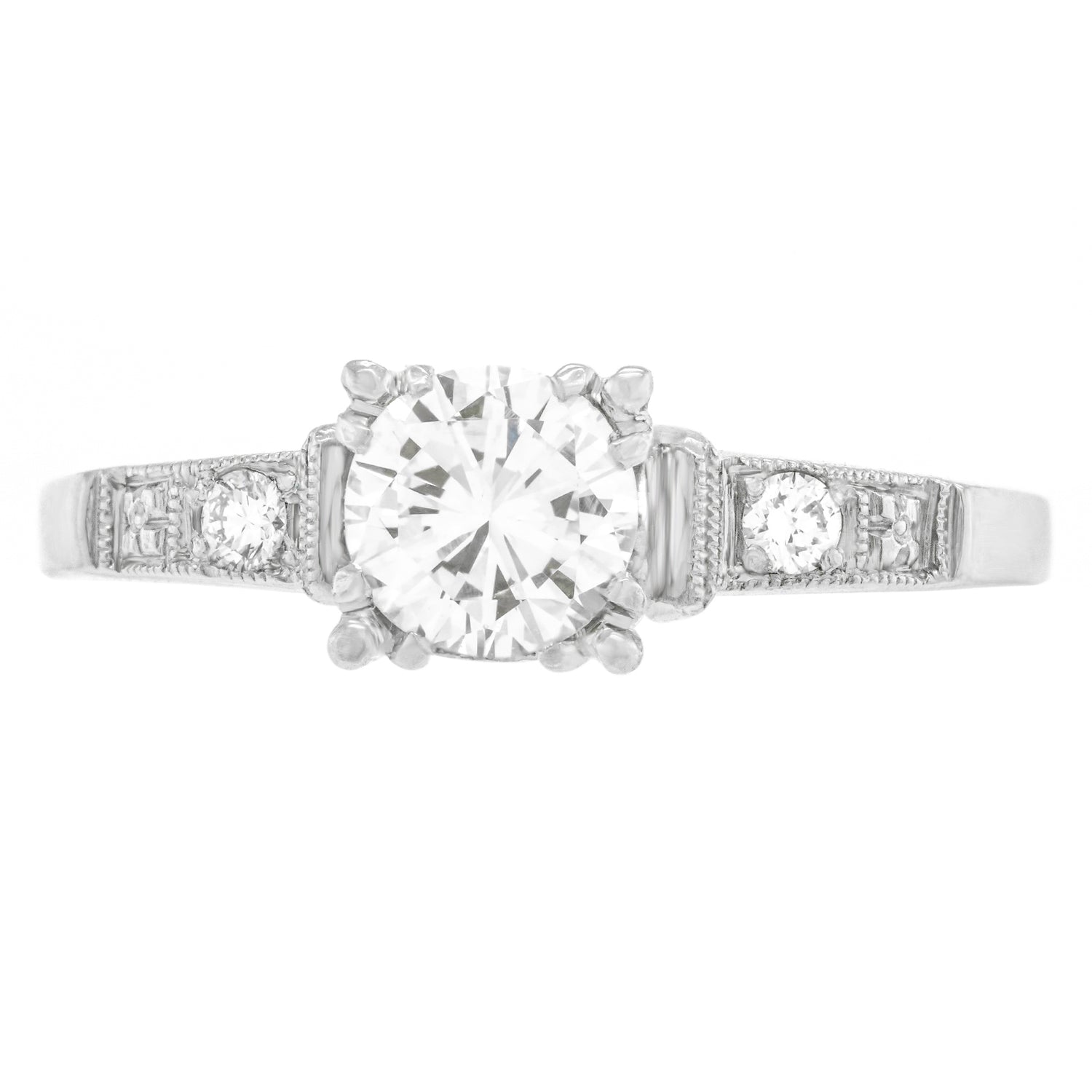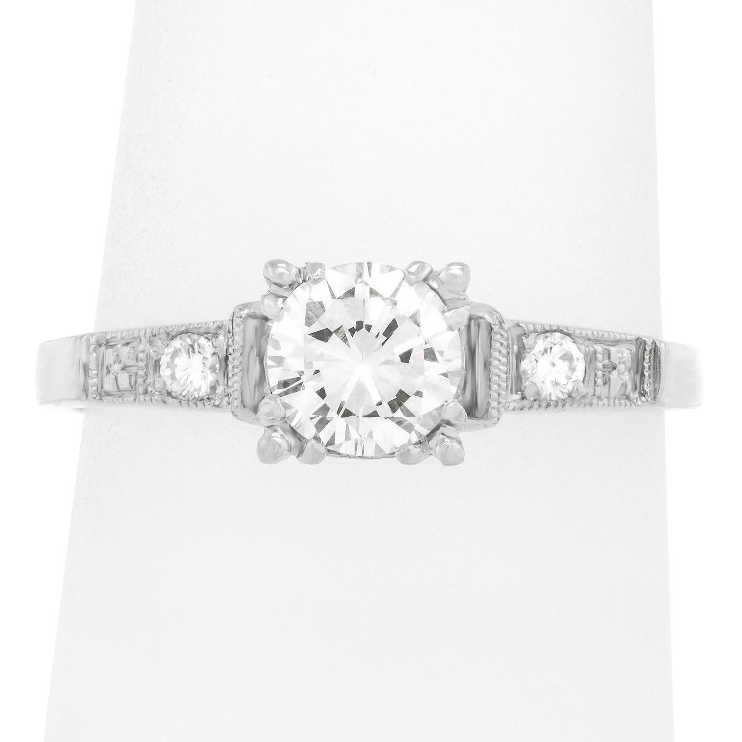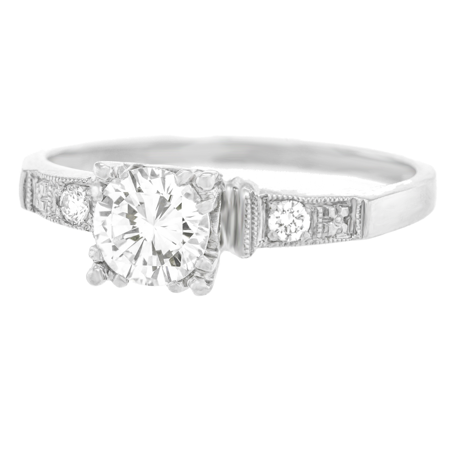 Circa 1920s, Platinum, American. This classic Art Deco engagement ring features a .59-carat diamond (J color, VS2 clarity), and an additional .06 carats of accent stones. The platinum mounting is well-made and displays a brilliantly chic look.  Excellent condition.