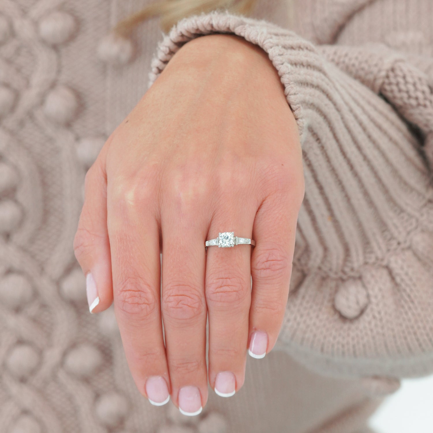 Stones: .59 carat J color, VS2 clarity diamond and .06 carats accent diamonds