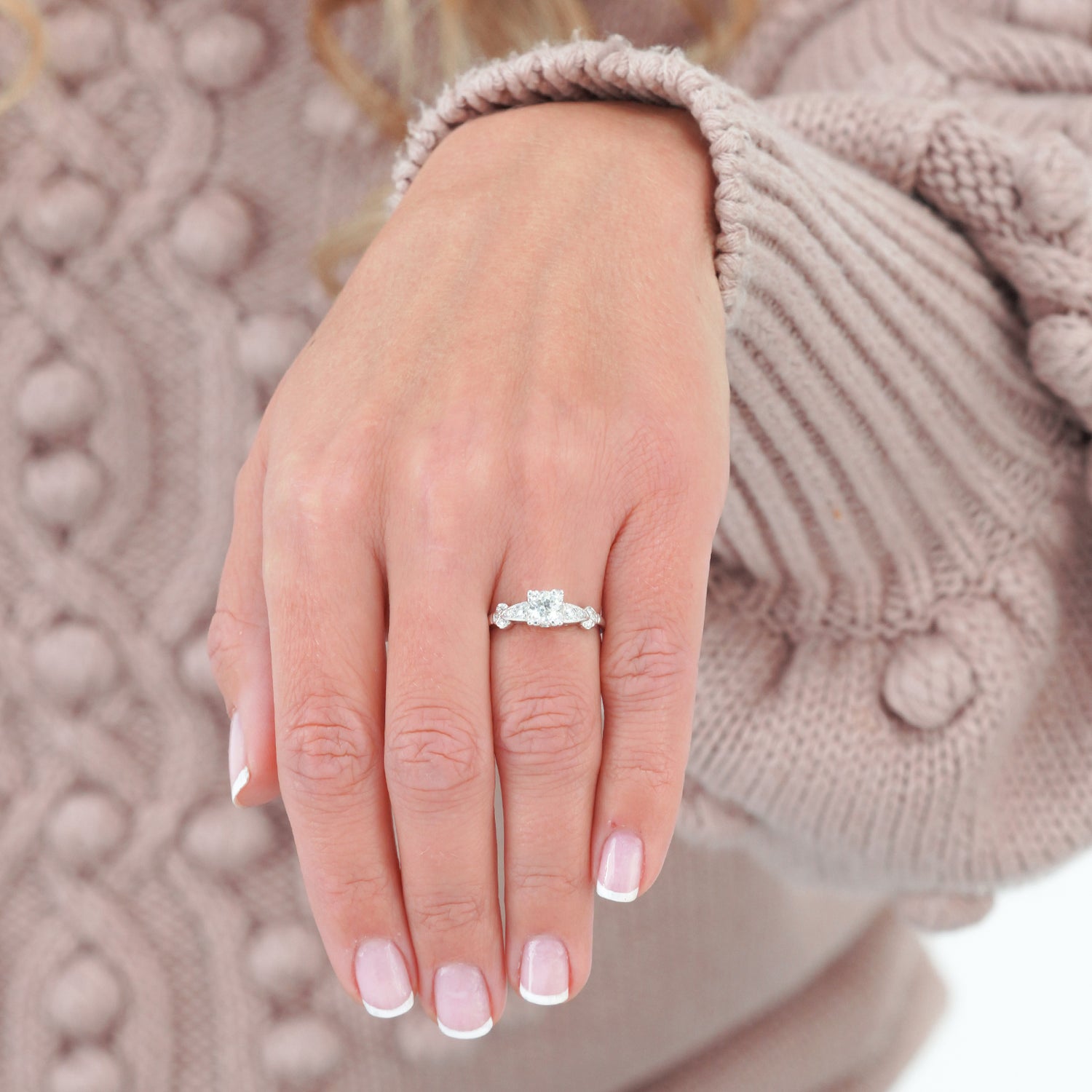 Stones: .68 carat I color, SI2 clarity diamond and .10 carats accent diamonds
