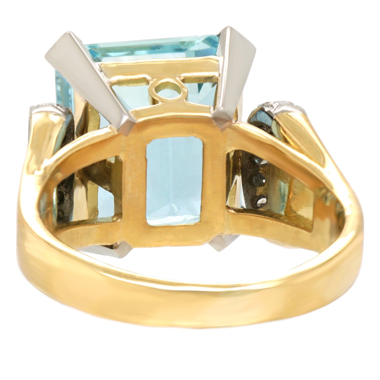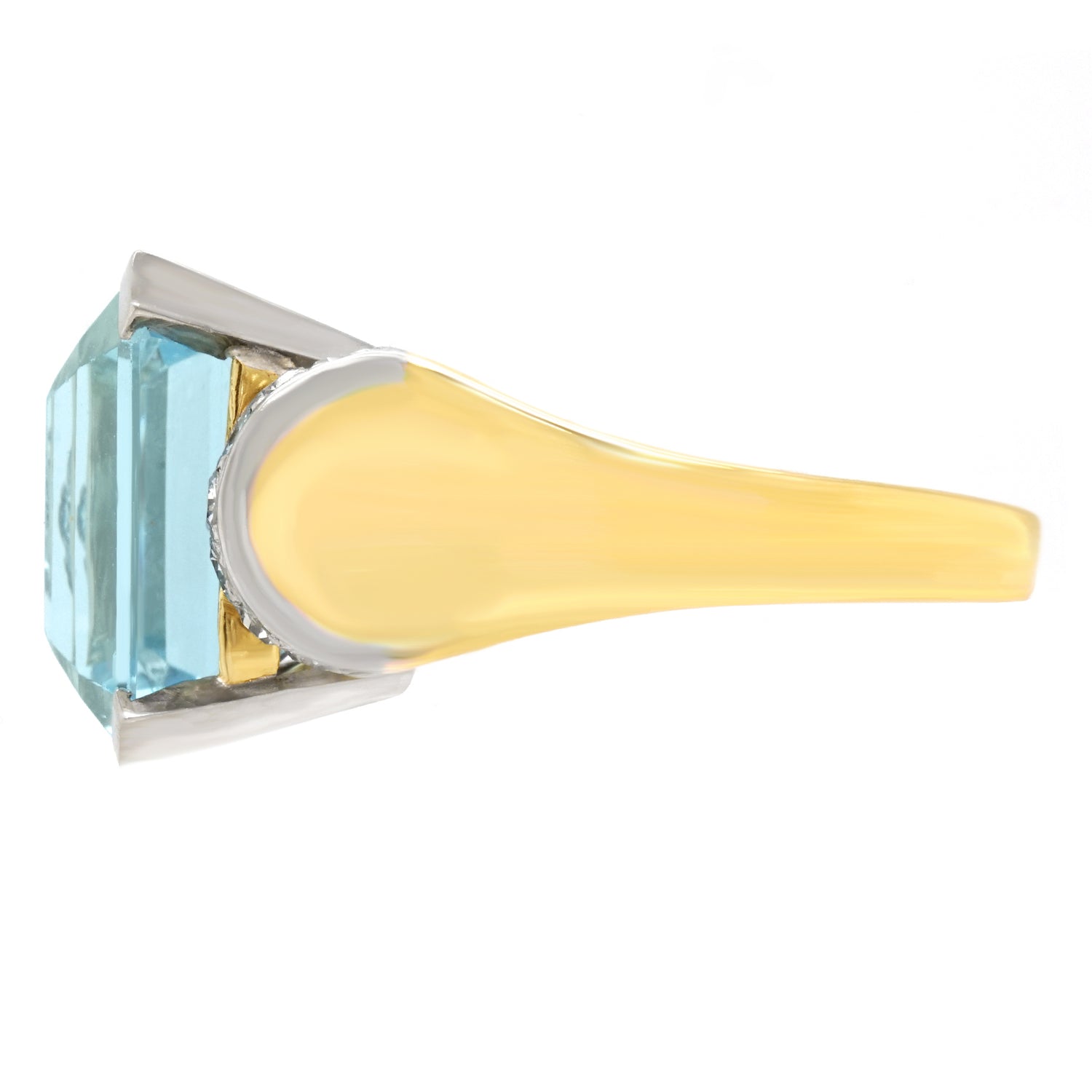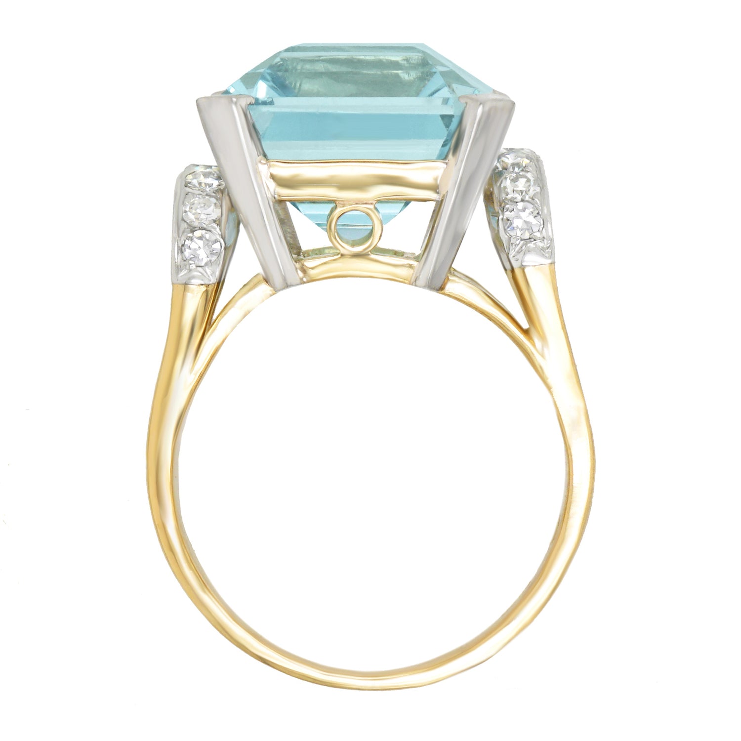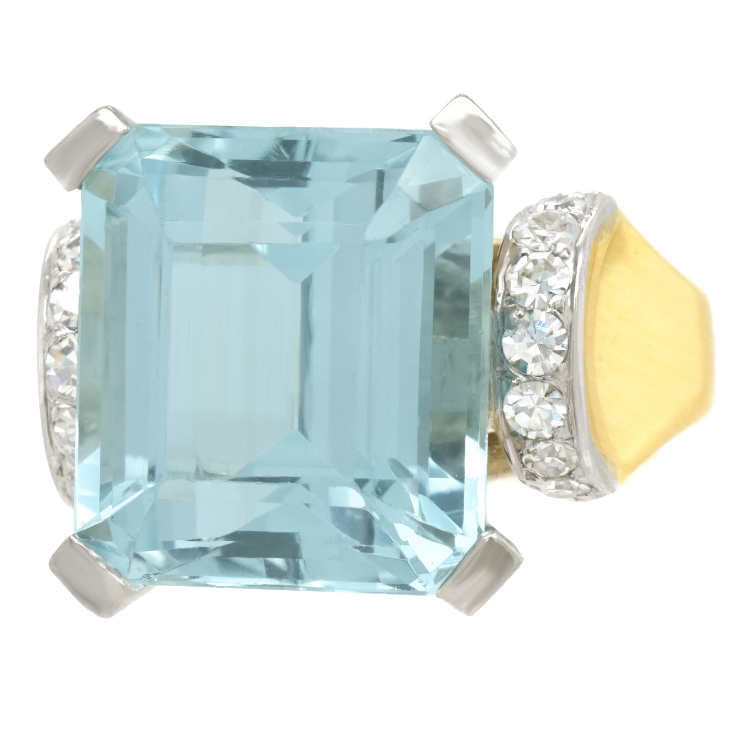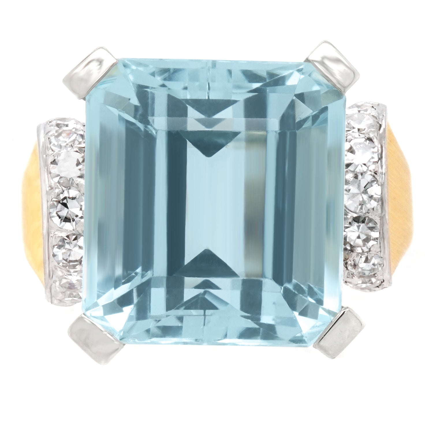 Circa 1930s, 18k, Swiss.  The bright 18k yellow gold of this thirties Deco ring perfectly complements the vivid 9.60-carat aquamarine.   Unflinchingly stylish, the look is perfectly Deco becoming Retro. Meticulously handmade with all the settings in 18k white gold and the rest of the ring in 18k yellow gold, this ring is in excellent condition.