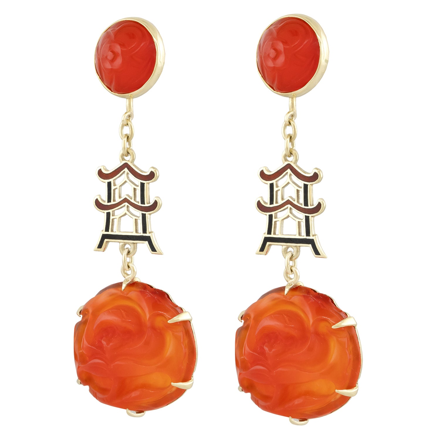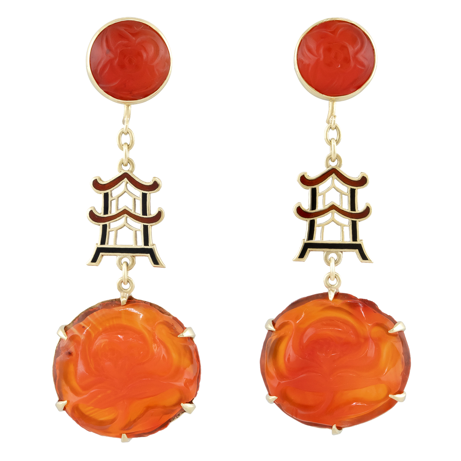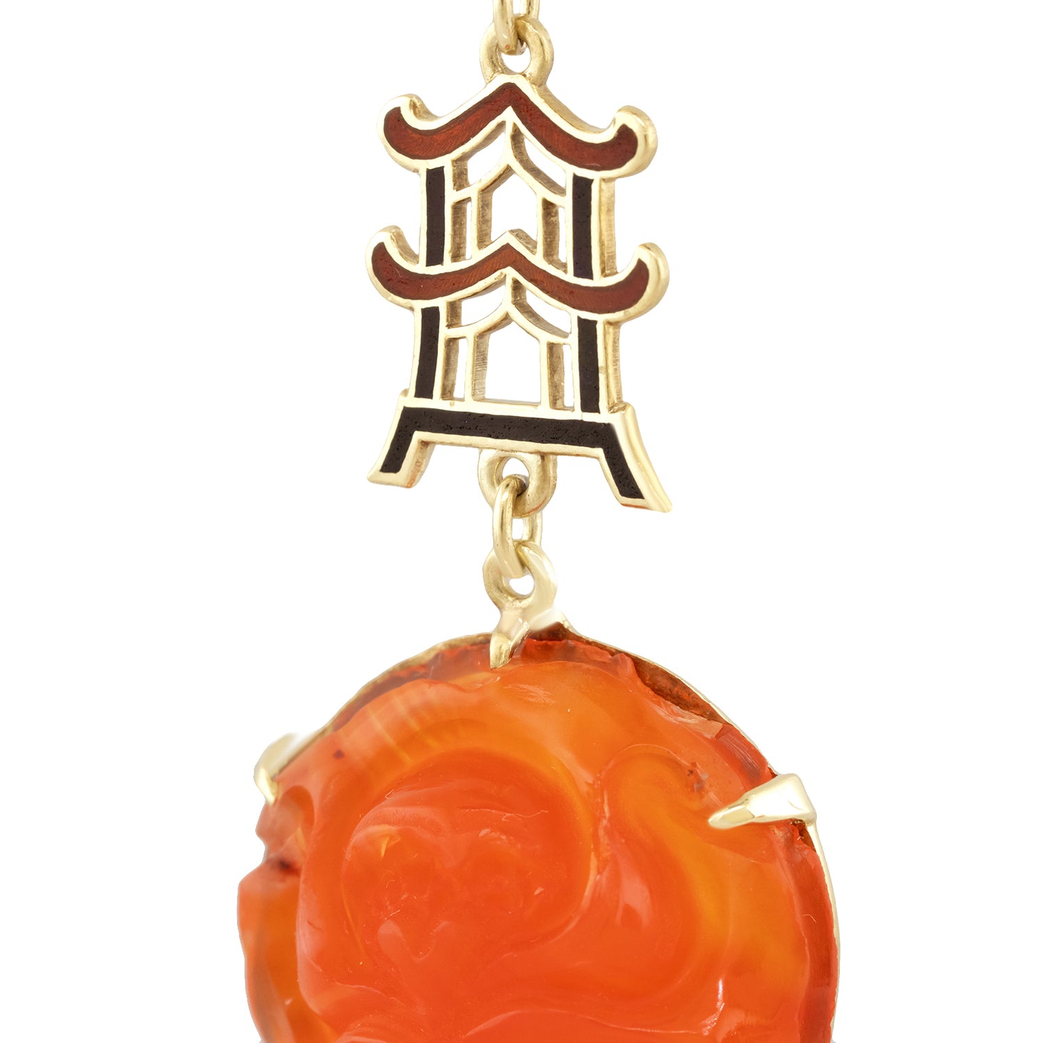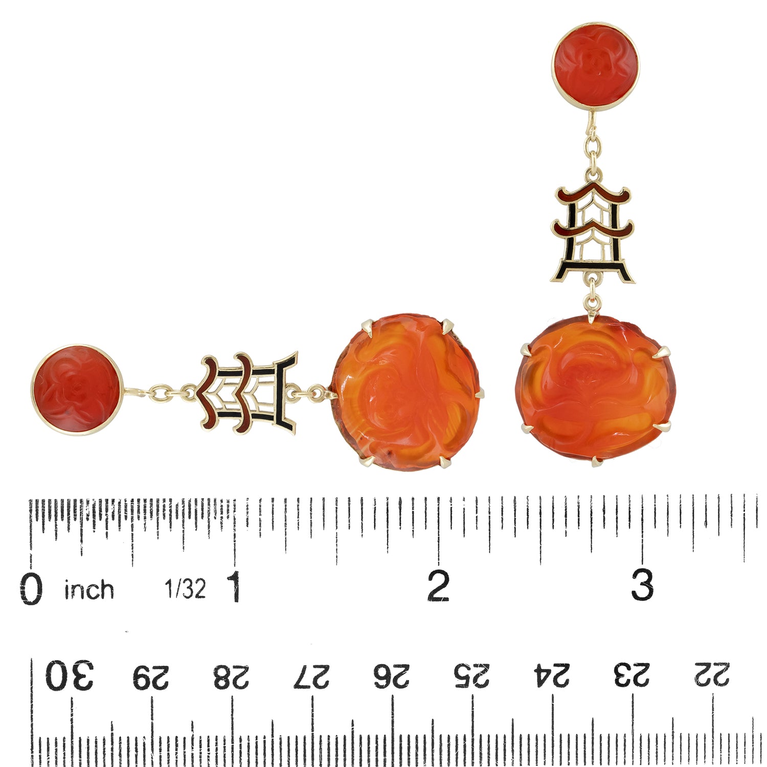 Circa 1920s, 14k, American. Styled in the Chinese taste, these fabulous twenties earrings are antique chic at its vintage best. Featuring carved carnelian stones and whimsical enameled pagodas, these earrings are in excellent condition.