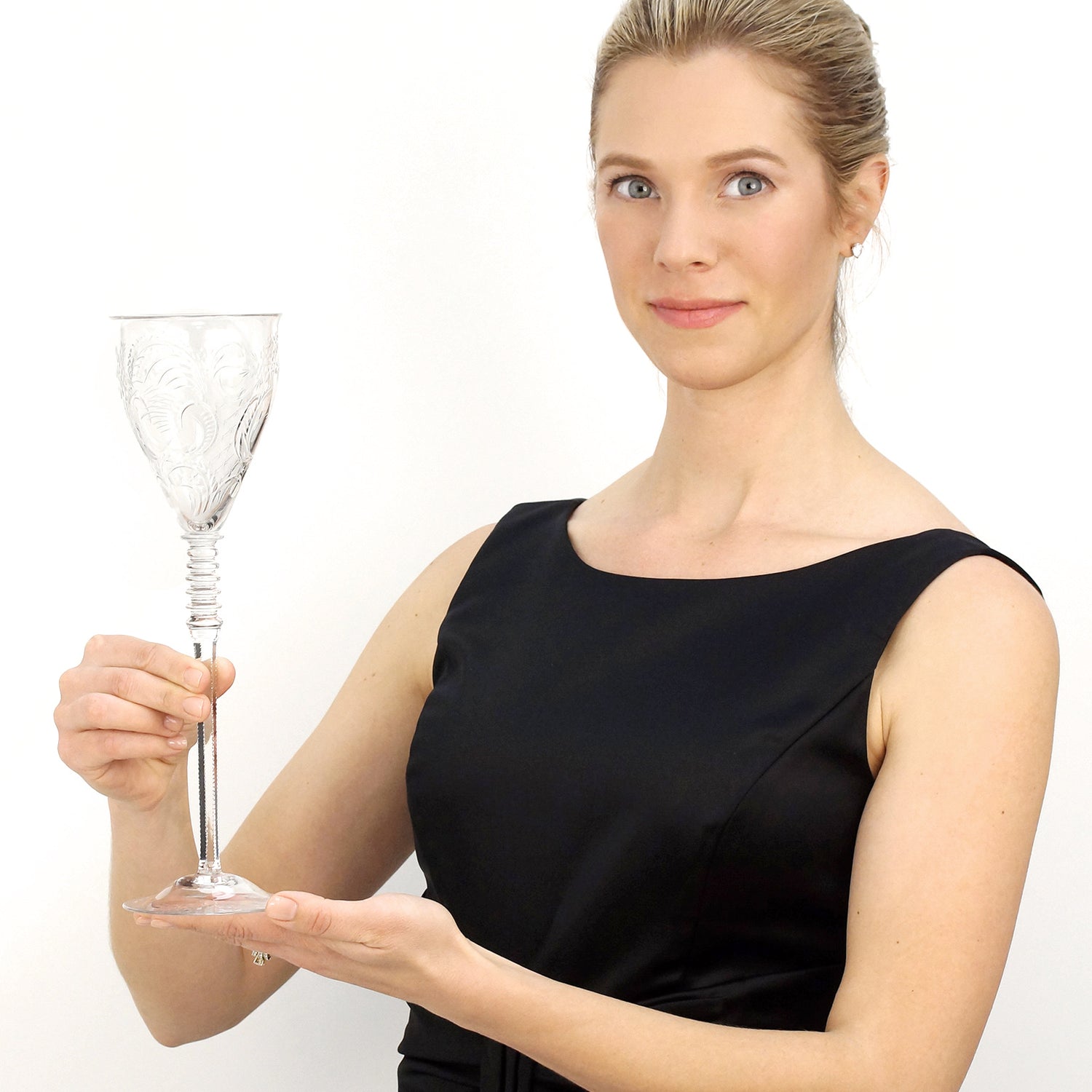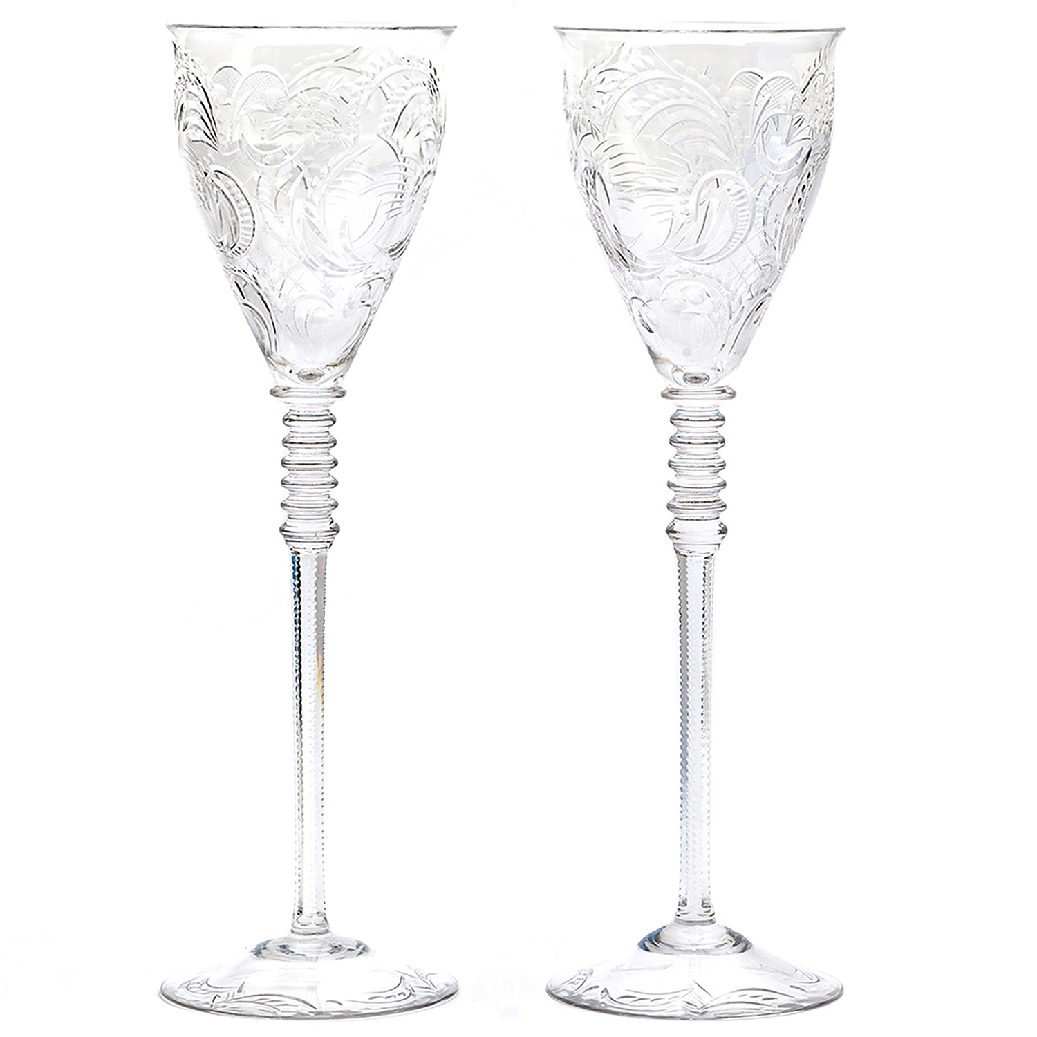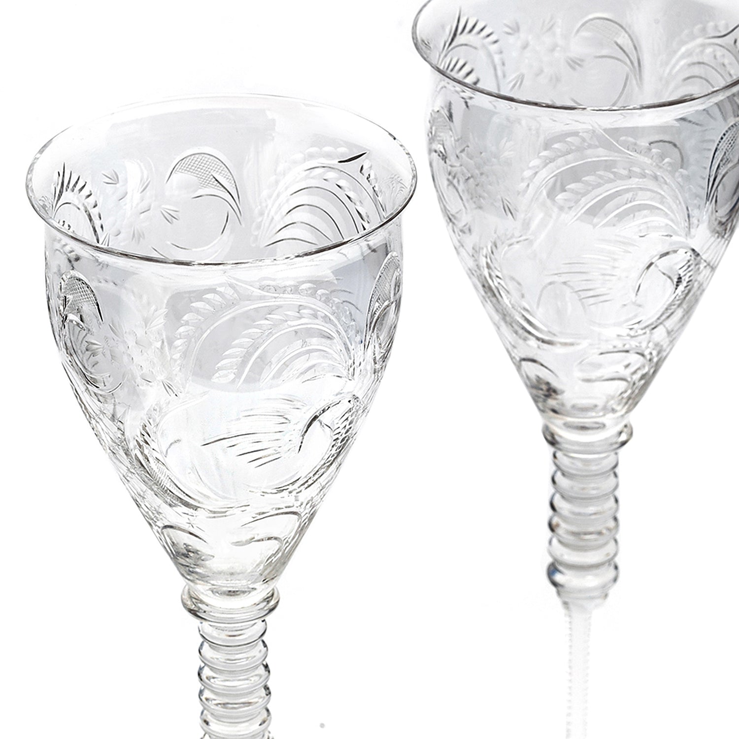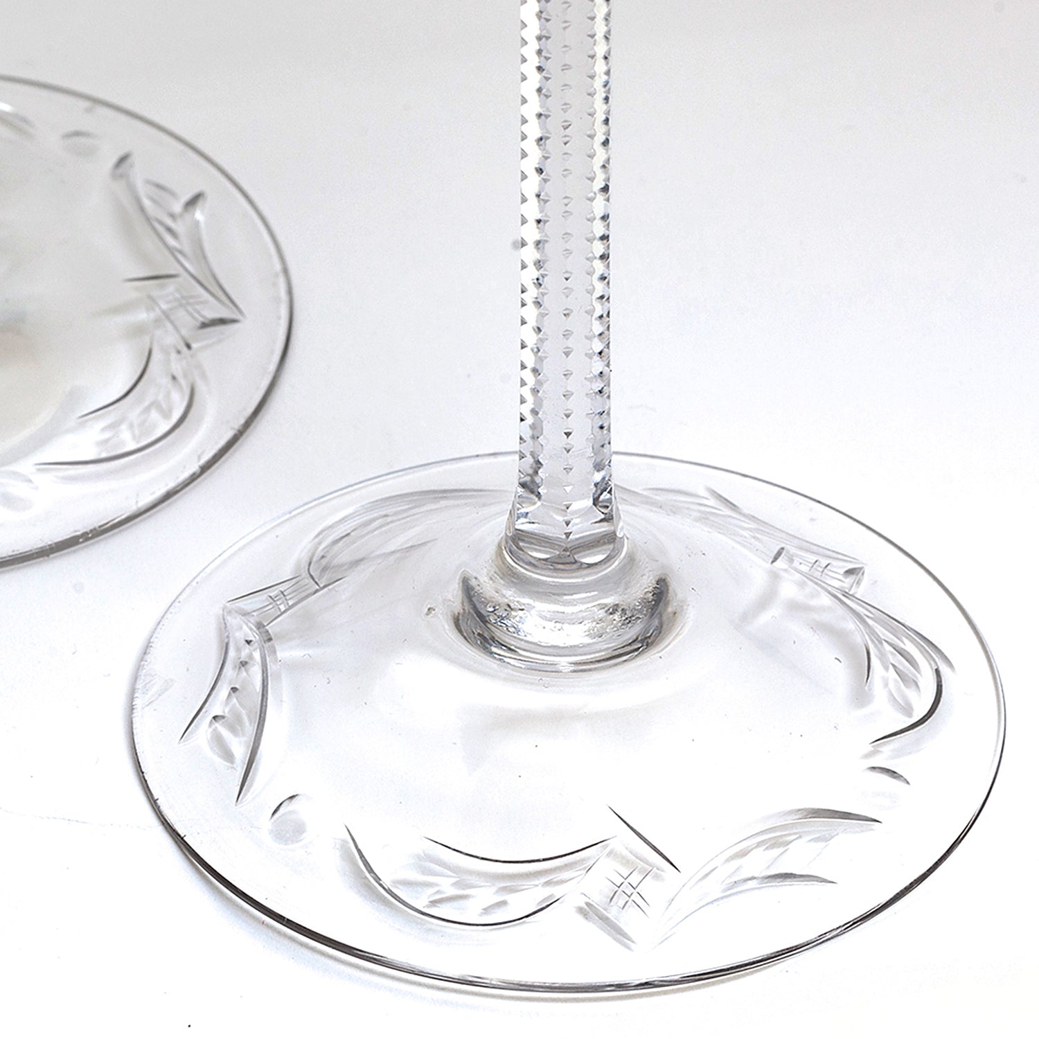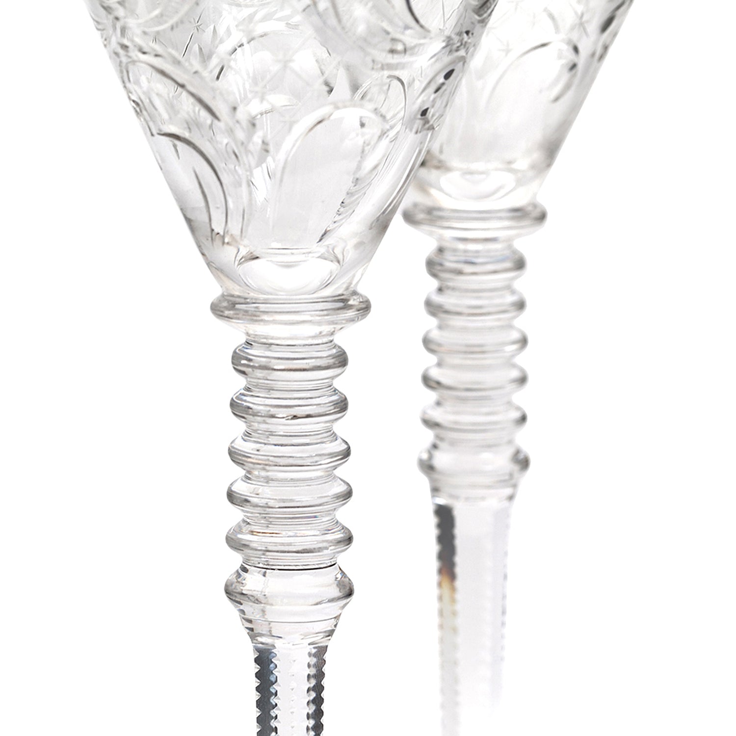 Circa 1920s, attributed Austria. These sublime, amazingly tall (11 3/4 inches) crystal water goblets, with their dramatic Art Deco silhouette and intricately-cut design, set a spectacular table. They are of the highest quality, with details that are well laid out and sharply executed. Balanced and comfortable to hold, these glasses are great for water, perfect for wine, and a pleasure to drink from.