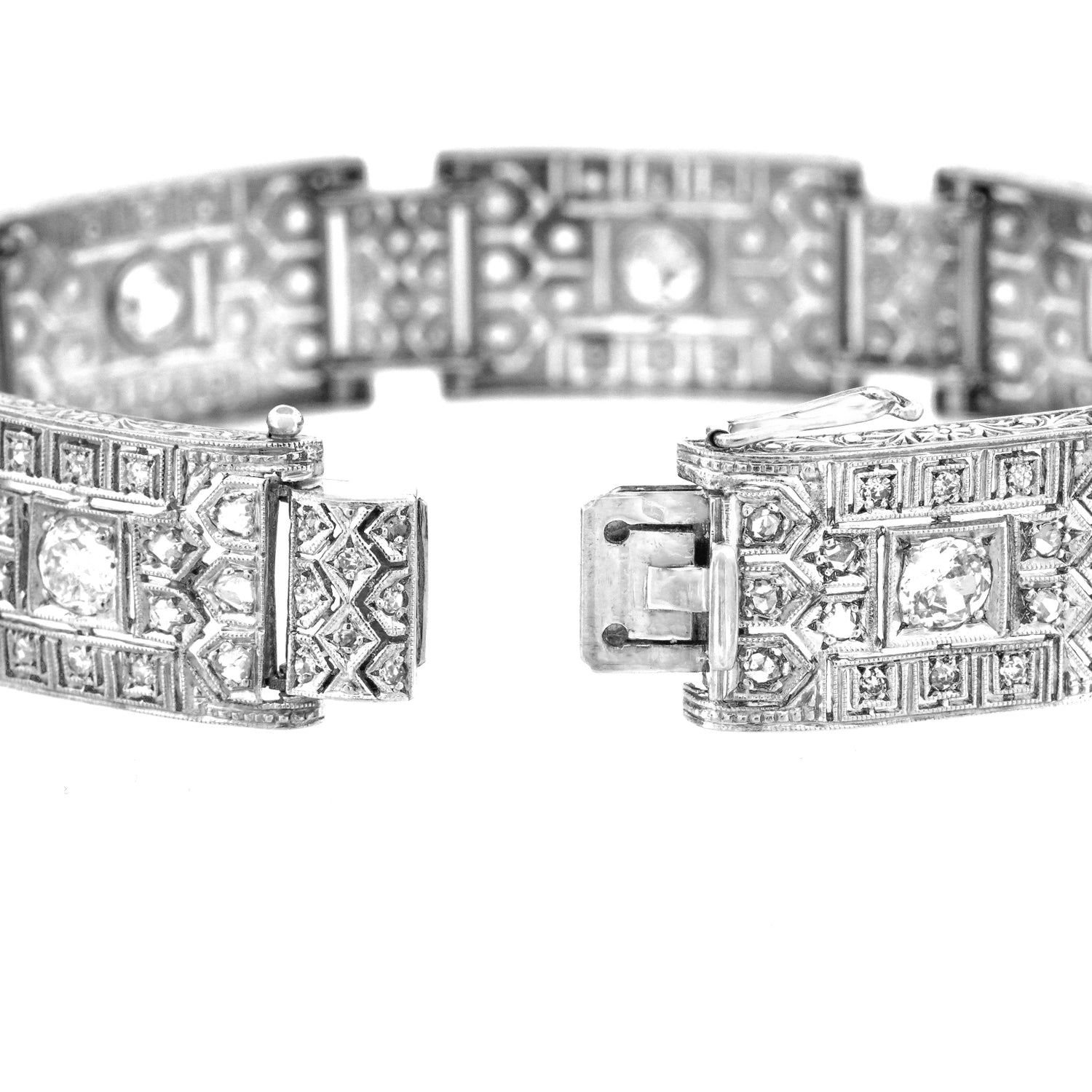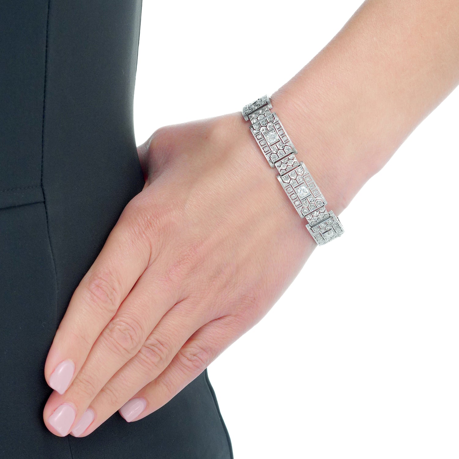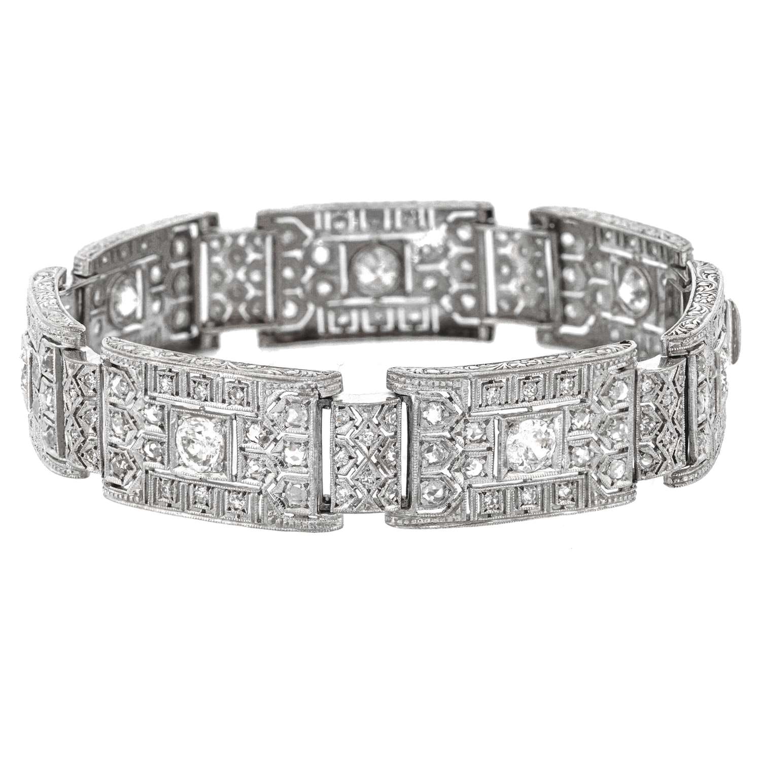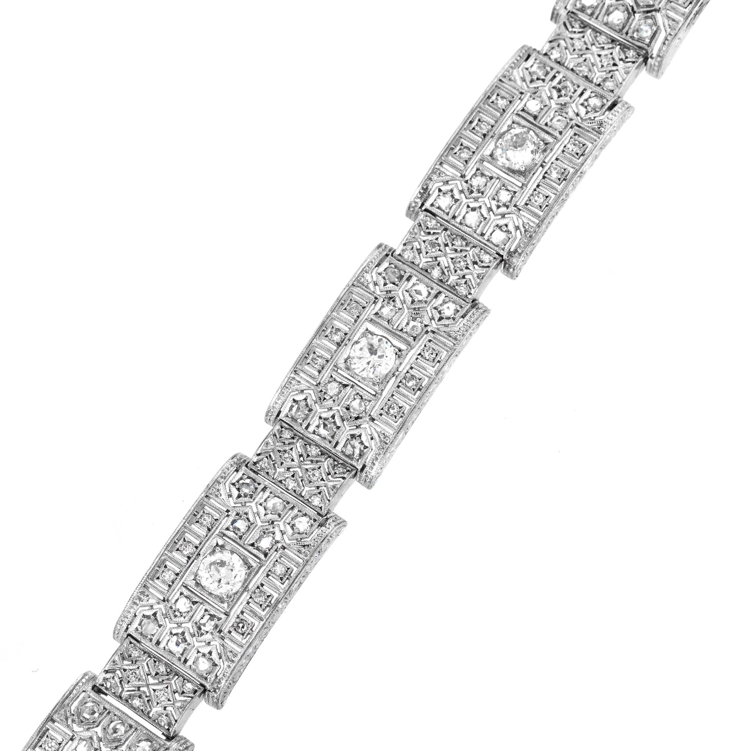 Circa 1920s, 18k, Germany. This fashionable Art Deco filigree bracelet features 5.0 carats of fine white diamonds (H-G, SI1-2). The design is crisp, geometric, and effortlessly stylish. Handmade, it is in excellent condition.