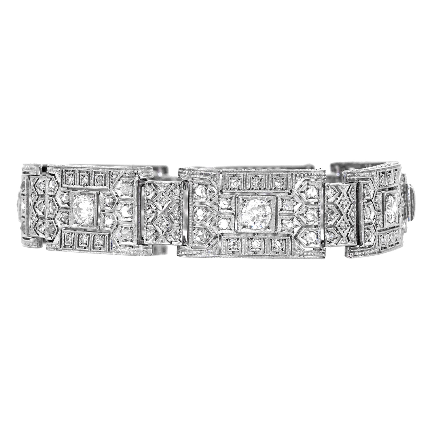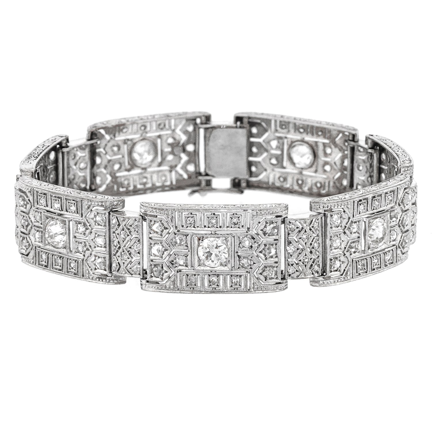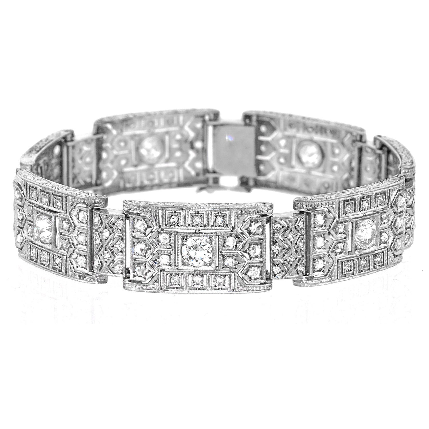 Circa 1920s, 18k, Germany. This fashionable Art Deco filigree bracelet features 5.0 carats of fine white diamonds (H-G, SI1-2). The design is crisp, geometric, and effortlessly stylish. Handmade, it is in excellent condition.