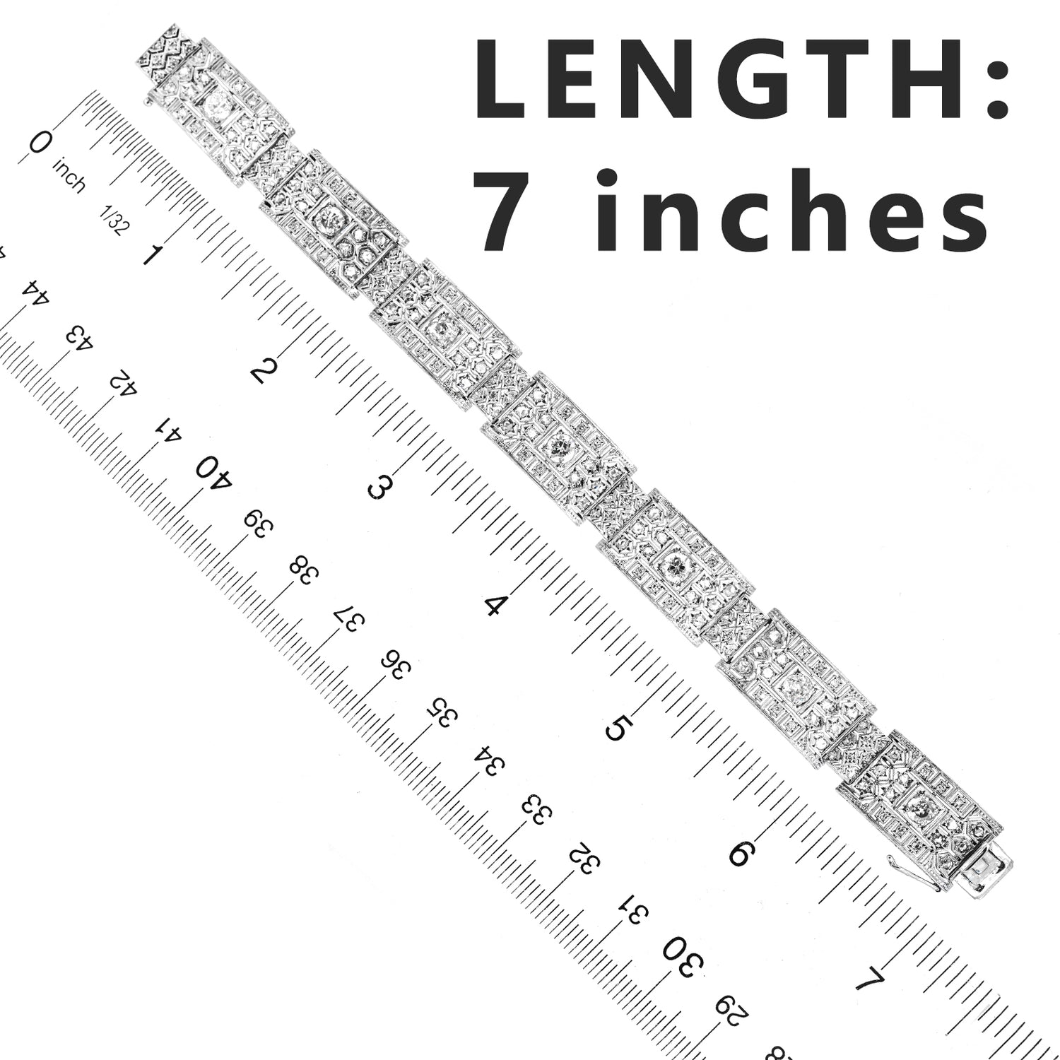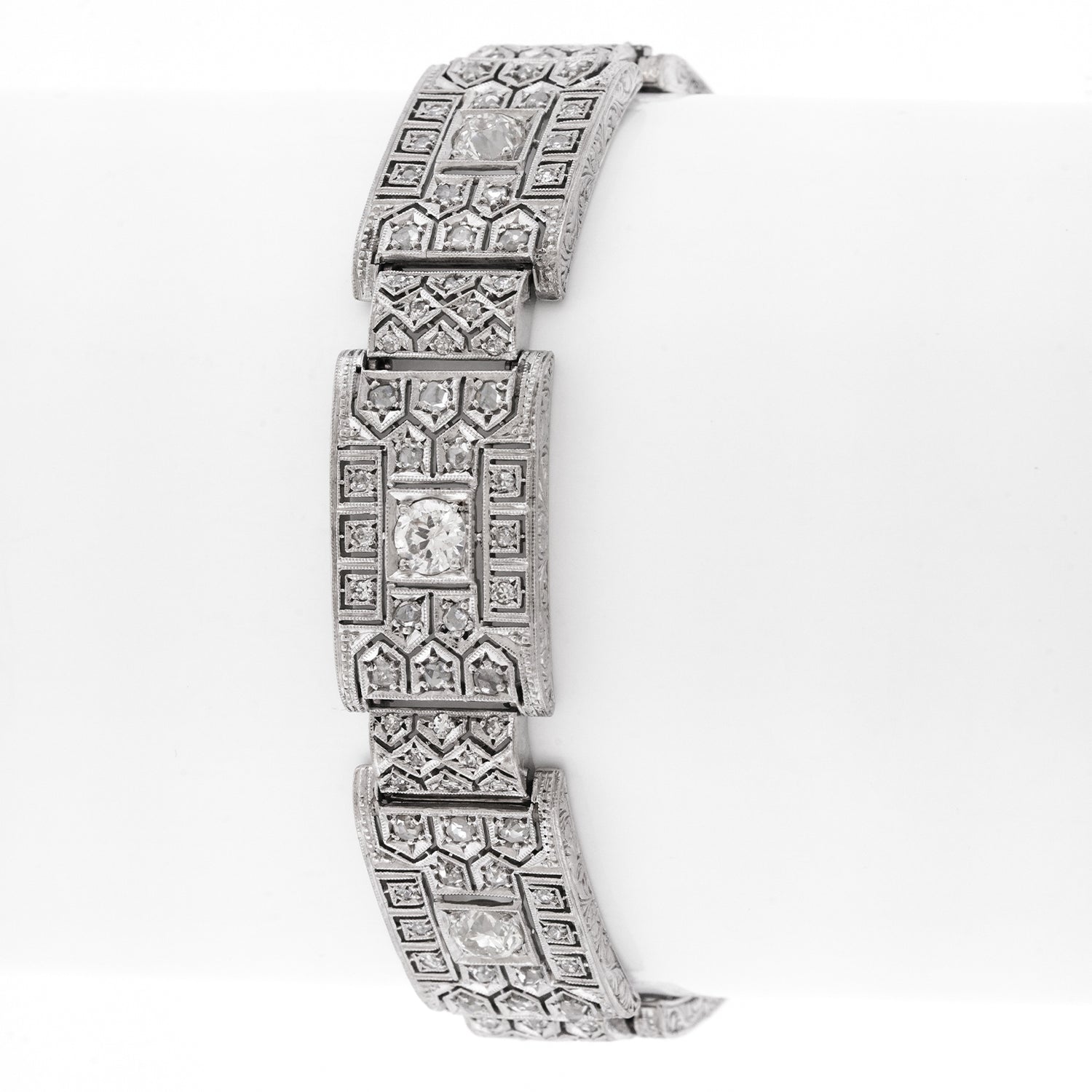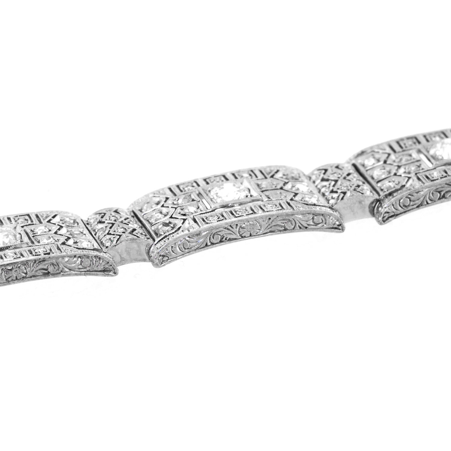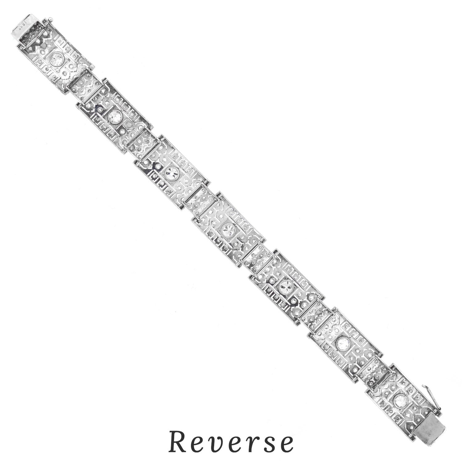 Circa 1920s, 18k, Germany. This fashionable Art Deco filigree bracelet features 5.0 carats of fine white diamonds (H-G, SI1-2). The design is crisp, geometric, and effortlessly stylish. Handmade, it is in excellent condition.
