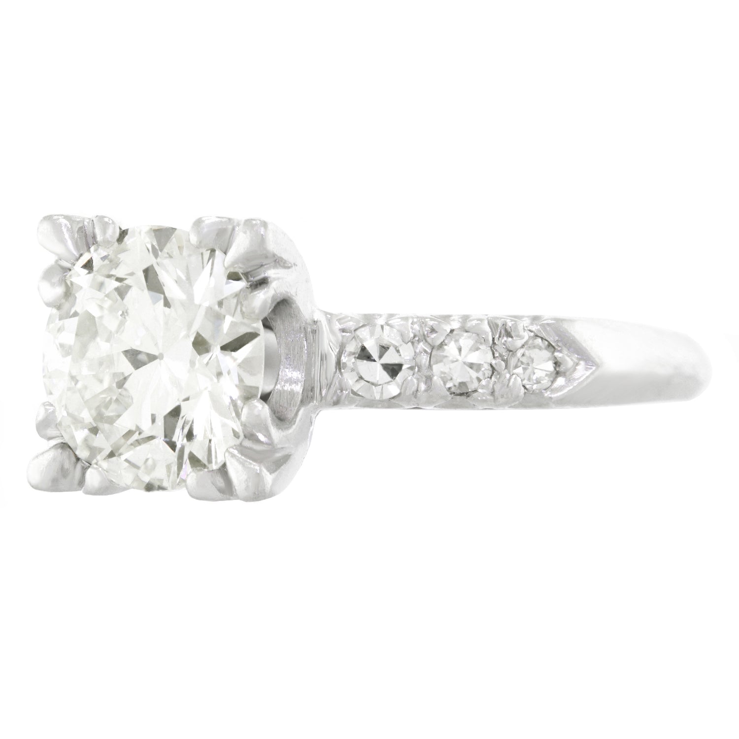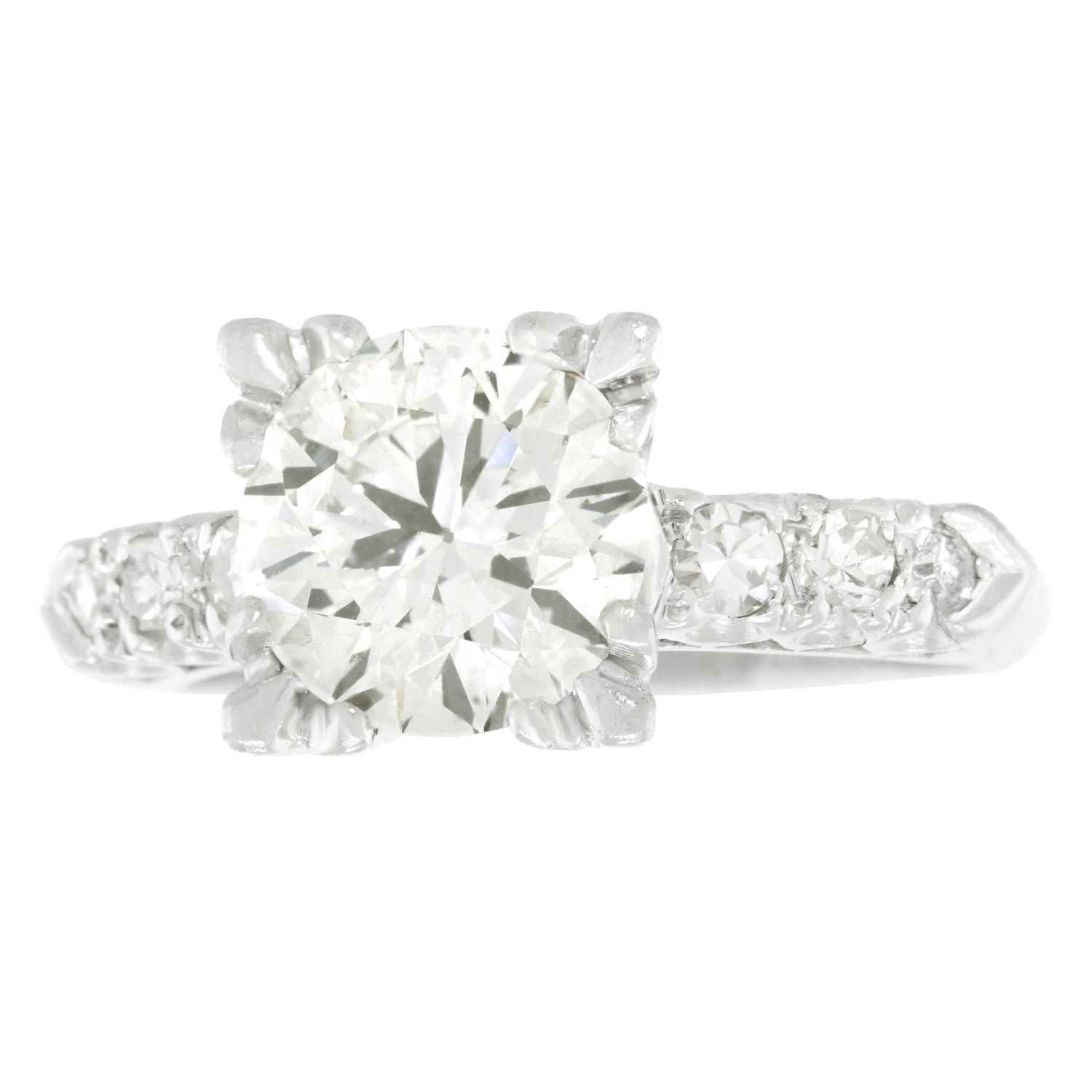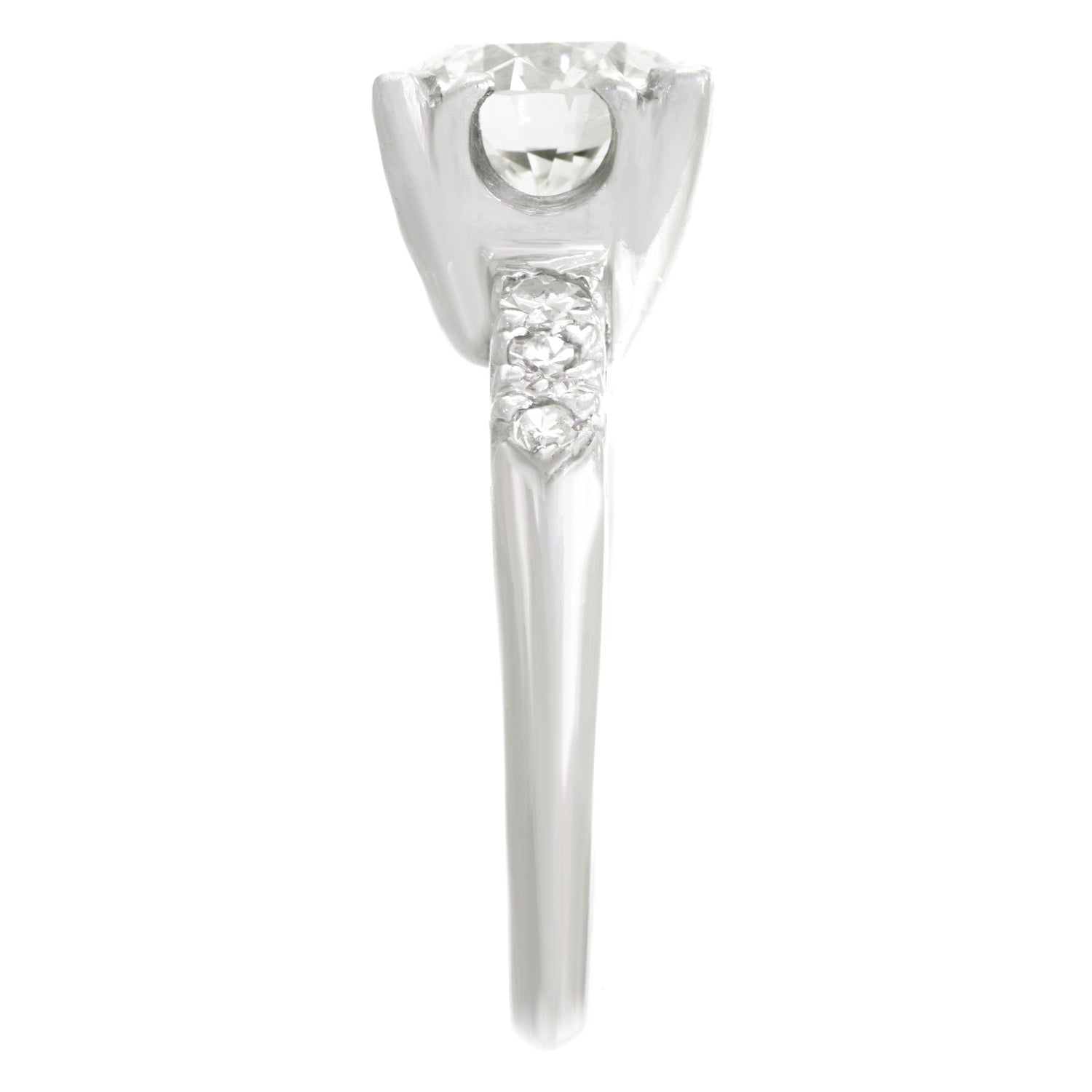 Circa 1930s, Platinum, American. This fabulous Art Deco engagement ring features a bright 1.90-carat diamond (K color, SI1 clarity). The geometric mounting is visually interesting and finely fabricated in platinum. This ring also features an additional .22 carats of accent diamonds.  Excellent condition.