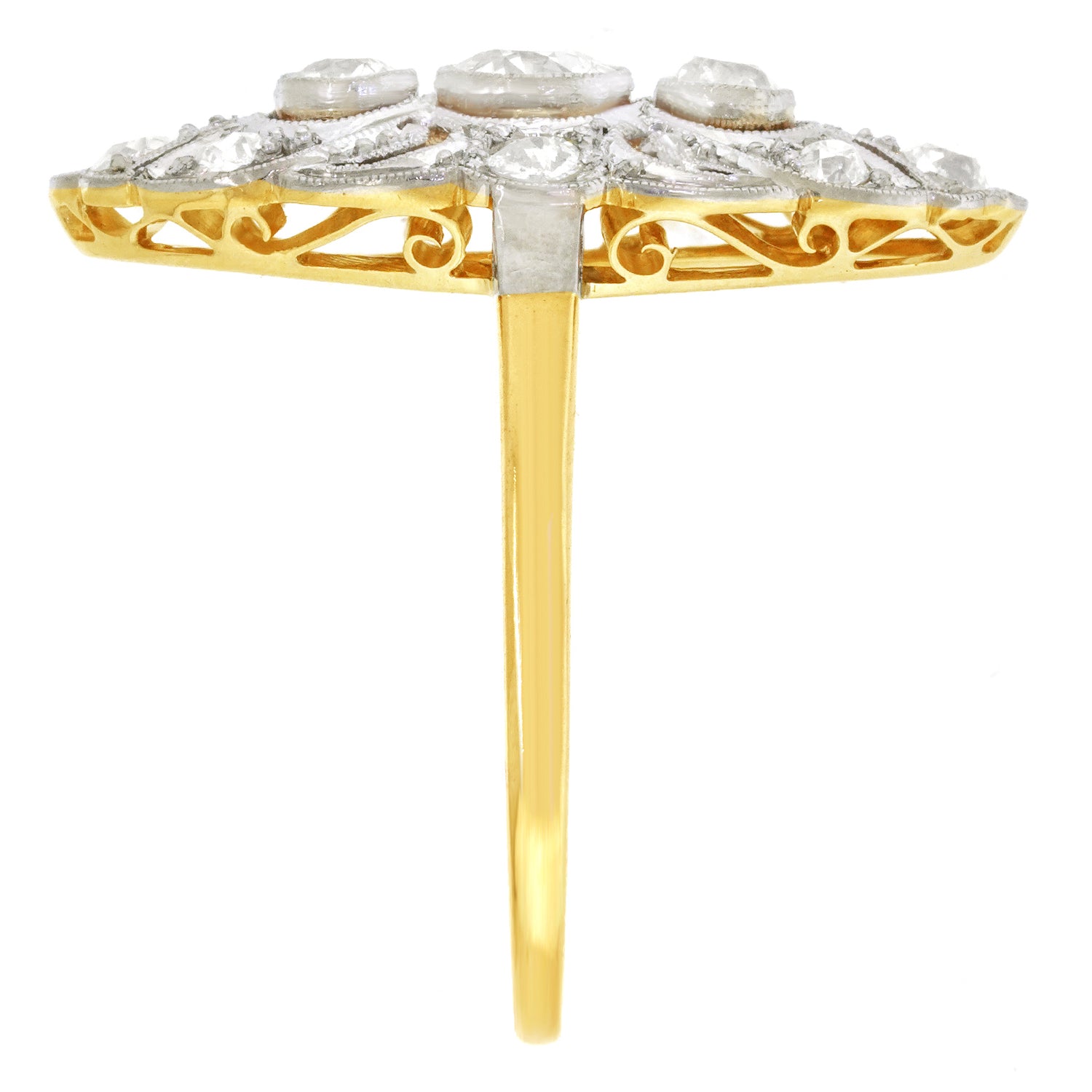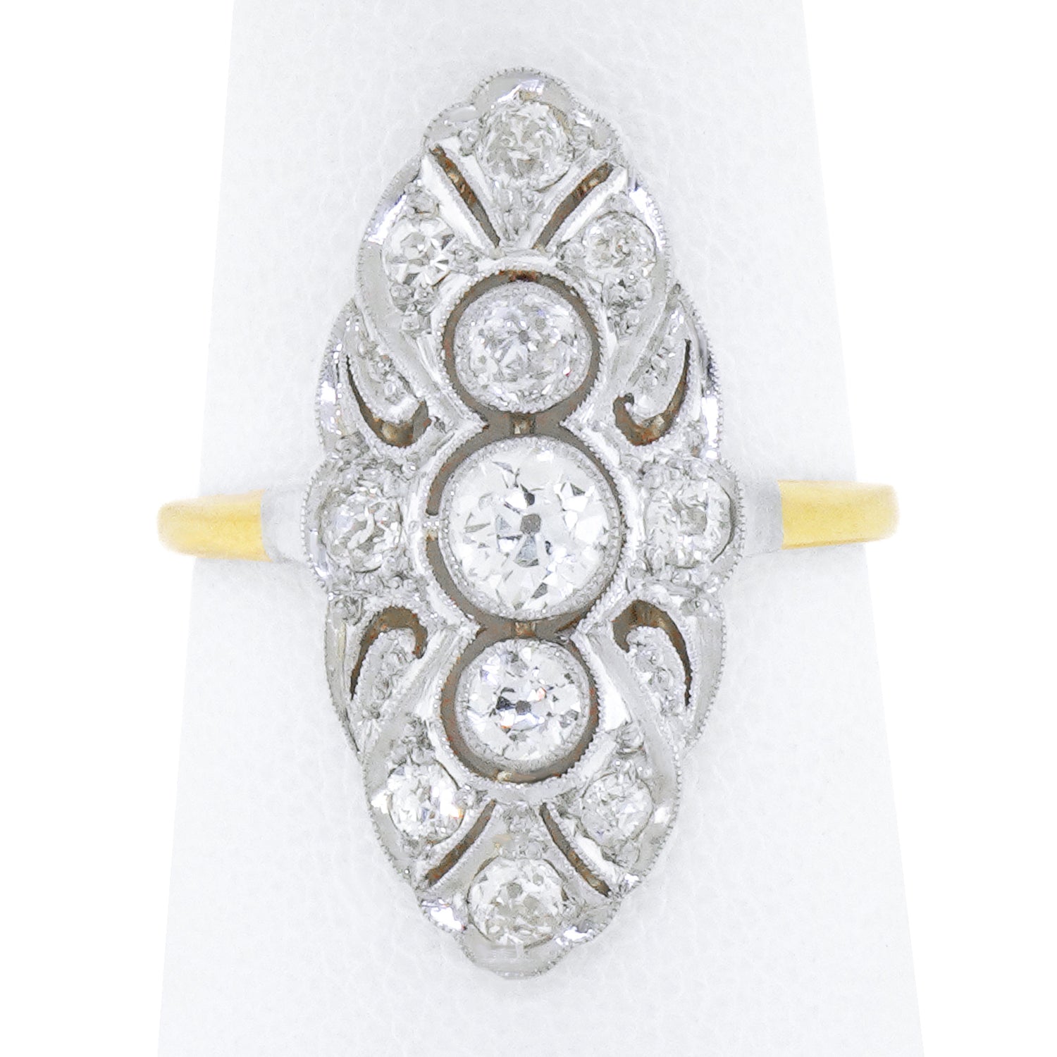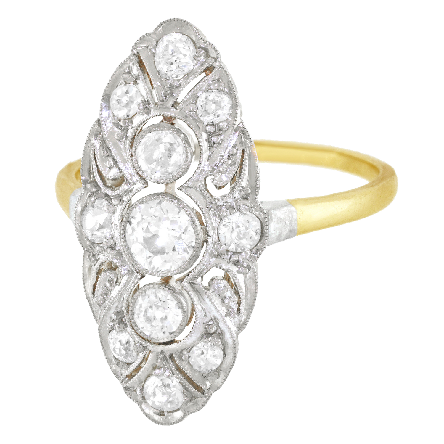 Circa 1920s, 14k / Platinum. Set with 1.10 carats of old cut diamonds, this romantic Art Deco ring features a platinum filigree top and a fourteen karat yellow gold undergallery and band. Flawless for every day, it is finely fashioned and in excellent condition.