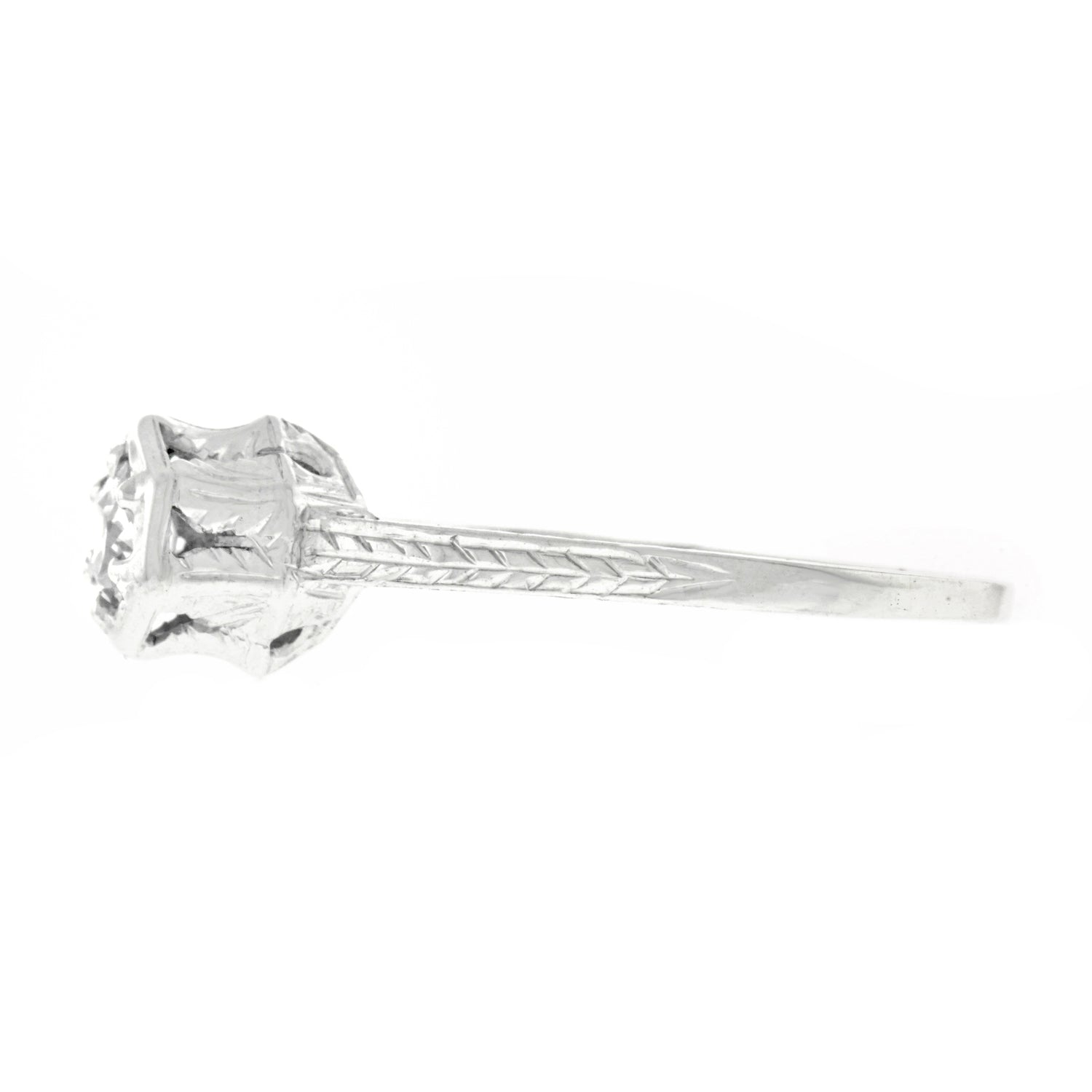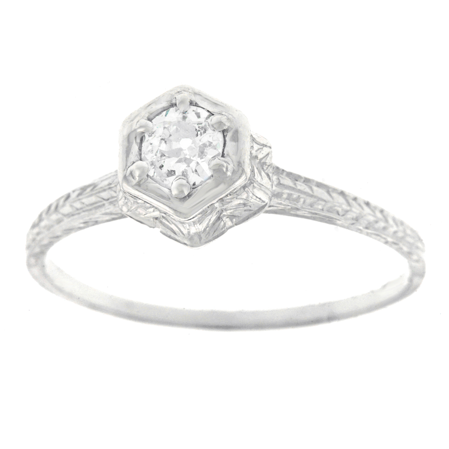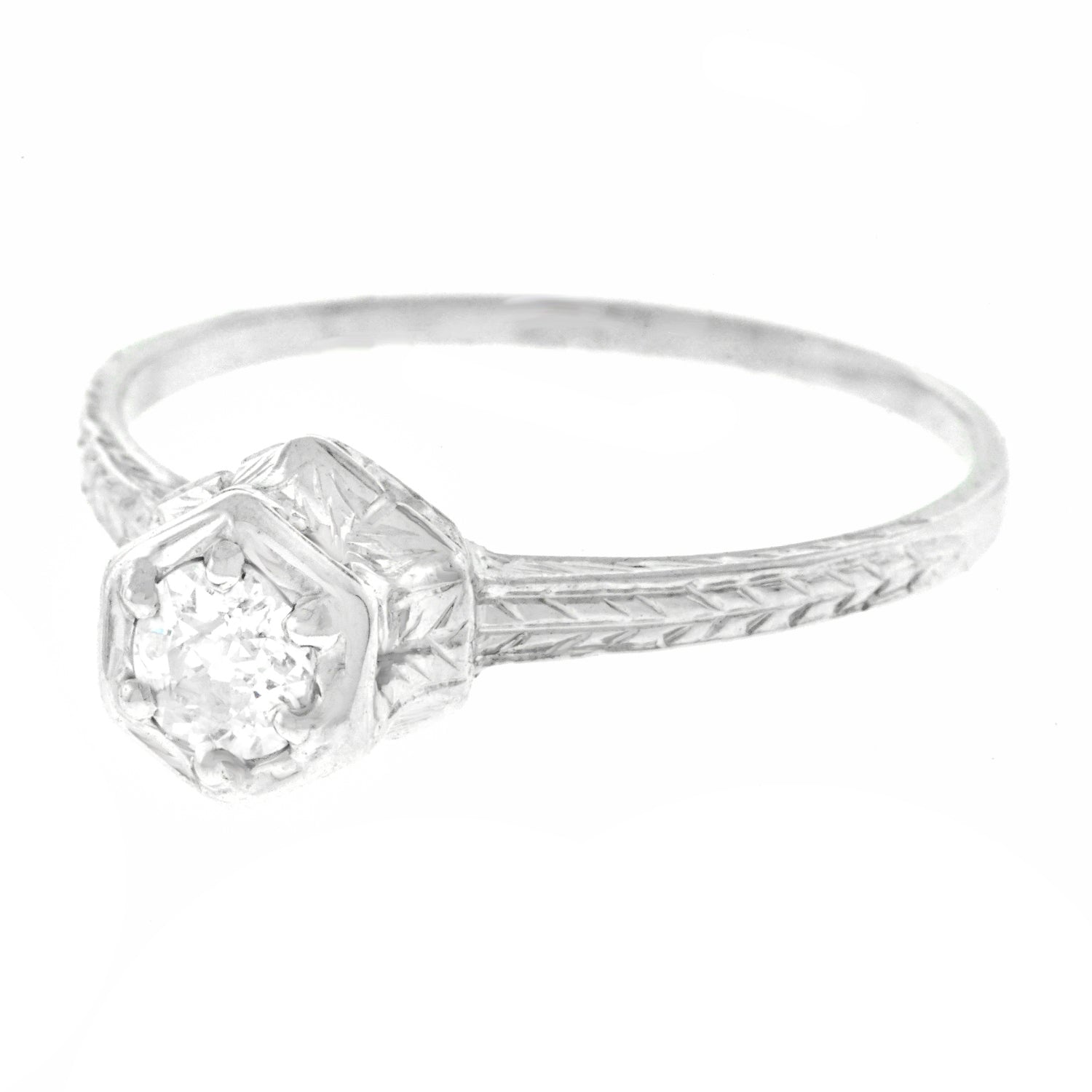 Circa 1940s, 14k, American.  Meticulously detailed, this sleek Art Deco ring features a brilliant white .35-carat diamond (H color, SI2 clarity) in an unusual hand-detailed octagonal setting. The look is vintage chic at its stylish best. Excellent condition.
