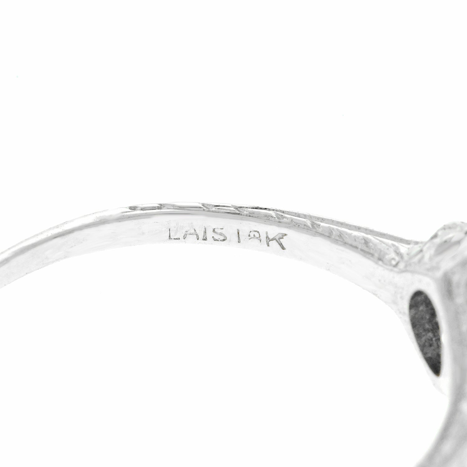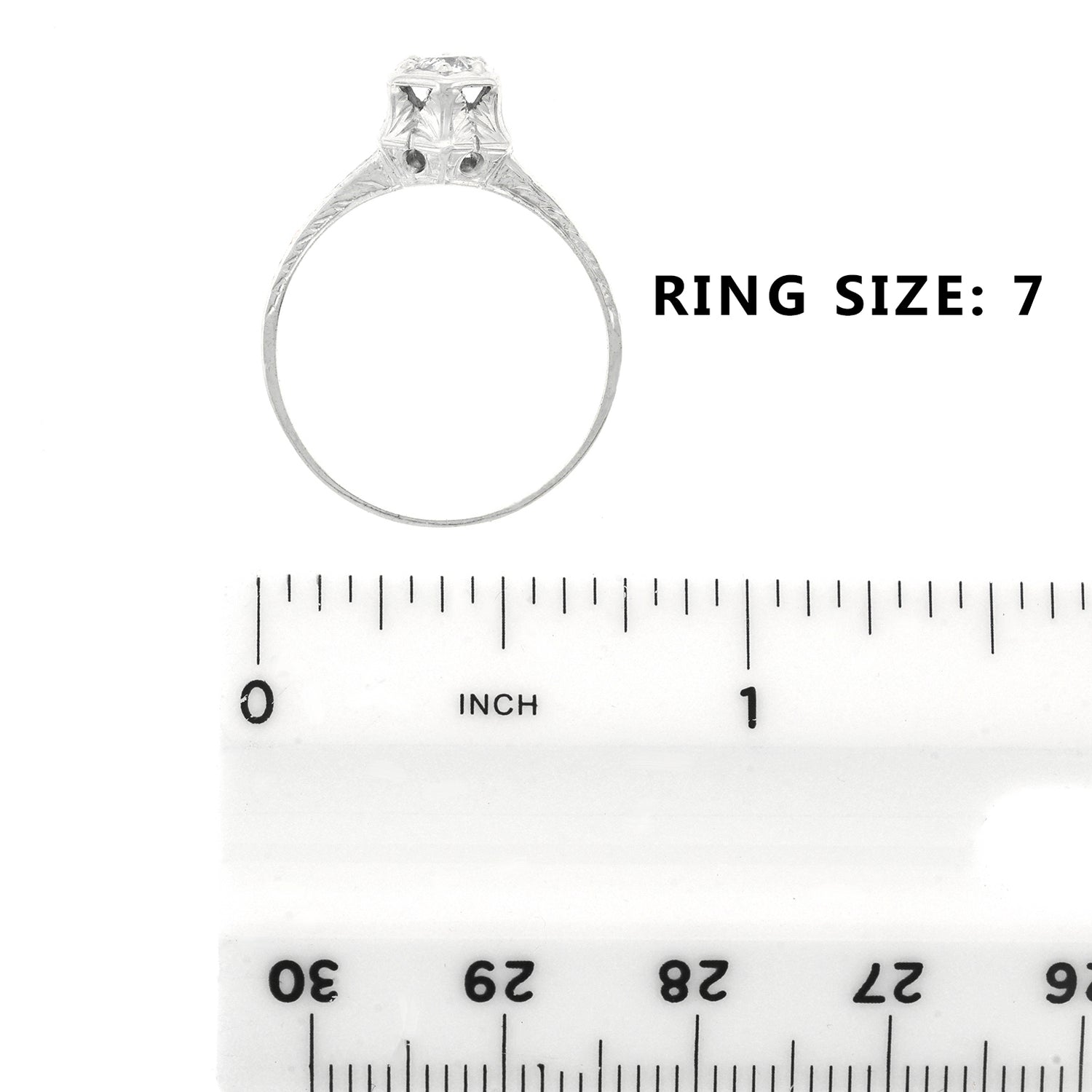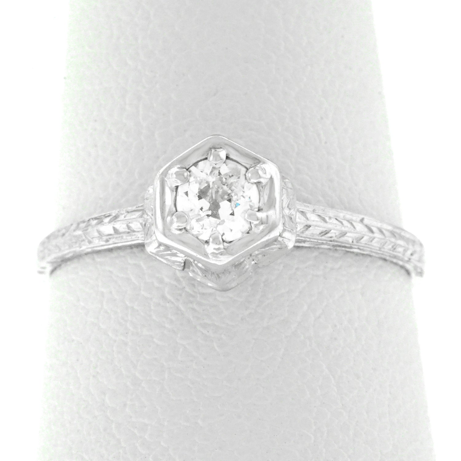 Circa 1940s, 14k, American.  Meticulously detailed, this sleek Art Deco ring features a brilliant white .35-carat diamond (H color, SI2 clarity) in an unusual hand-detailed octagonal setting. The look is vintage chic at its stylish best. Excellent condition.