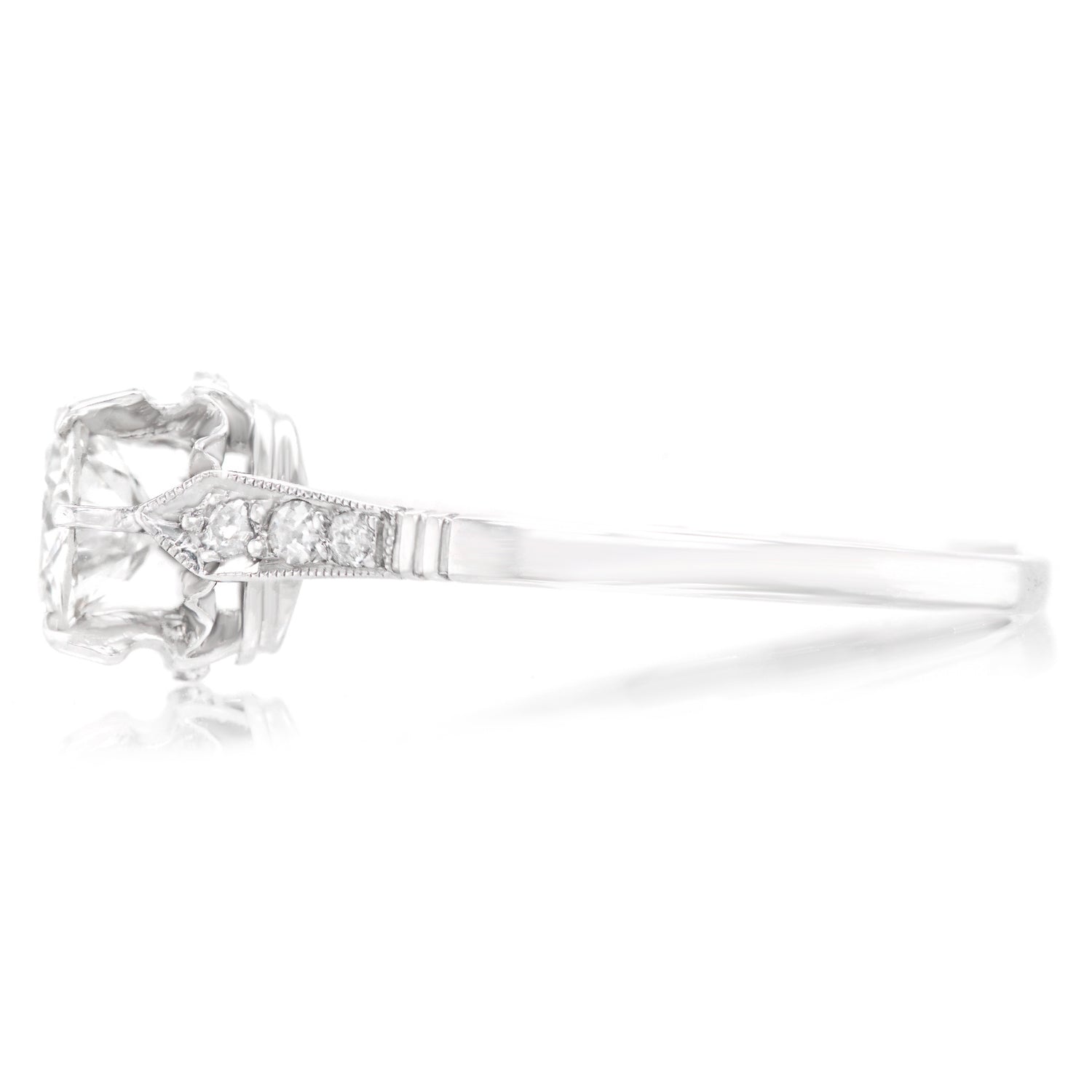Circa 1920s, Platinum. This sleek Art Deco engagement ring features a brilliantly white .80 carat diamond (H color, SI1 clarity) in a quintessential 100-year-old 1920s setting. The look is antique chic at its vintage best. Finely handcrafted in platinum, it is in excellent condition.