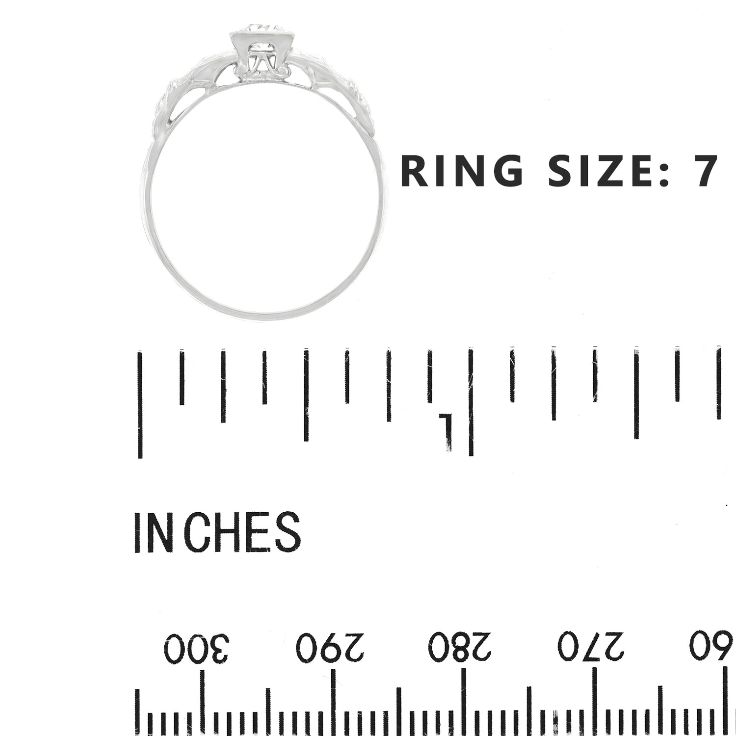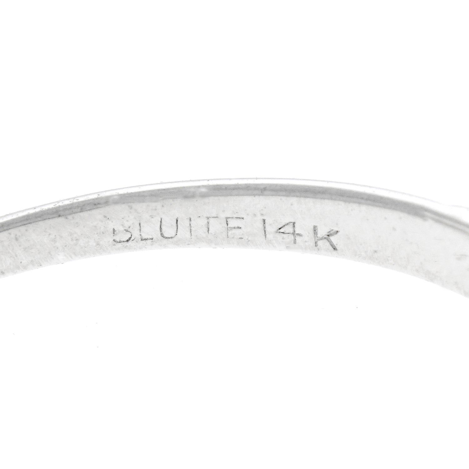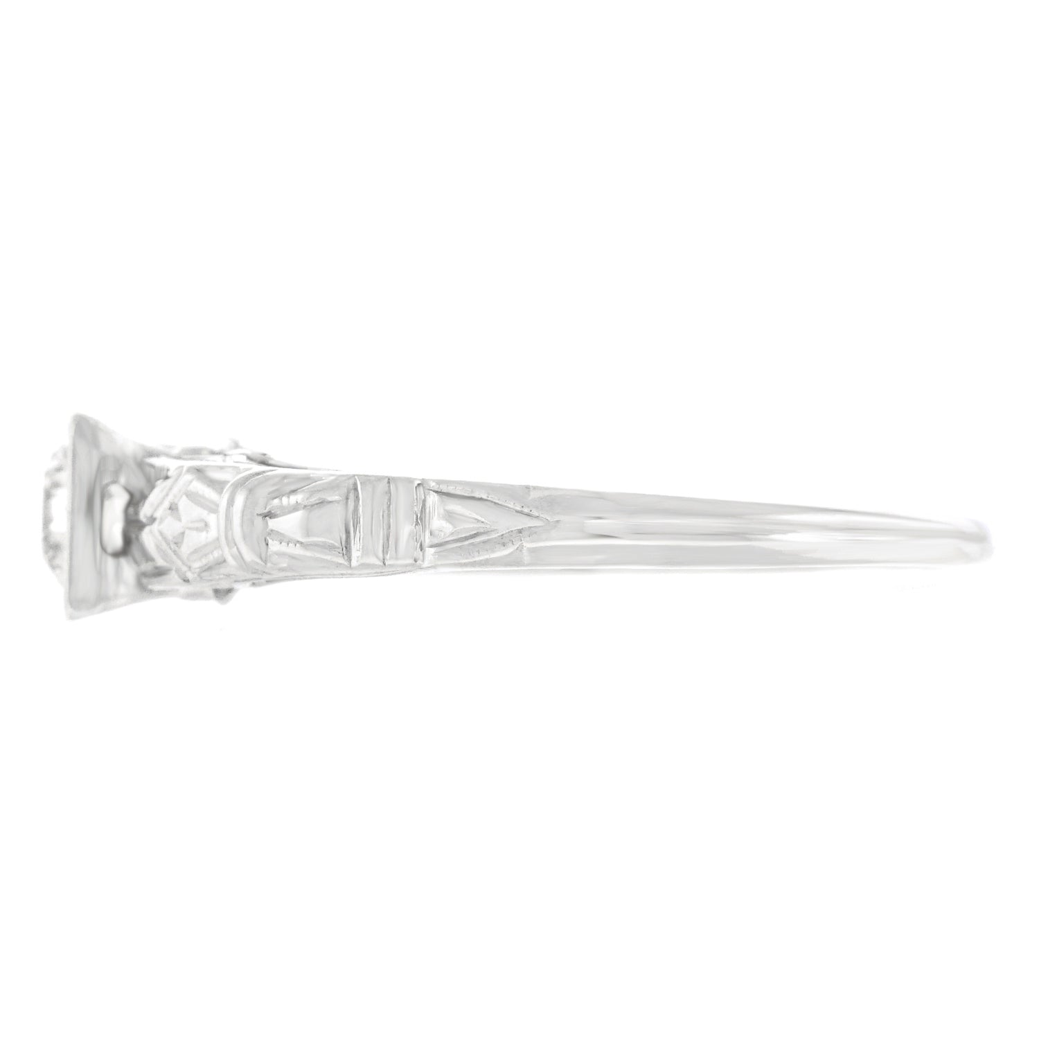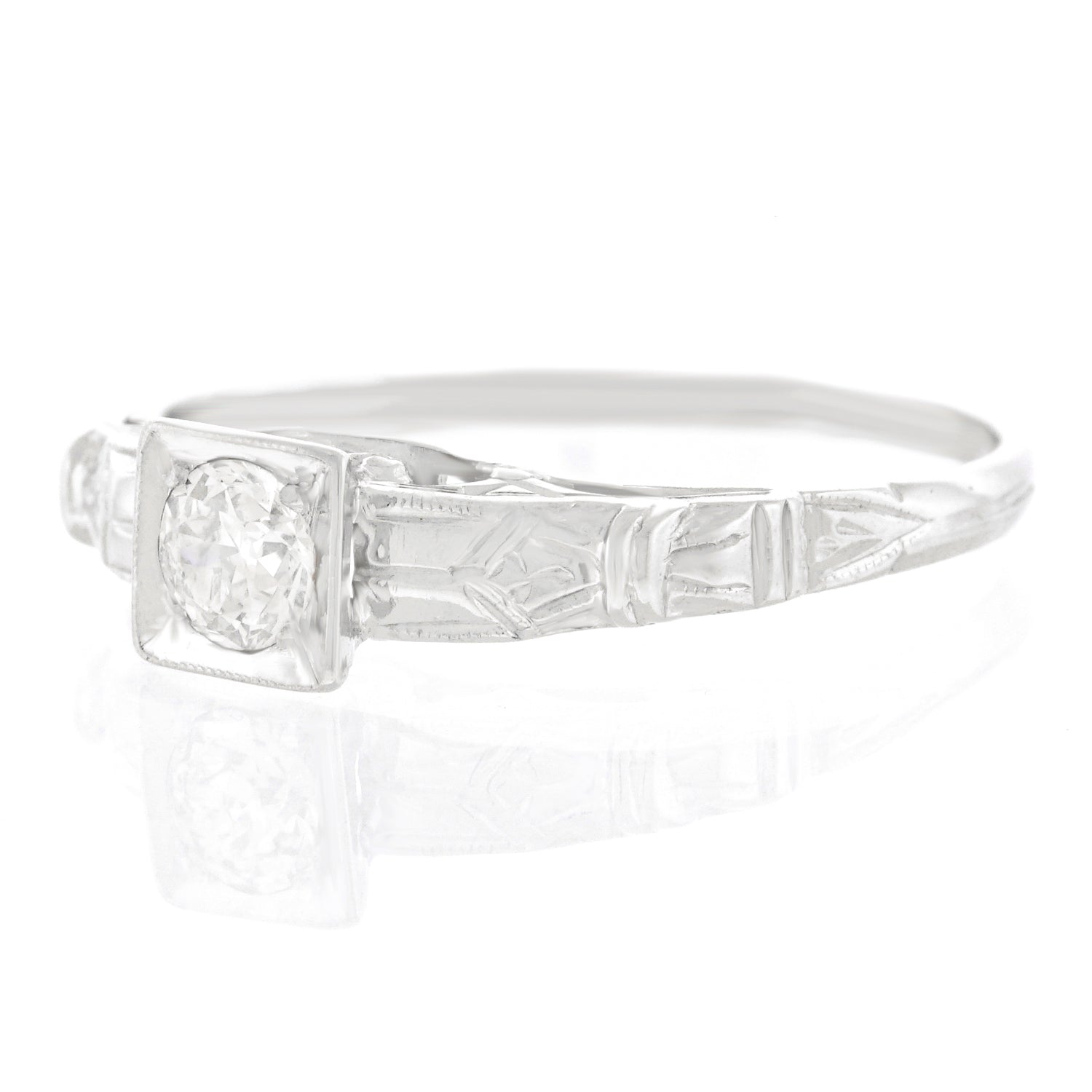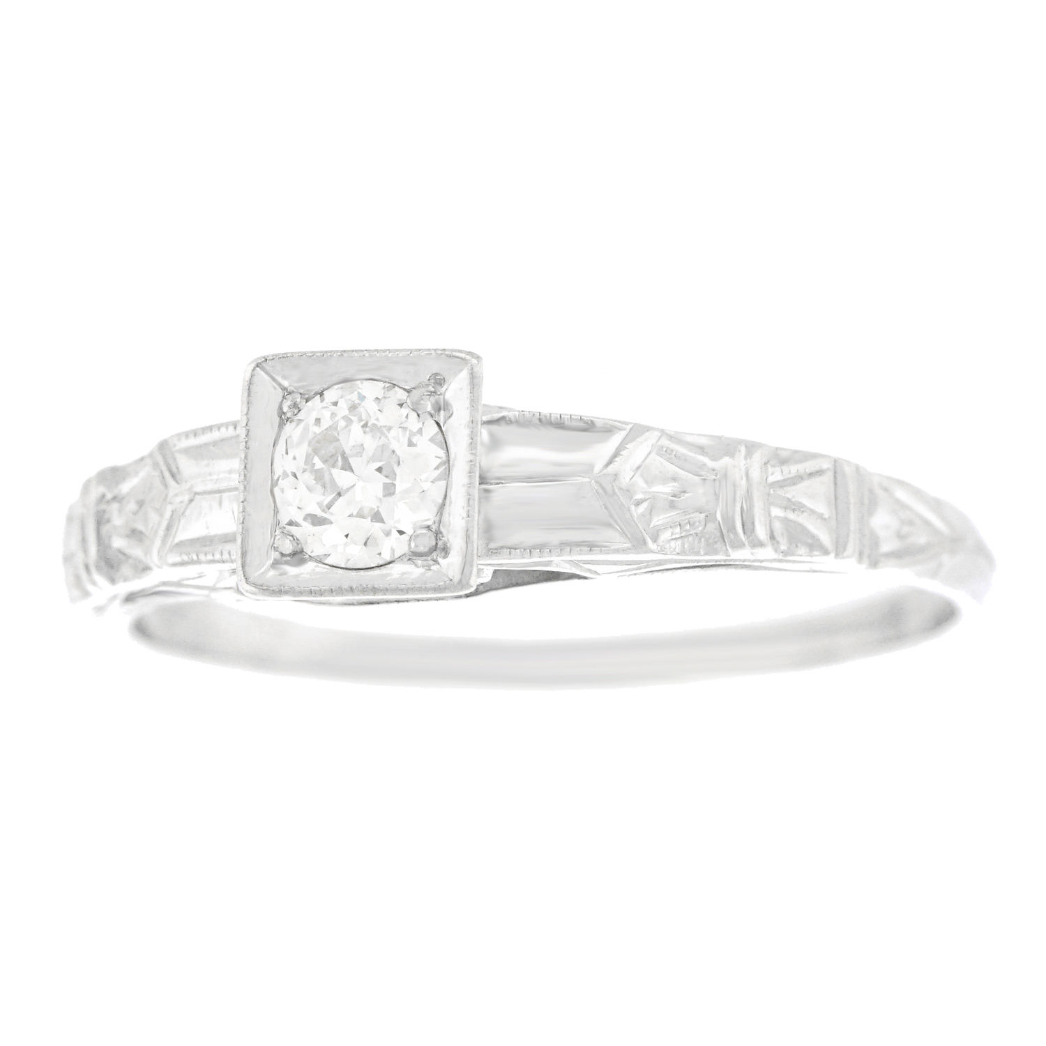 Circa 1930s, 14k, American.  This gorgeous Deco engagement ring has a brilliantly chic look. Finely fabricated in 14k white gold and set with a .30 carat brilliant white diamond, its distinctive setting is one-of-a-kind vintage style. Excellent condition.