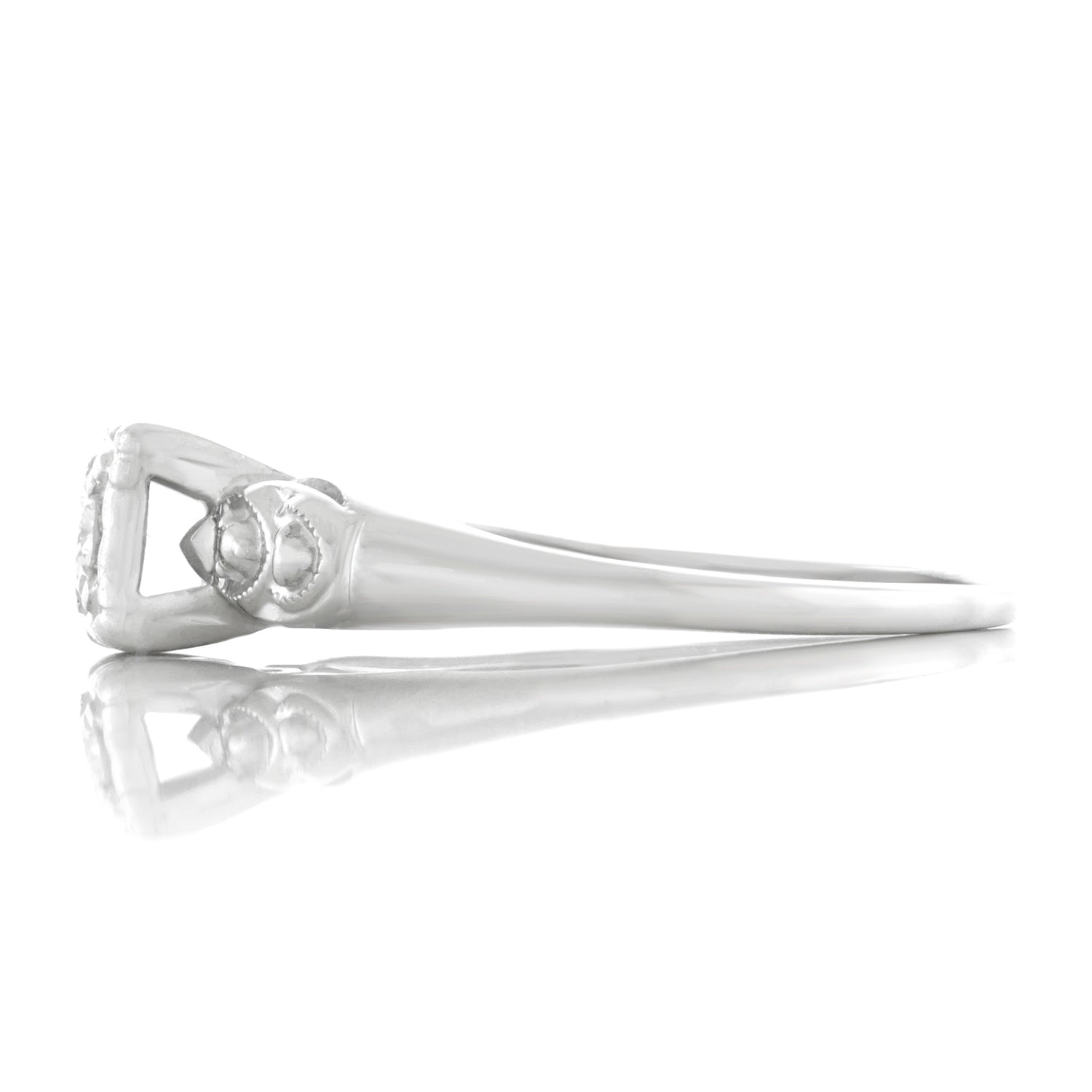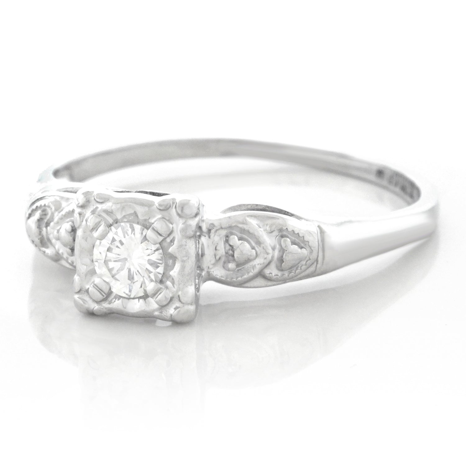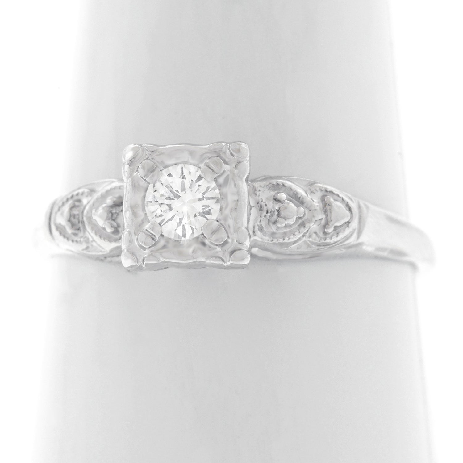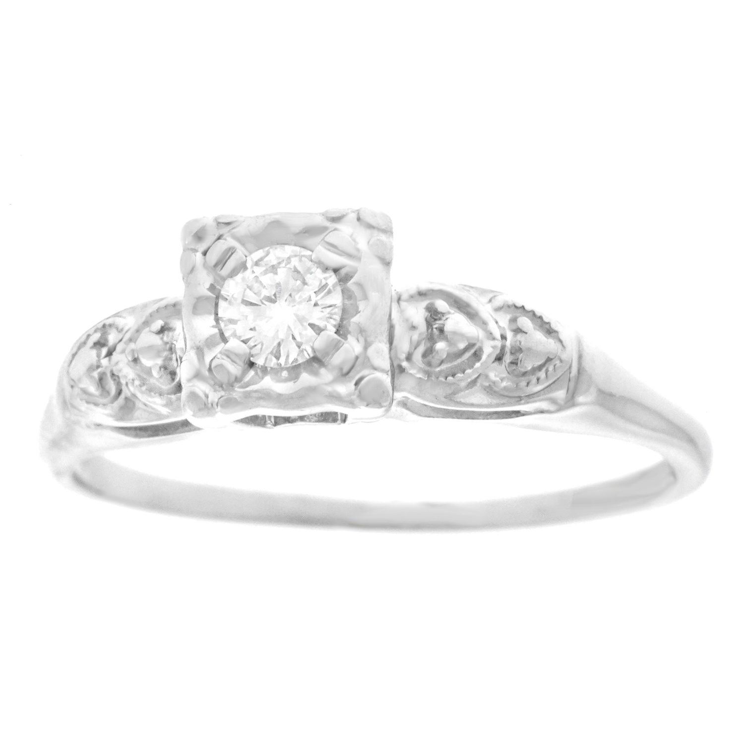 Circa 1930s, 14k, American.  This romantic Art Deco ring has a charming vintage look. Elegantly designed, it is set with a brilliant .18-carat white diamond (G color and VS clarity). Stylish and well-made, this 1940s ring is in excellent condition.