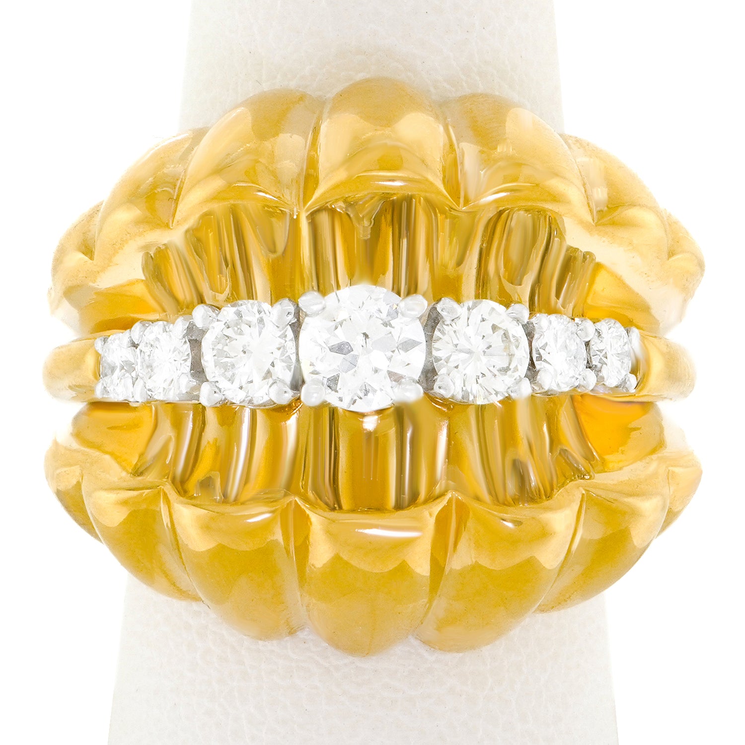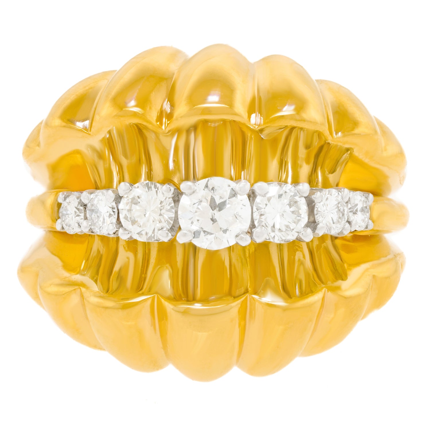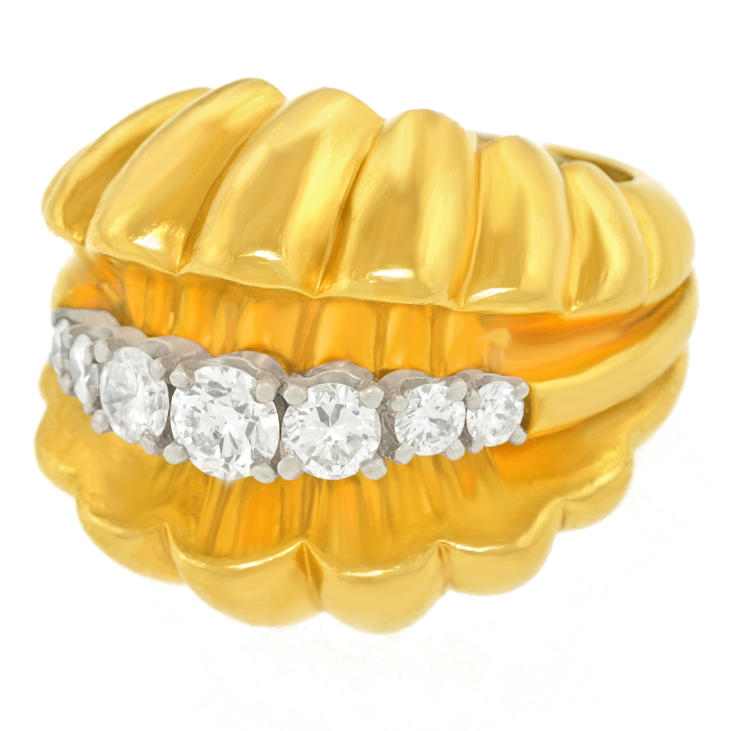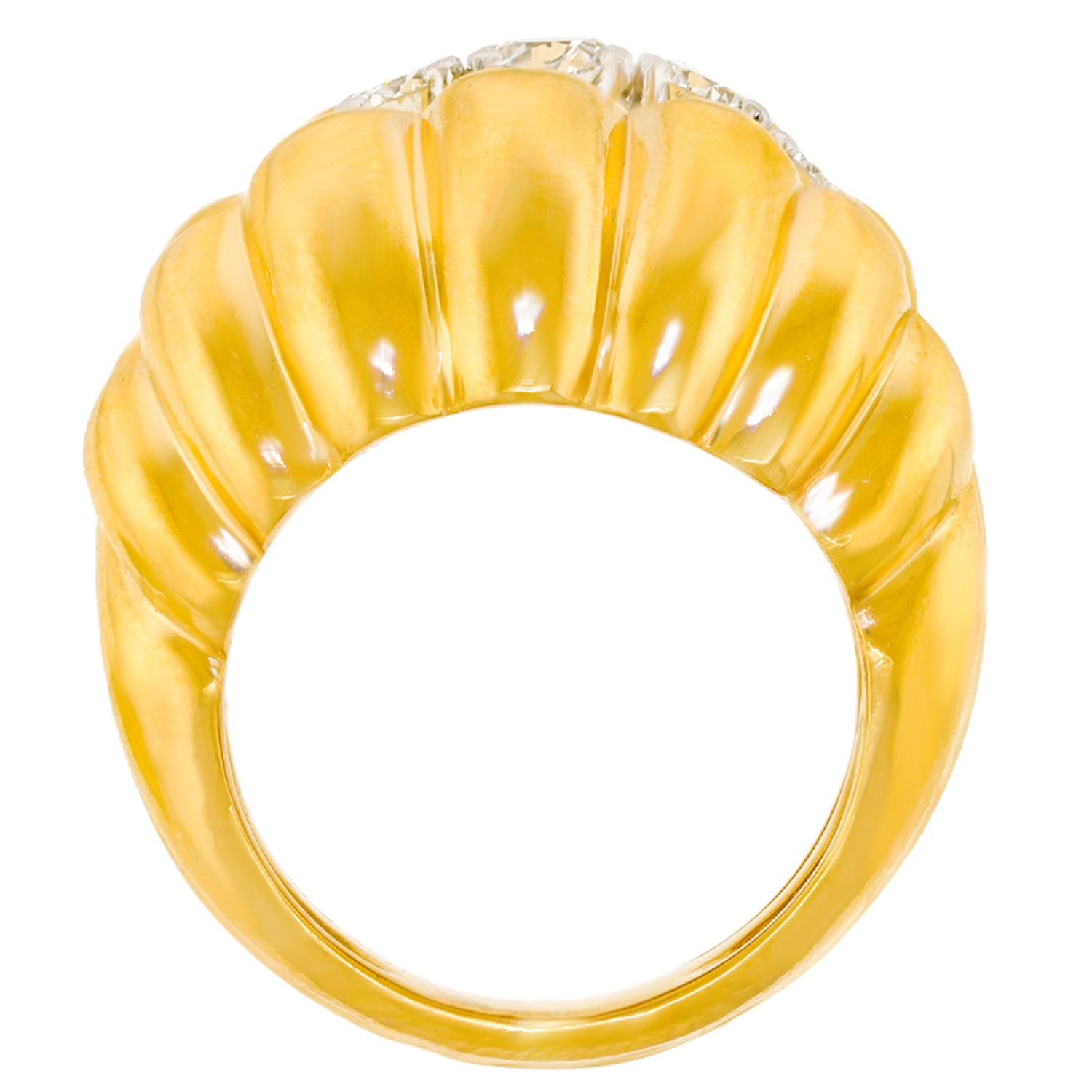 Circa 1930s, 14k and Platinum, American.  From the sidewalk to the catwalk, this bold Art Deco ring is perfect everyday fashion. Featuring 1.0 carats of fine white diamonds, this deliciously heavy yellow gold ring is striking in every detail. Finely fabricated, it is in excellent condition.