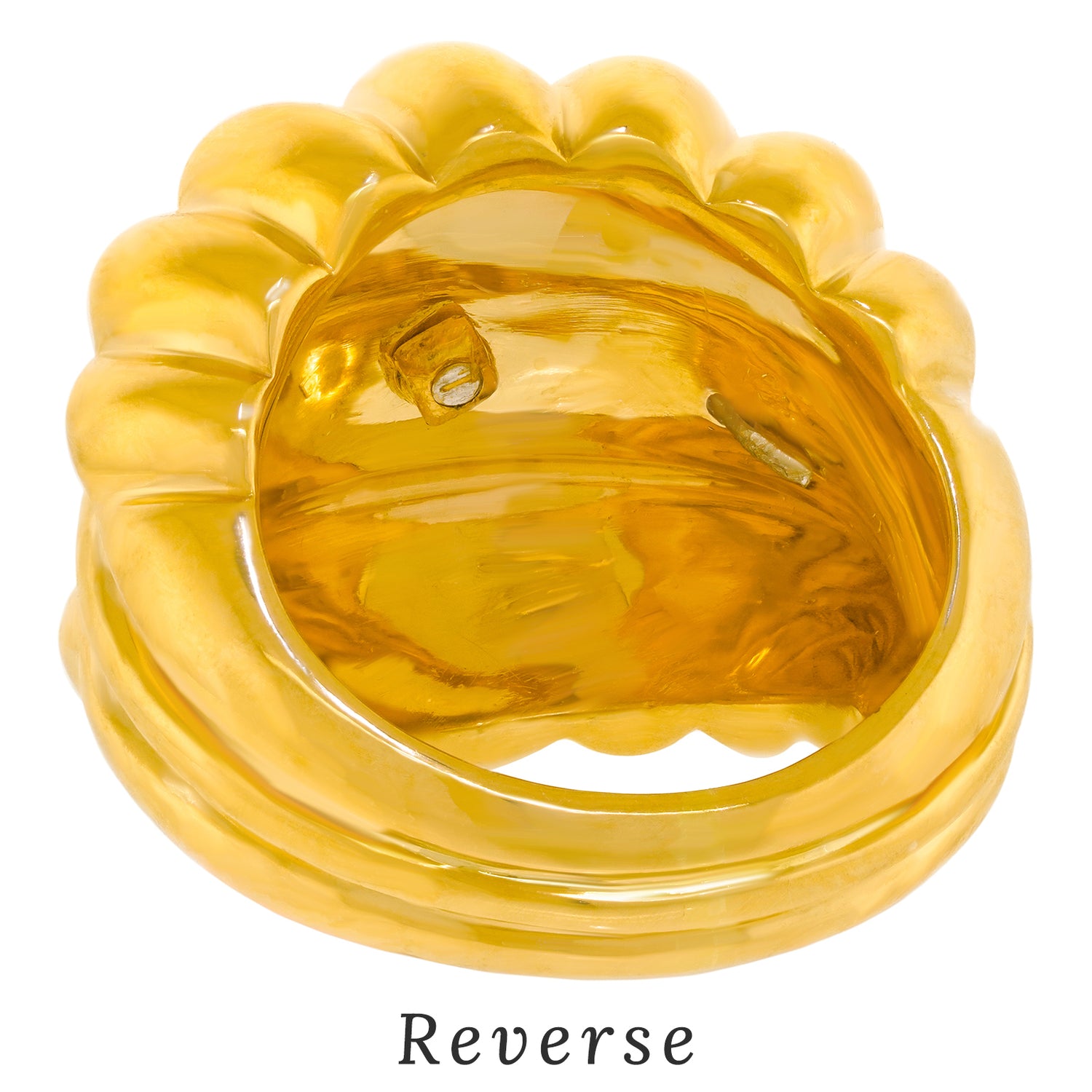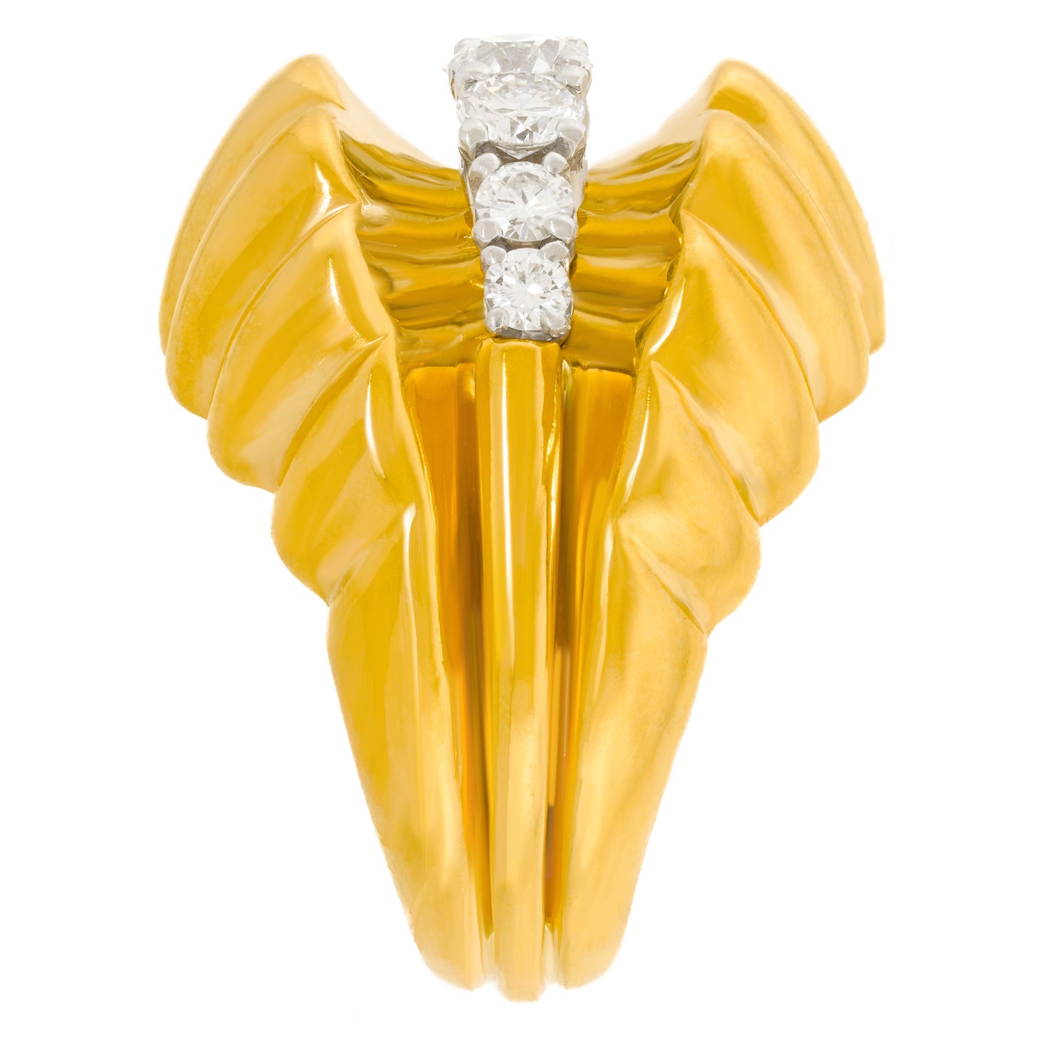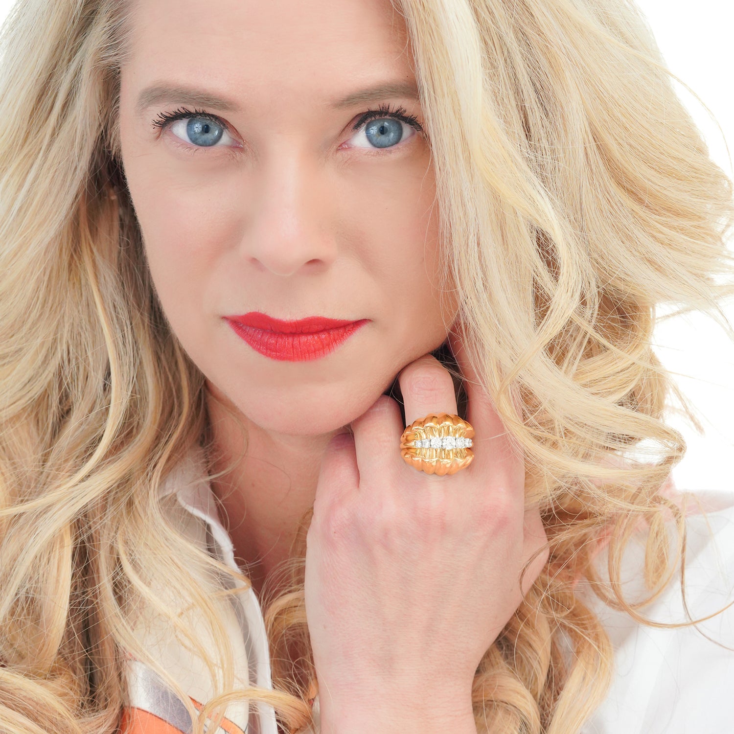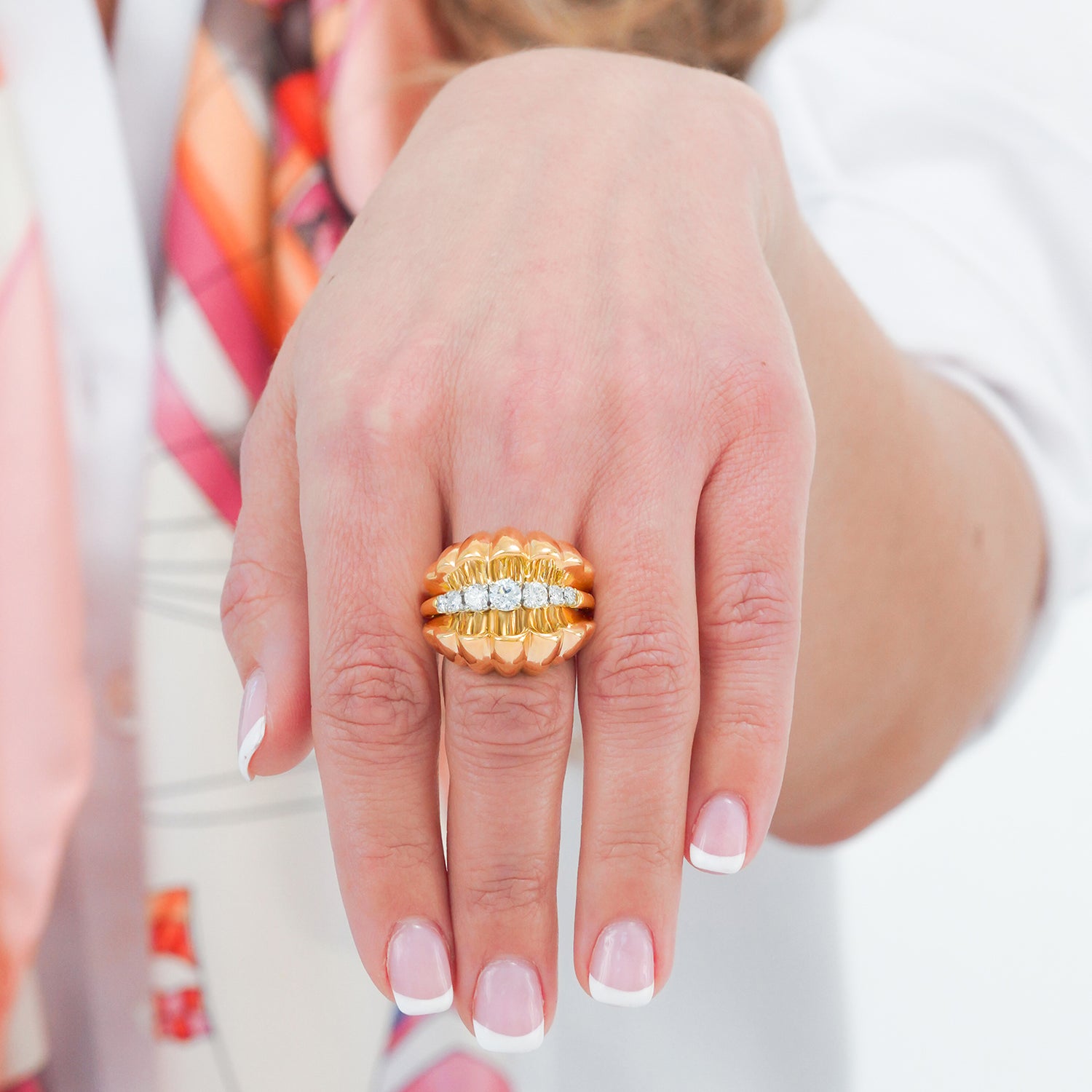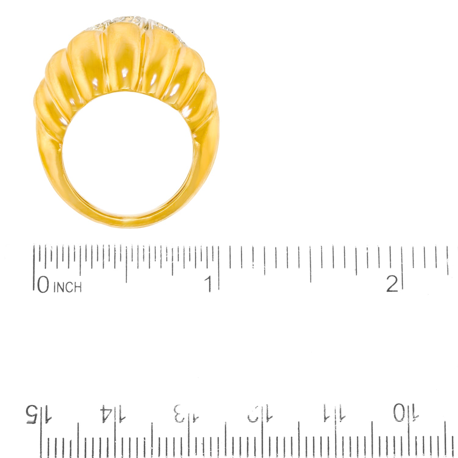 Circa 1930s, 14k and Platinum, American.  From the sidewalk to the catwalk, this bold Art Deco ring is perfect everyday fashion. Featuring 1.0 carats of fine white diamonds, this deliciously heavy yellow gold ring is striking in every detail. Finely fabricated, it is in excellent condition.