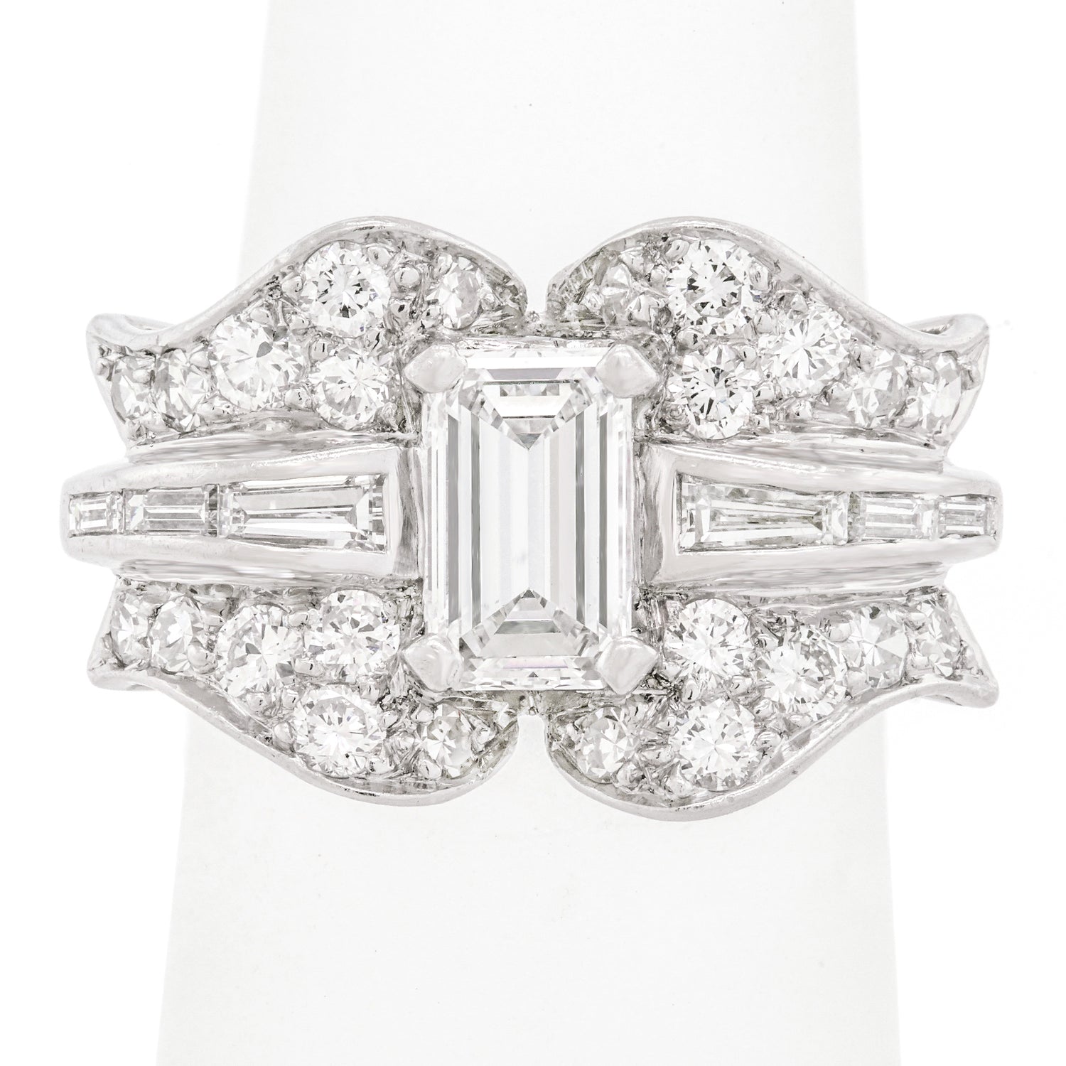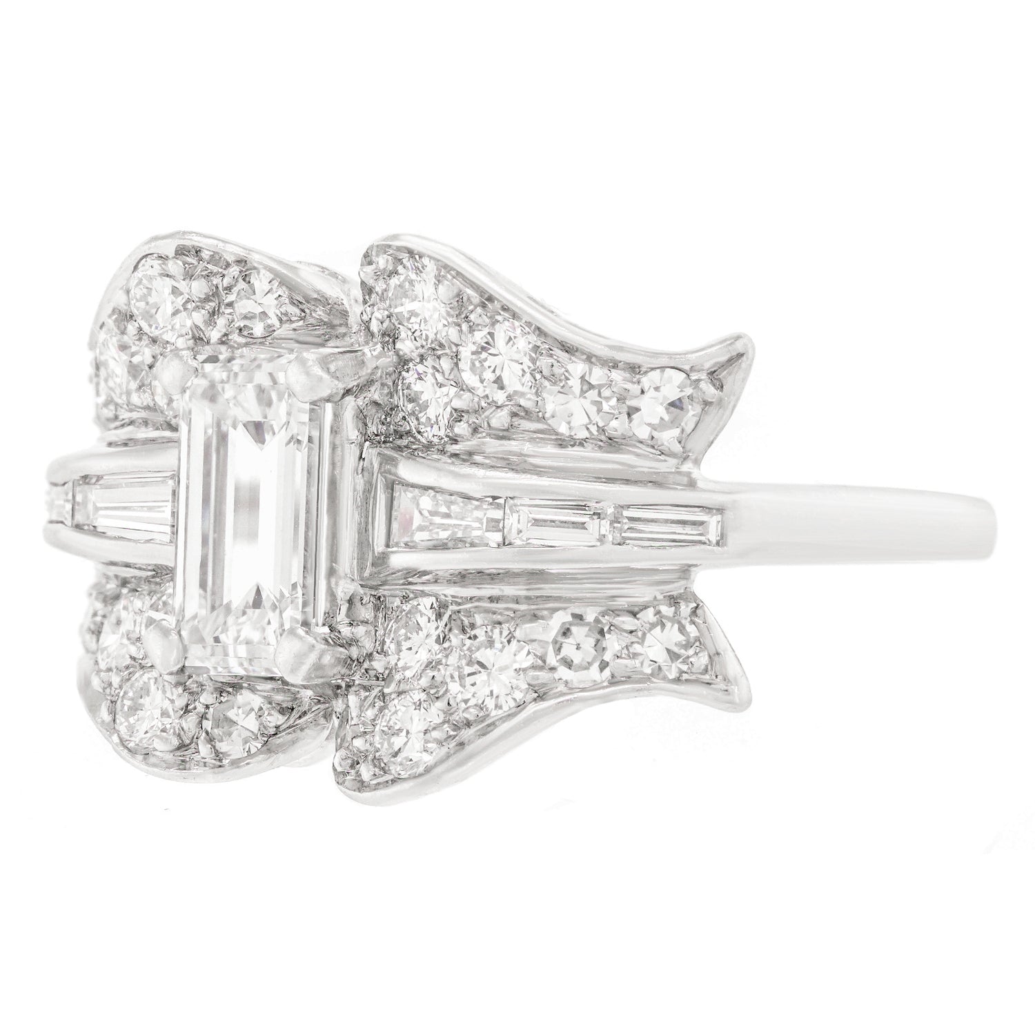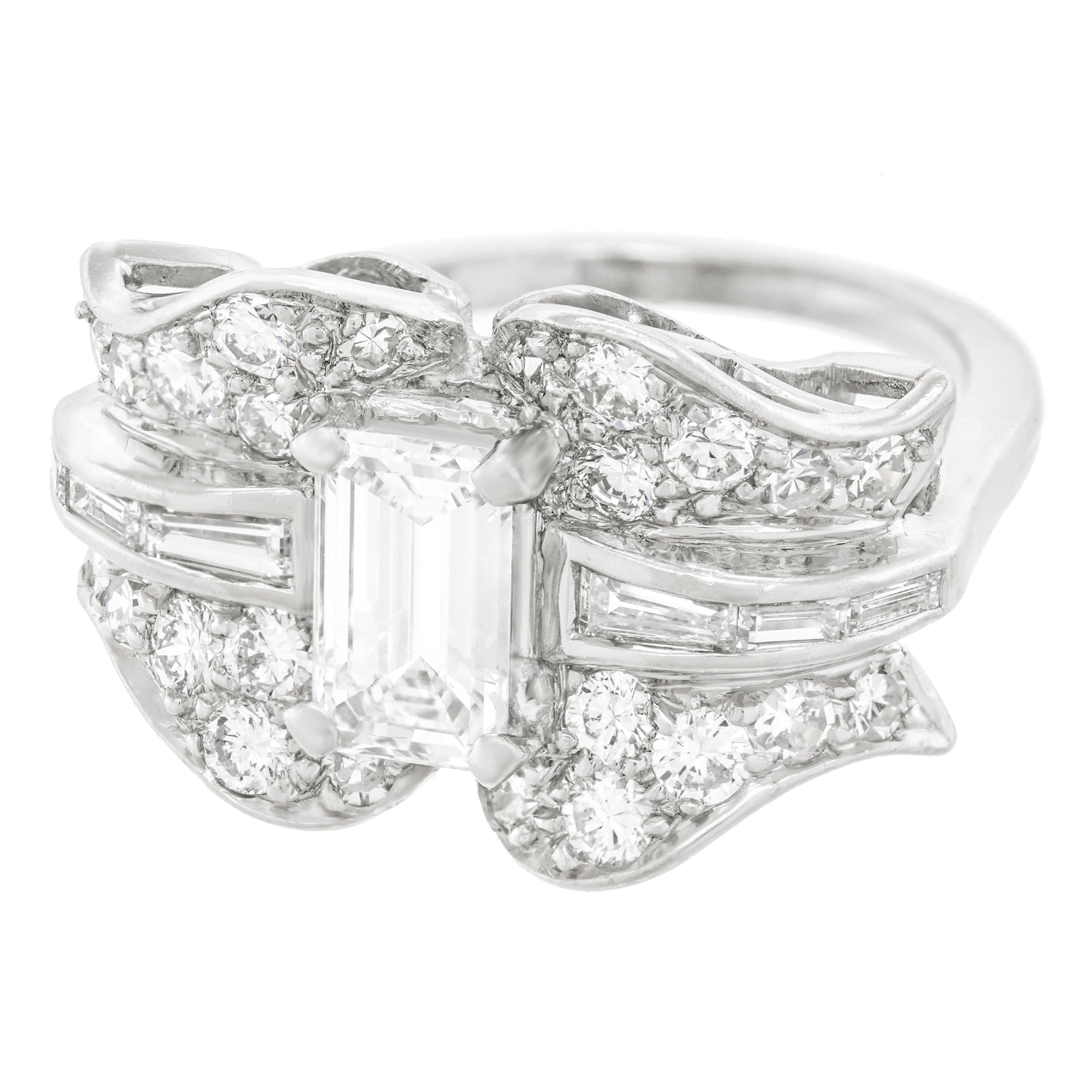 Circa 1920s, Platinum, American. This spectacular Art Deco cocktail ring features very white, very sparkly diamonds! Diamonds! Diamonds! …did anyone say it's all about the diamonds? Redolent of ribbon motifs, the curvilinear flow of platinum and round diamonds is juxtaposed by a crisp .85-carat emerald cut diamond (G color, VS clarity). As one would expect of fine twenties platinum jewelry, the fabrication is meticulous, and the quality obvious. Excellent condition.