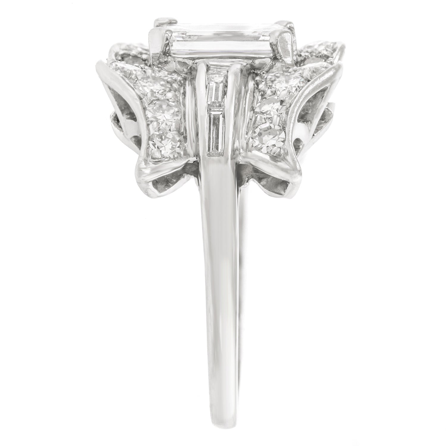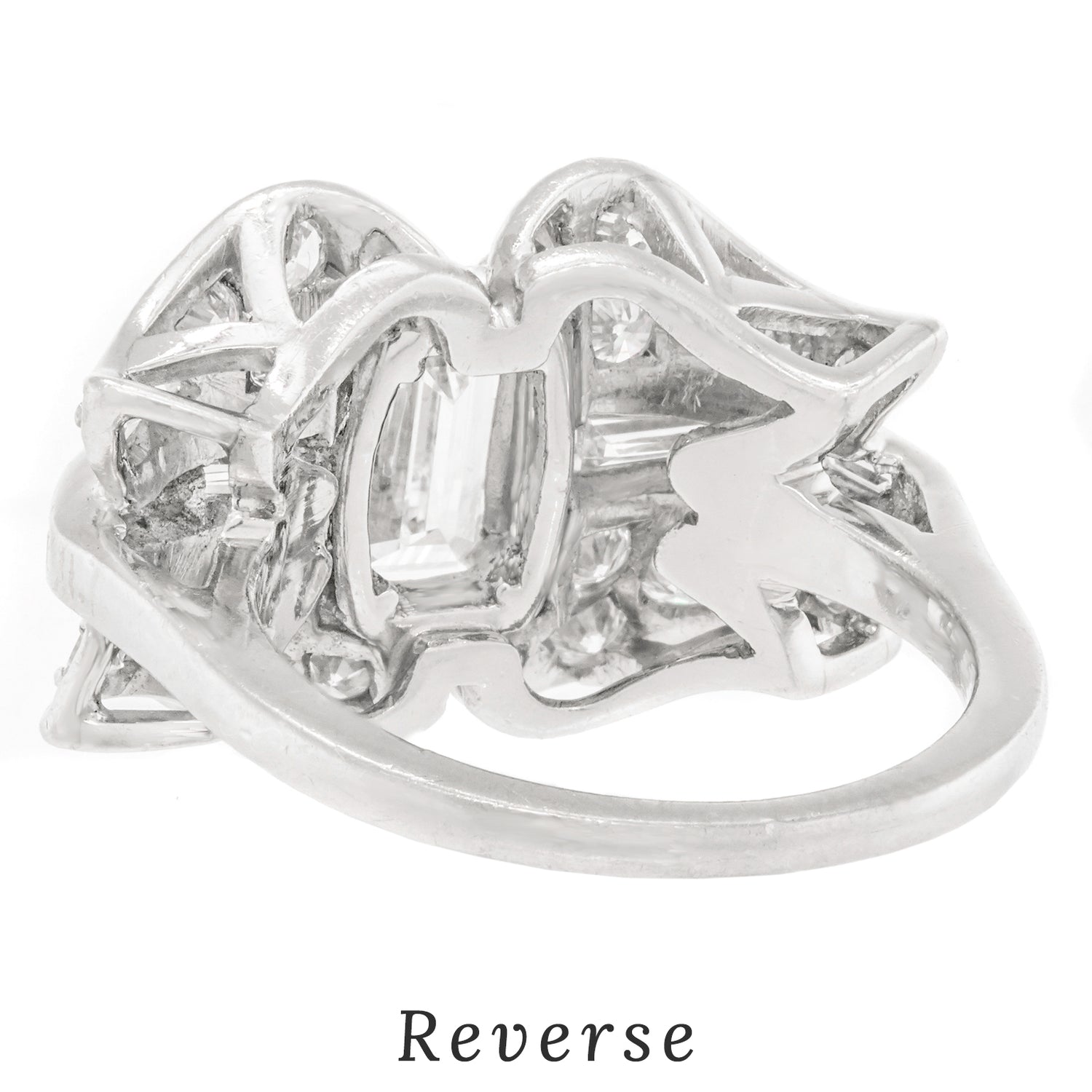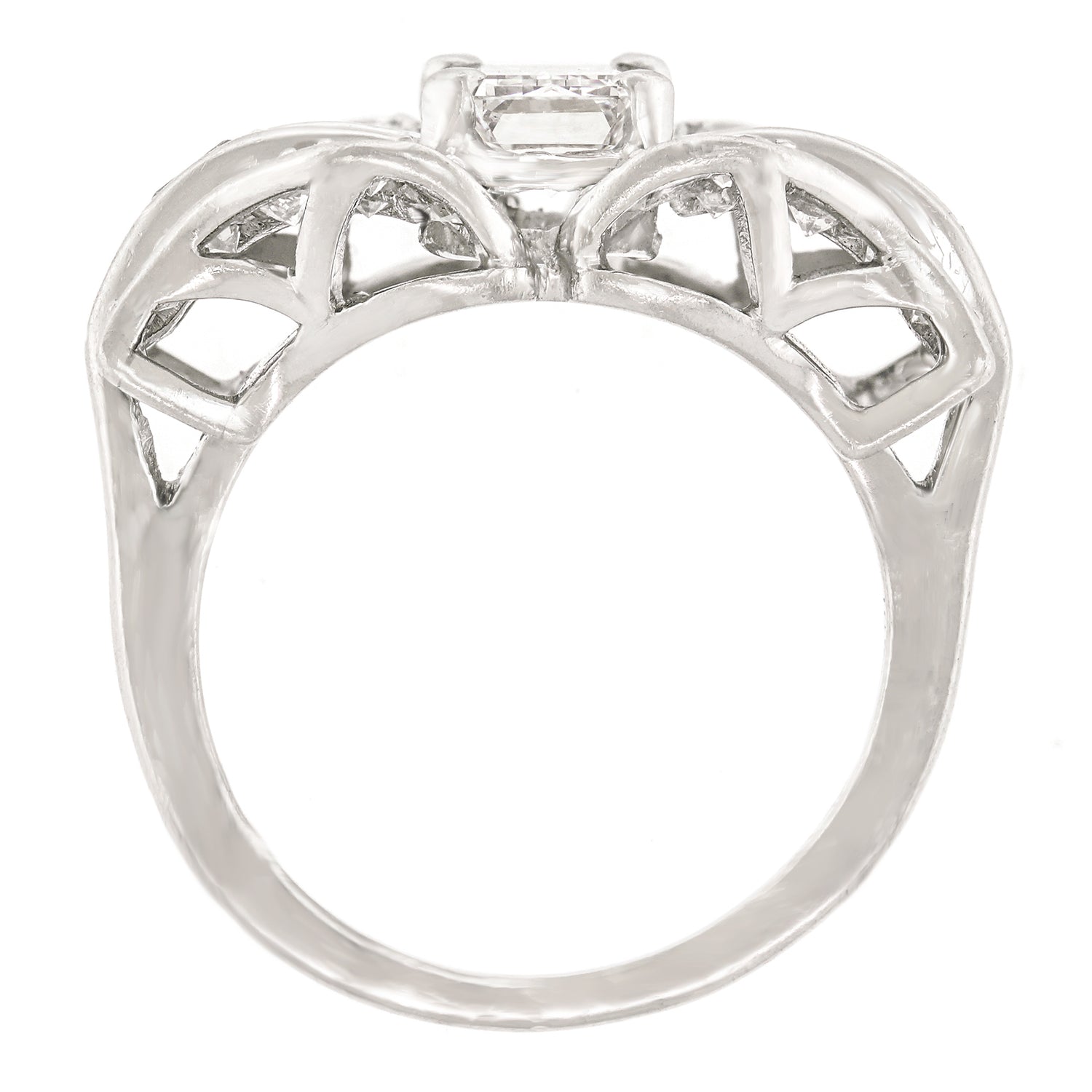 Circa 1920s, Platinum, American. This spectacular Art Deco cocktail ring features very white, very sparkly diamonds! Diamonds! Diamonds! …did anyone say it's all about the diamonds? Redolent of ribbon motifs, the curvilinear flow of platinum and round diamonds is juxtaposed by a crisp .85-carat emerald cut diamond (G color, VS clarity). As one would expect of fine twenties platinum jewelry, the fabrication is meticulous, and the quality obvious. Excellent condition.