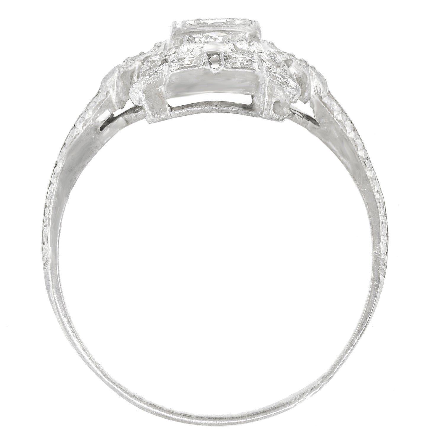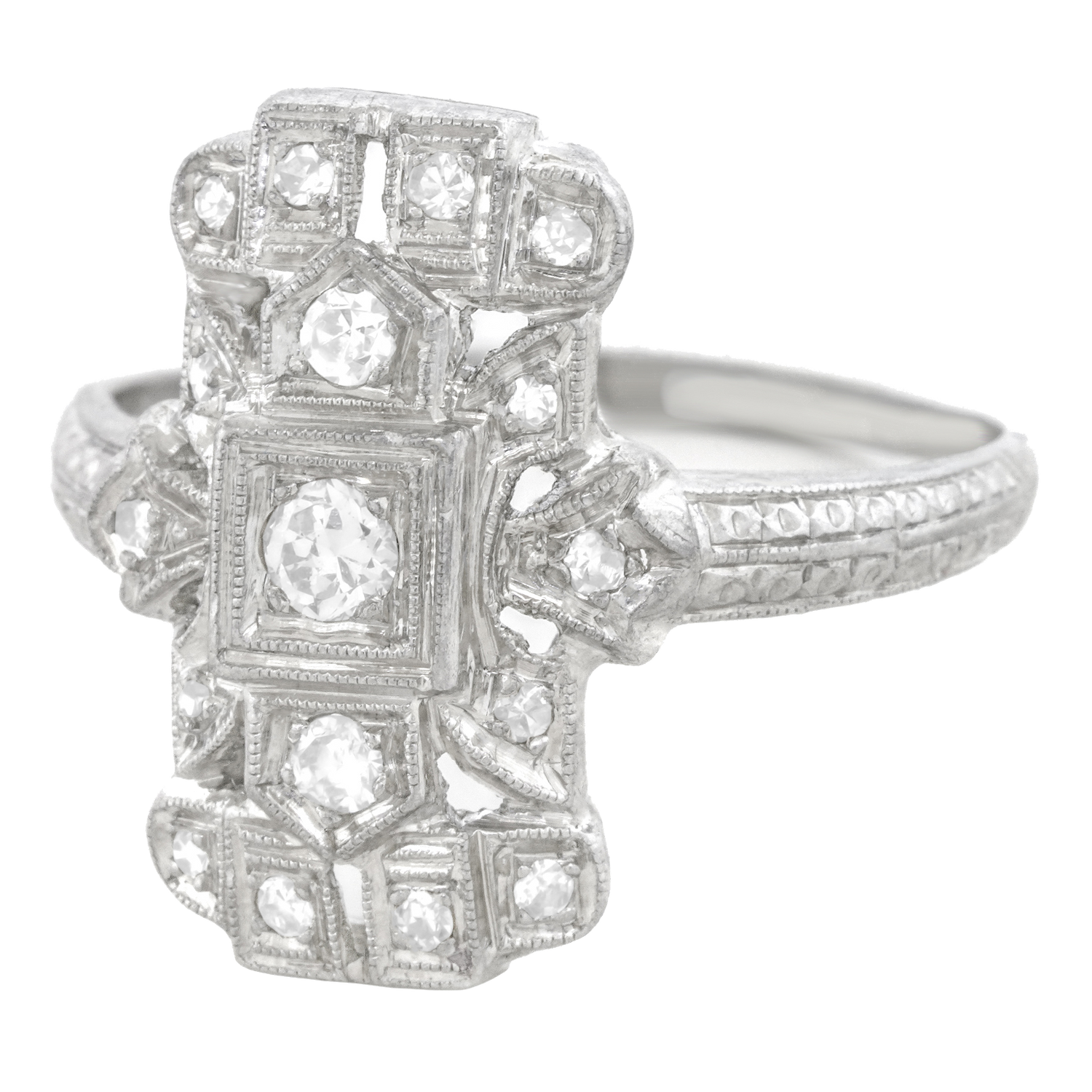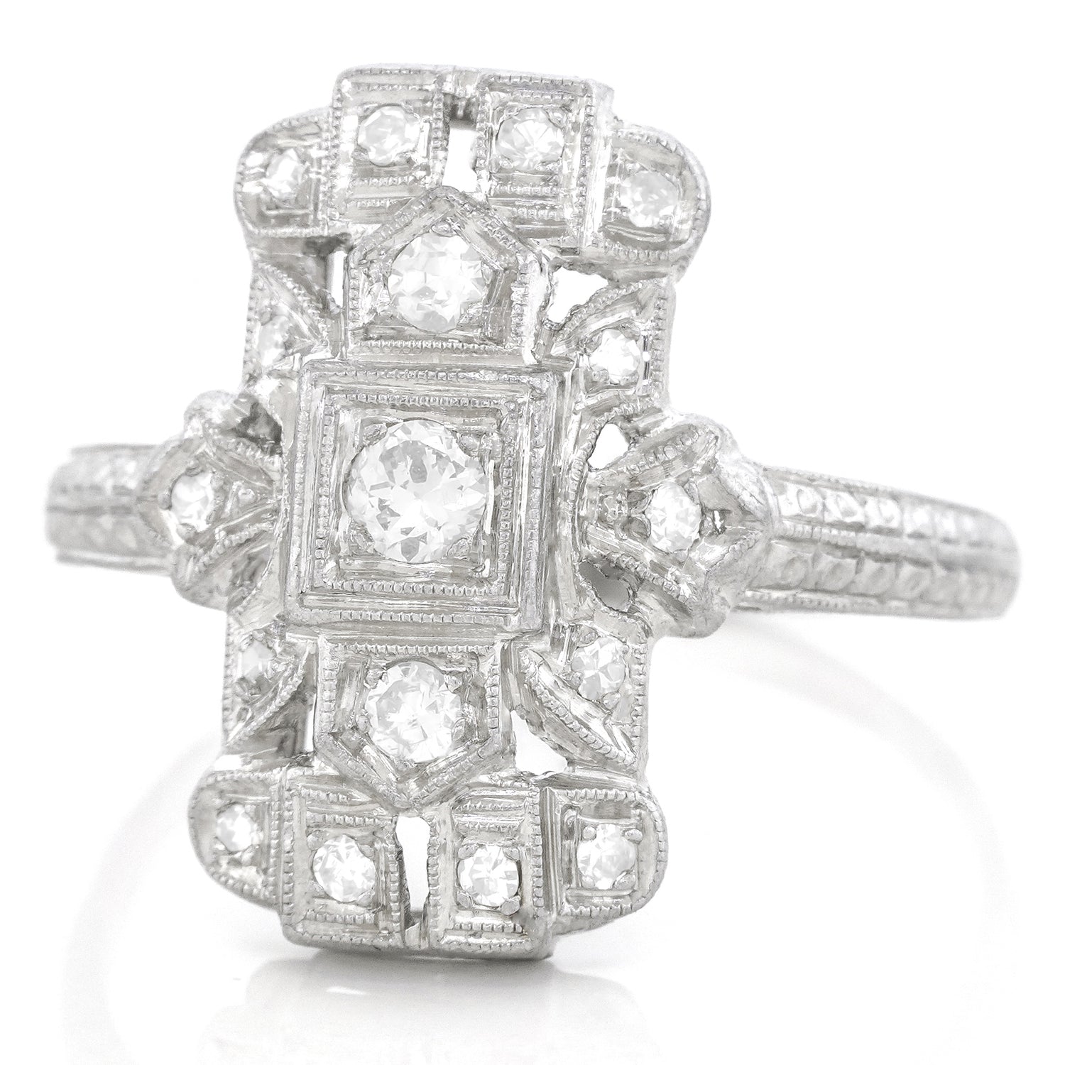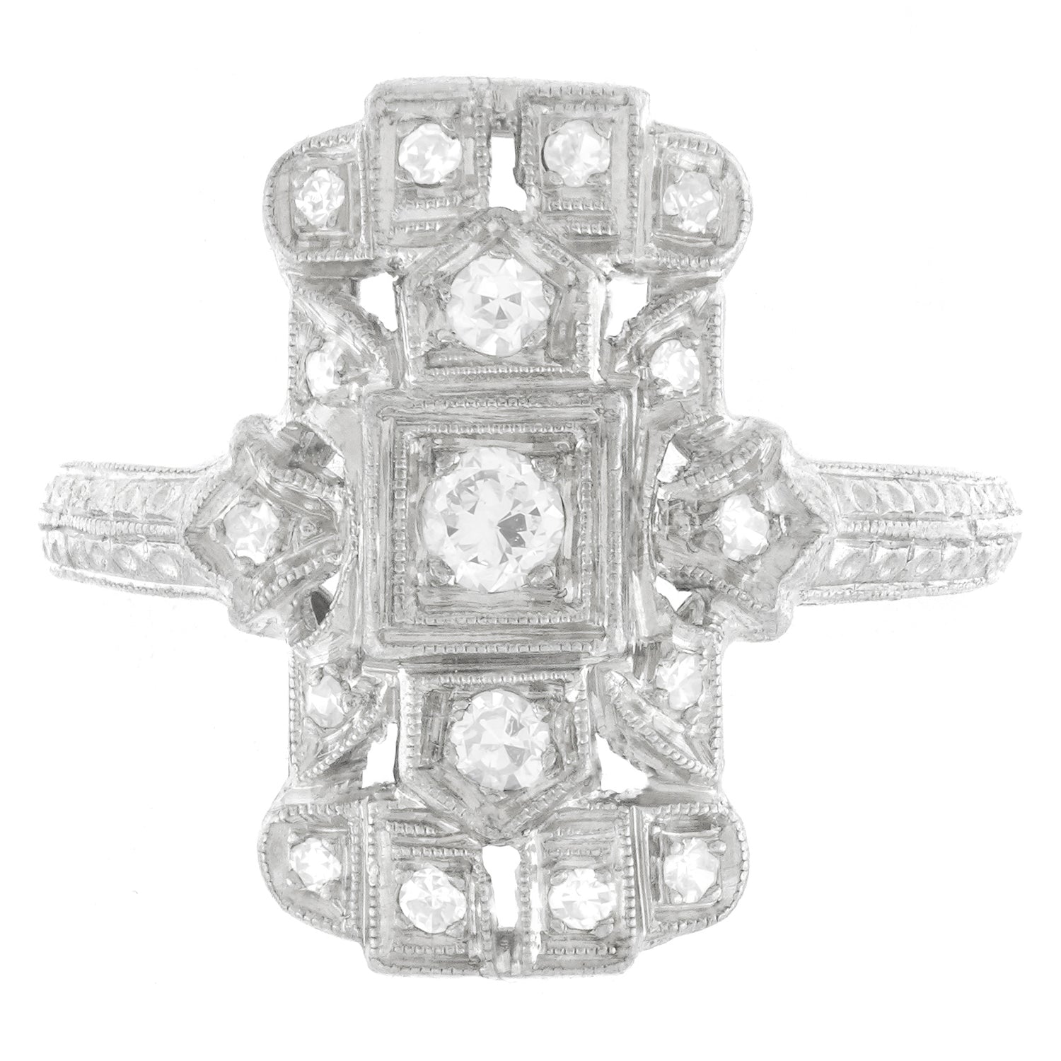 Circa 1920s, Platinum, American. Set with .40 carats of brilliant white diamonds (H-I color, VS clarity), this chic Art Deco ring features meticulously hand-fabricated geometric motifs. Flawless for every day, it is finely fashioned and in excellent condition.