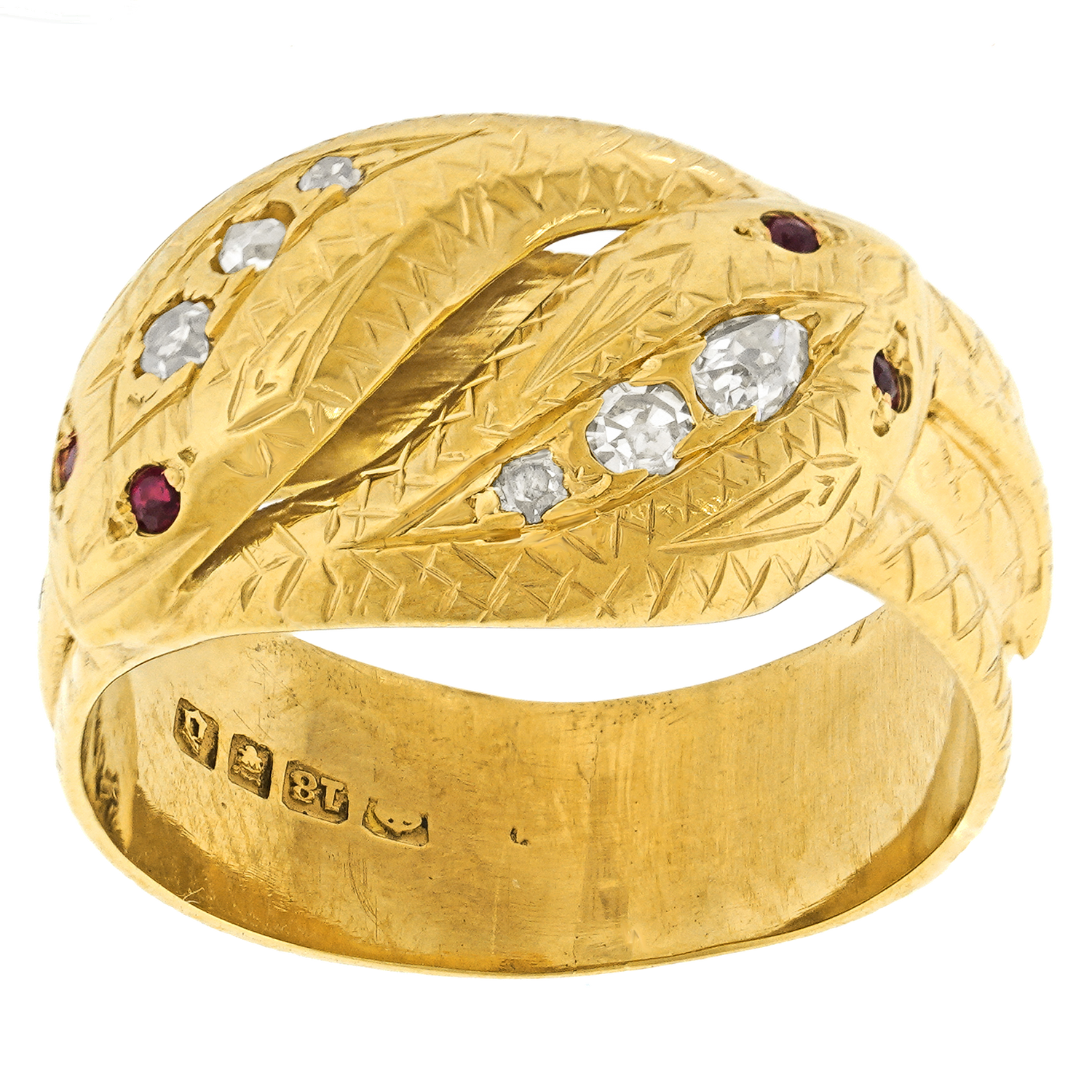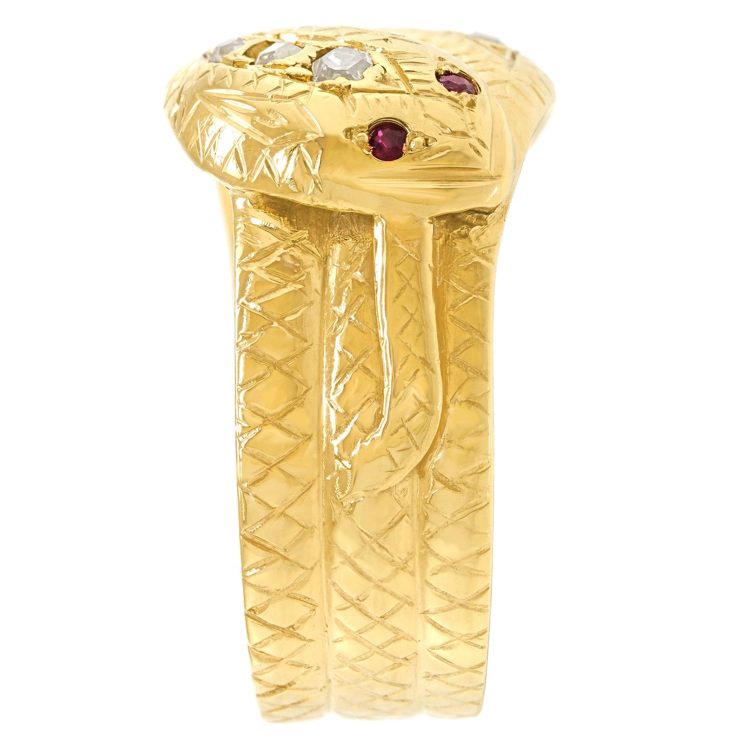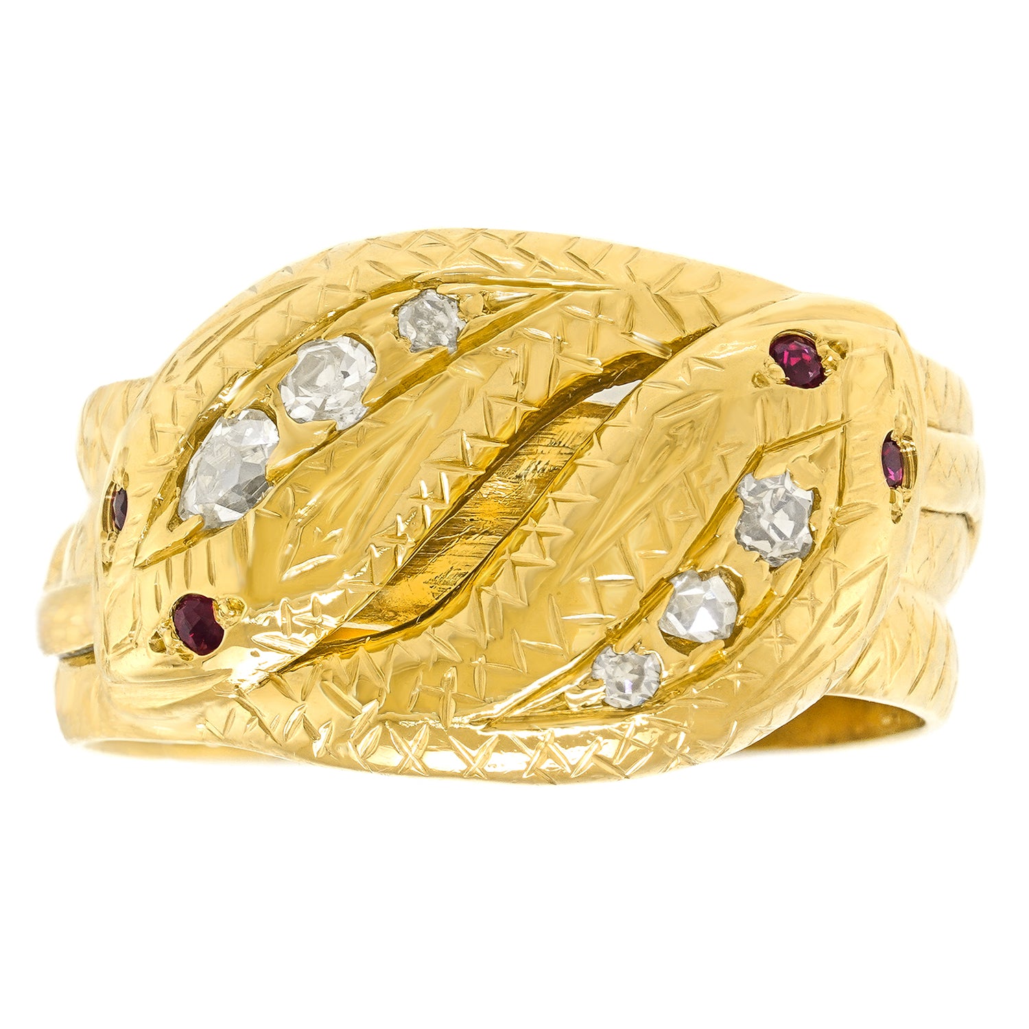 Circa 1929, 18k, London, England. The double snake rings speak of "the two of us", and traditionally signal fidelity, friendship, and trust. Featuring a sleek design underscored by .22 carats of fine diamonds, the look is "jewel of the ancients." Stylish, mystical, soulful, and easy to wear. This charming ring is in excellent condition.
